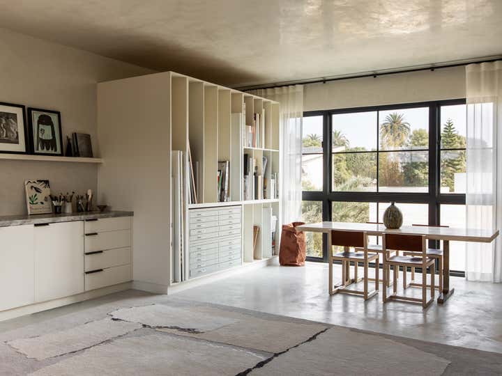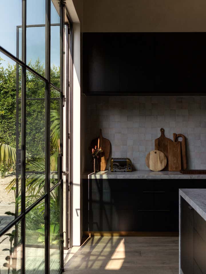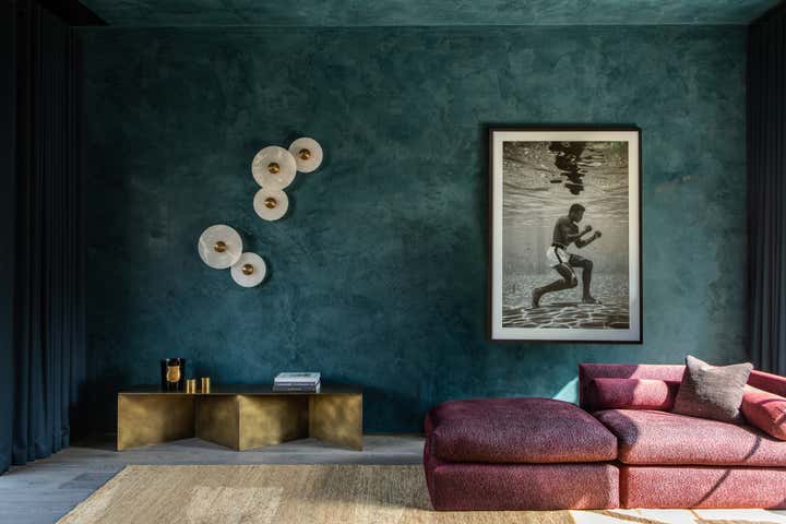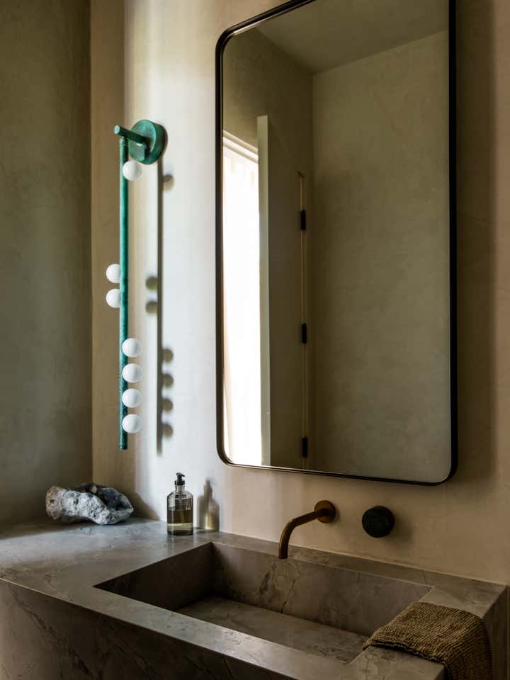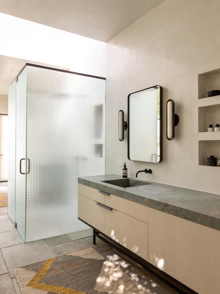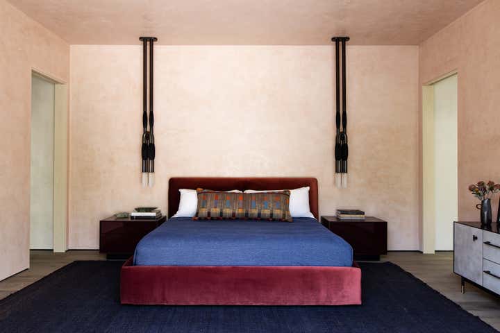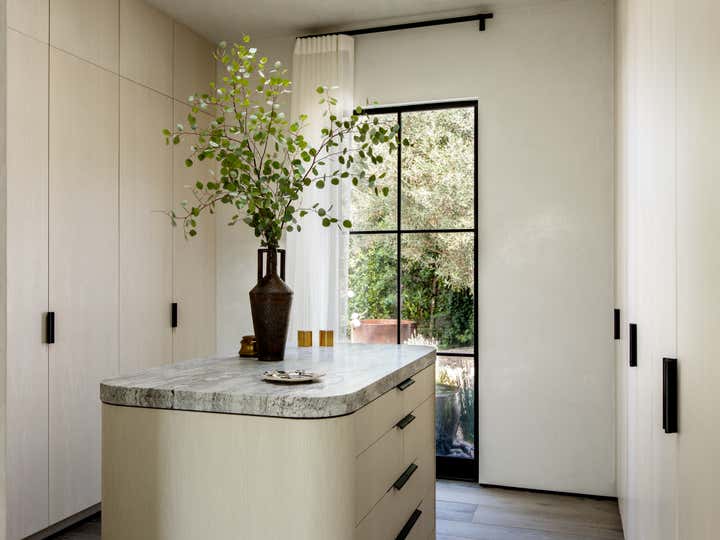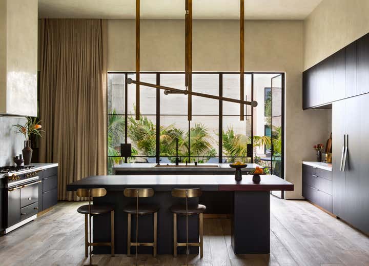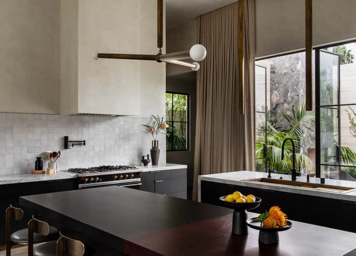 The home s layout drew from Hacienda-style architecture and modern family compound designs, connecting interior and exterior spaces with gardens and abundant light. The property features architectural cornerstones, limestone, and vein-cut travertine finishes, as well as custom steel windows framing picturesque views. Warm plaster finishes and vibrant touches of turquoise complement the verdant landscape by Terremoto, creating a lush retreat.