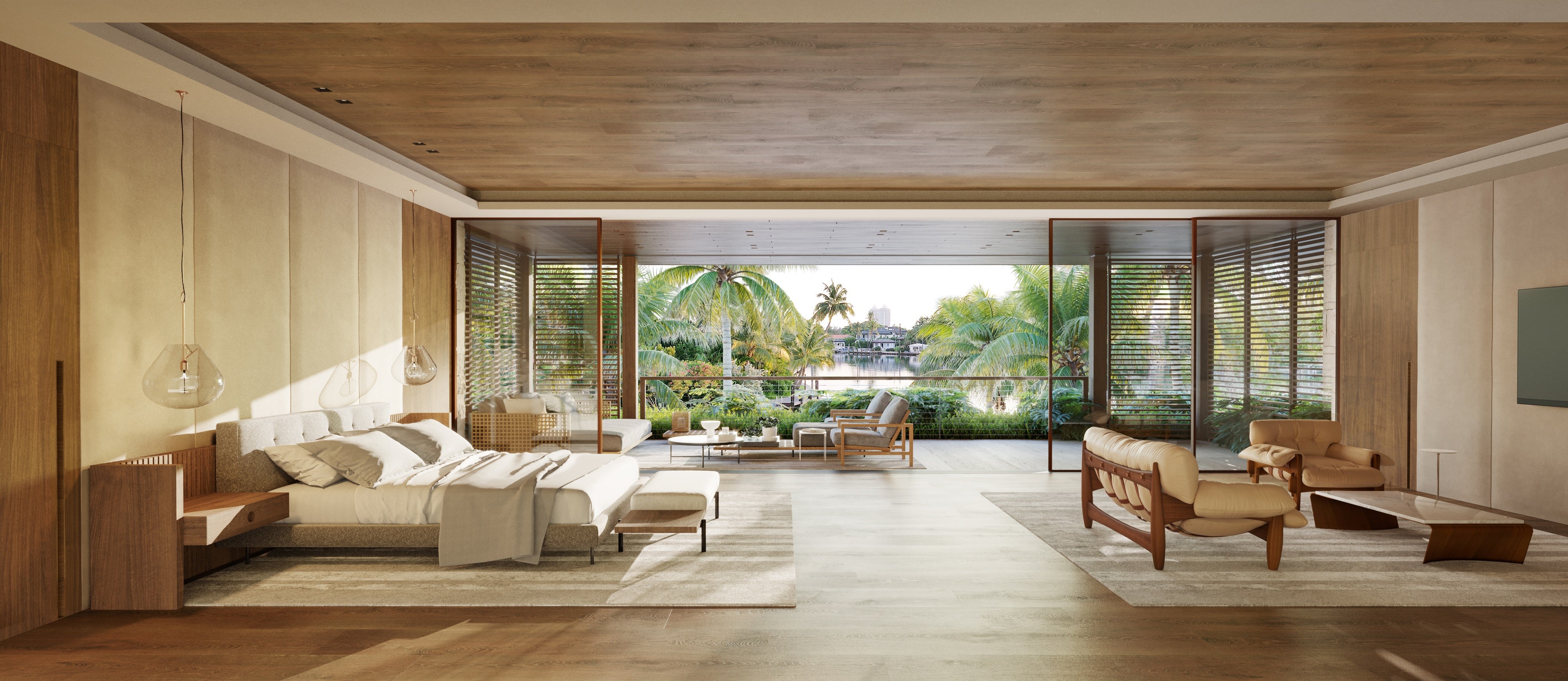 The expansive primary suite spans the home s width. Wide wood planks on floor and ceiling, a Minotti bed framed by suede panels, and airy glass pendants create a serene retreat. A cozy lounge area with Sergio Rodrigues seating adds intimacy. The spa-like bathroom features silver and black travertine, a floating glass shower, and a sculptural tub.