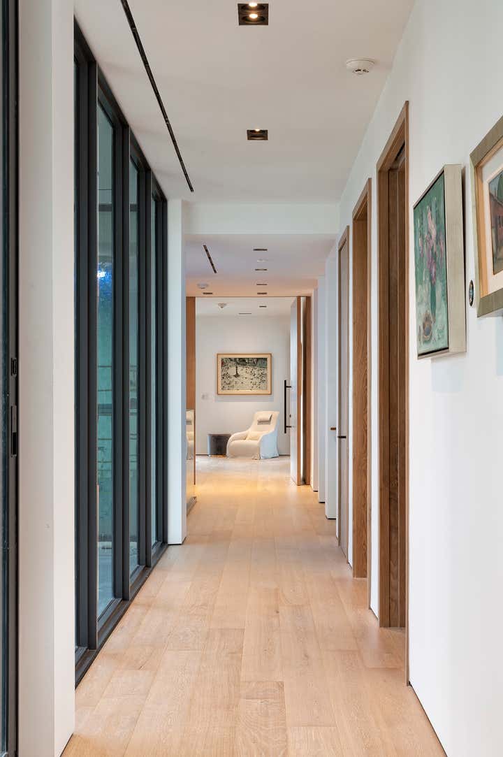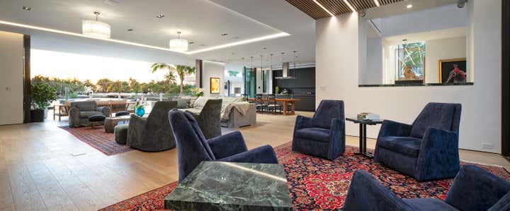 Inside, the homeowner s unique water feature designed by a local Miami artist with a Swarovski Crystal Chandelier steals one s attention. Each bathroom is outfitted in custom marble and unlacquered brass Vola fixtures. Exposed concrete, a renowned art collection, local custom millwork, and a custom wine room with a glass feature wall make for a stunning interior.