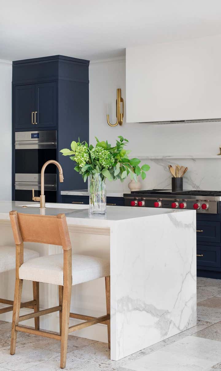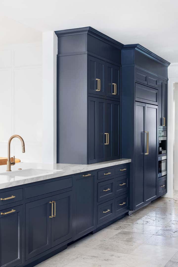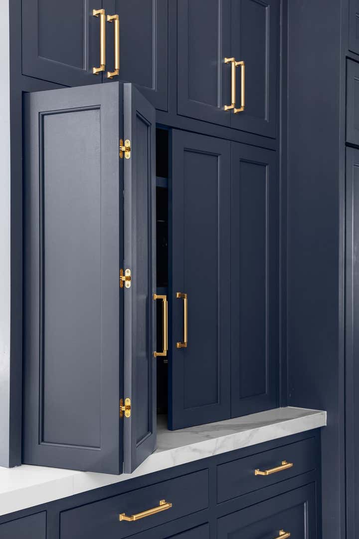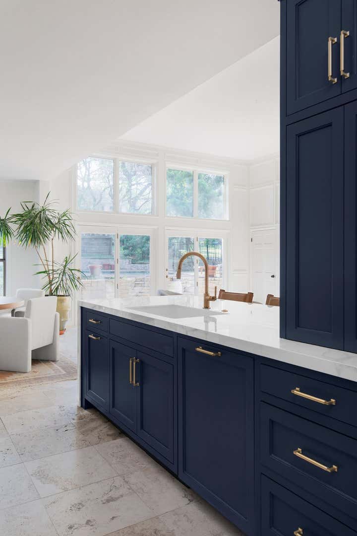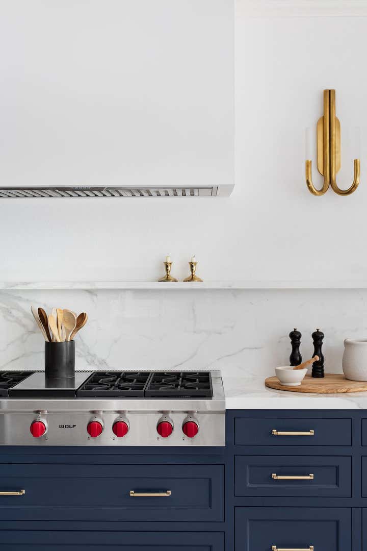 This kitchen project was such a fun one to work on! Our client wanted a standout kitchen and the beautiful blue cabinetry did just that! We had so much fun with the bold choice of color. Laura worked with the client to create a kitchen that went seamlessly with their existing flooring and flowed well into their living space. The brass hardware brings charm into this modern space and we couldn’t love it more!