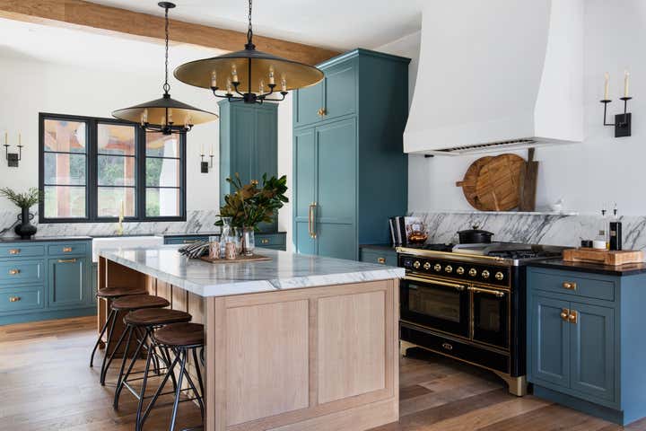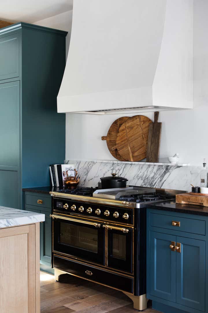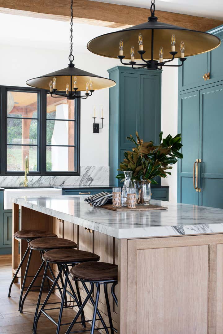 Working with clients who wanted to bring a bit of an English flair to their heart-of-Texas home, we knew from the get-go that this would be a special project. We designed and acted as general contractor for this project, pairing unique cabinet colors, stunning hardware, custom cabinetry, and marble counters to create a space with an atmosphere that feels more collected than brand-new. Special attention was paid to selecting large-scale lighting for the island, an antique mirrored backsplash and unique appliances such as the Ilve range. The design is cohesive while still allowing each individual design element to shine.