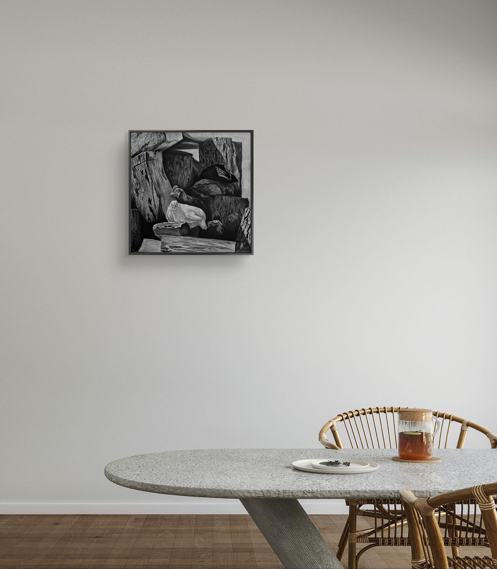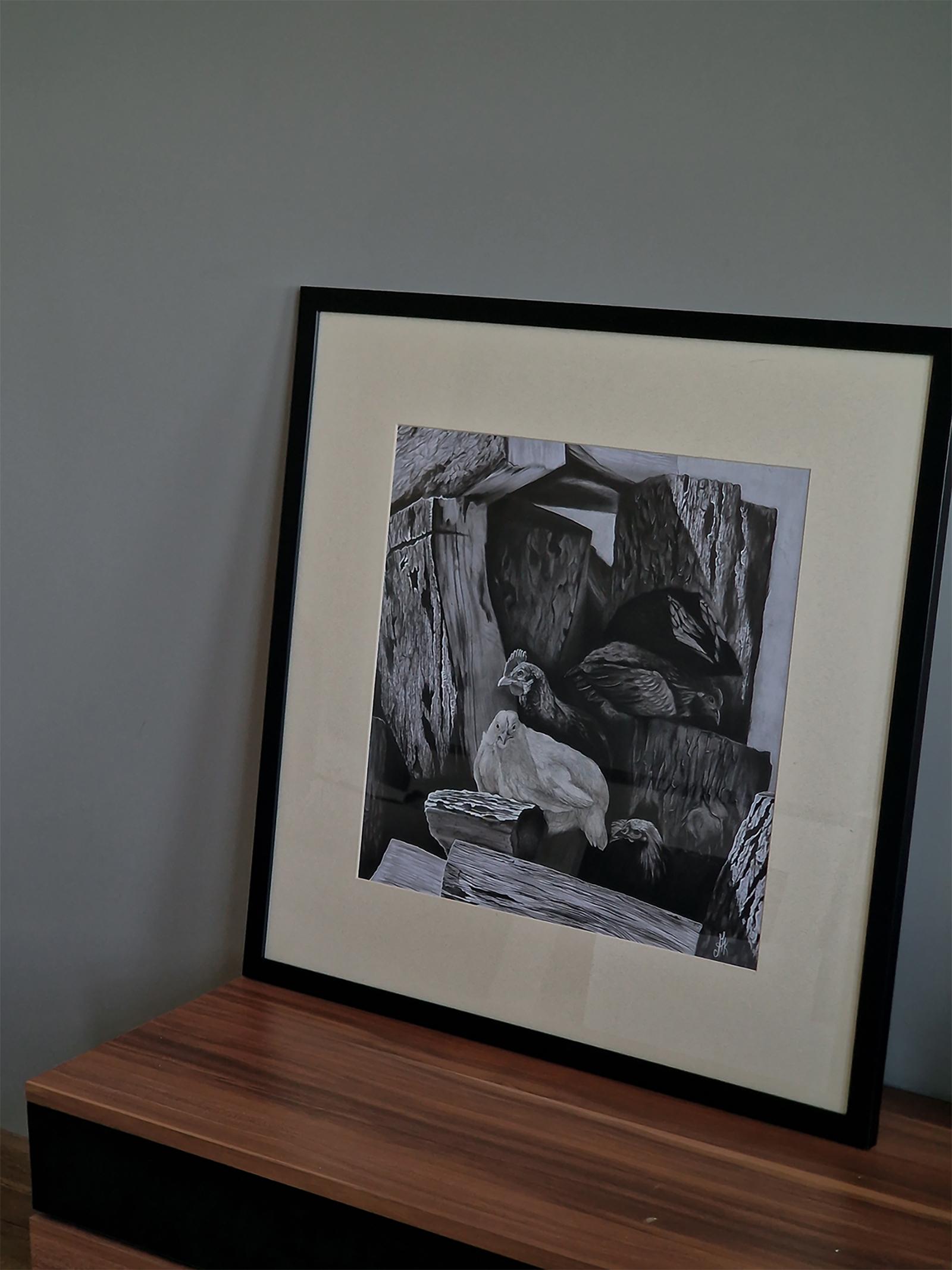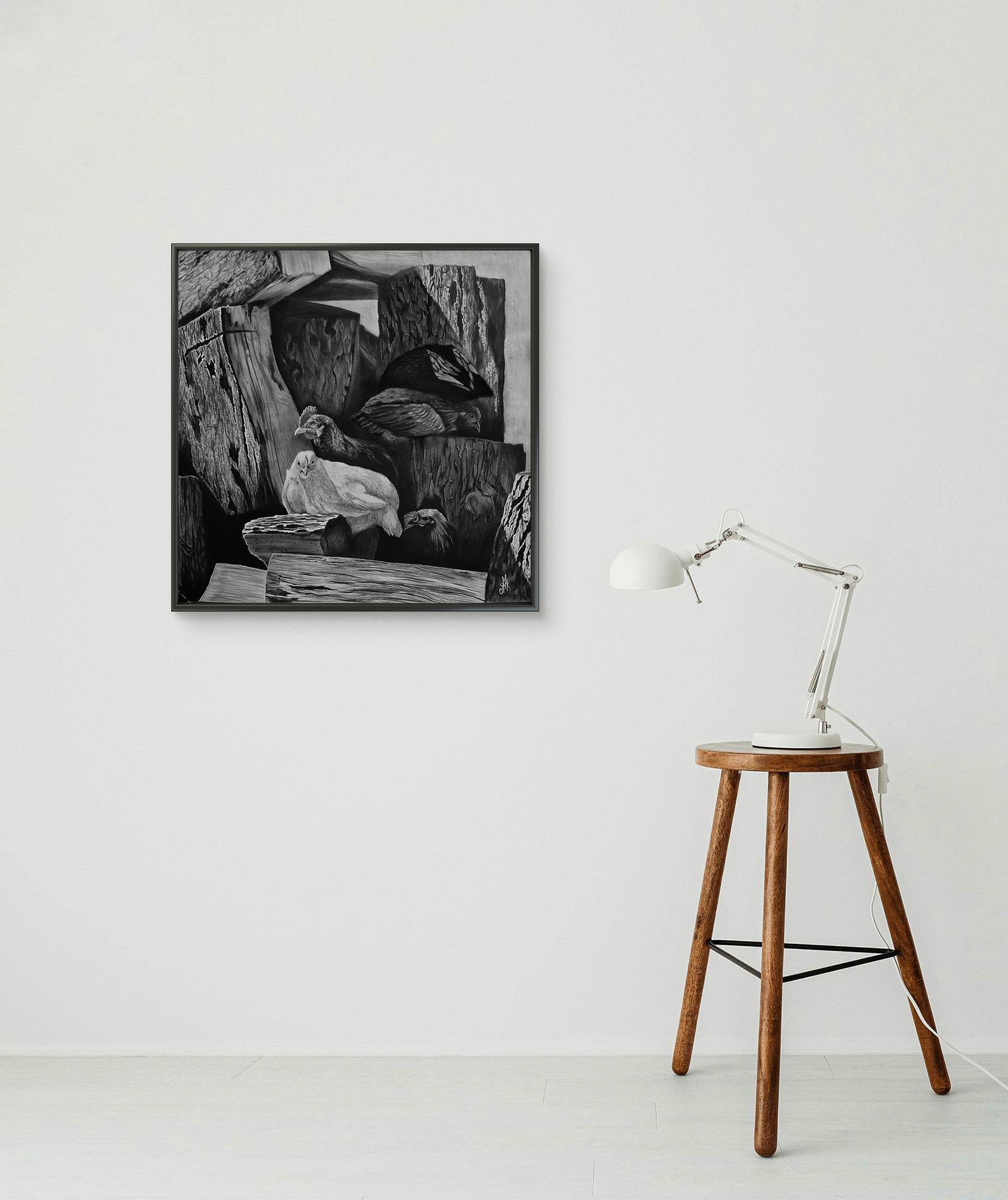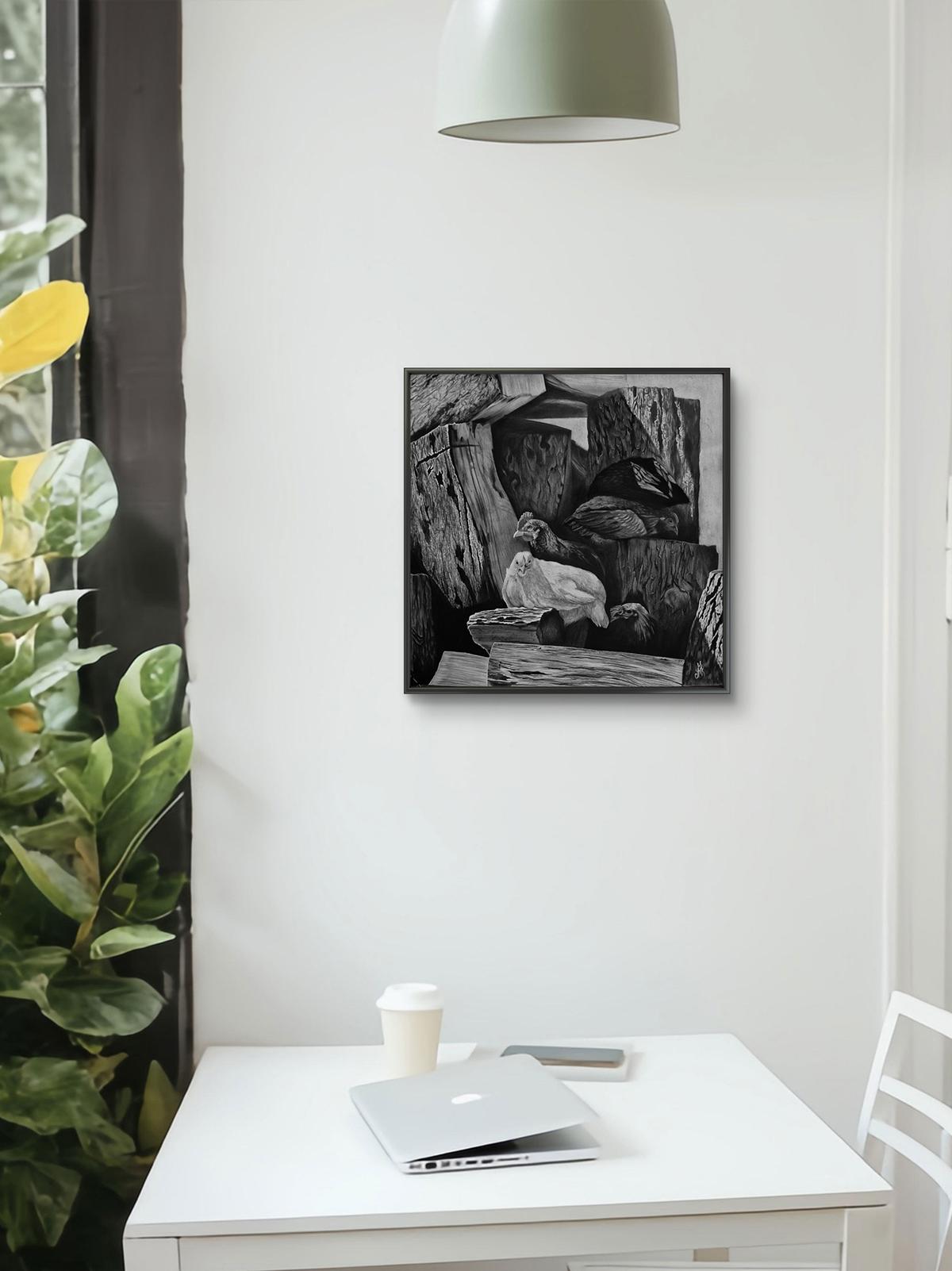 « The Providers » (2023) de Mo Myra, aquarelle originale représentant des poules