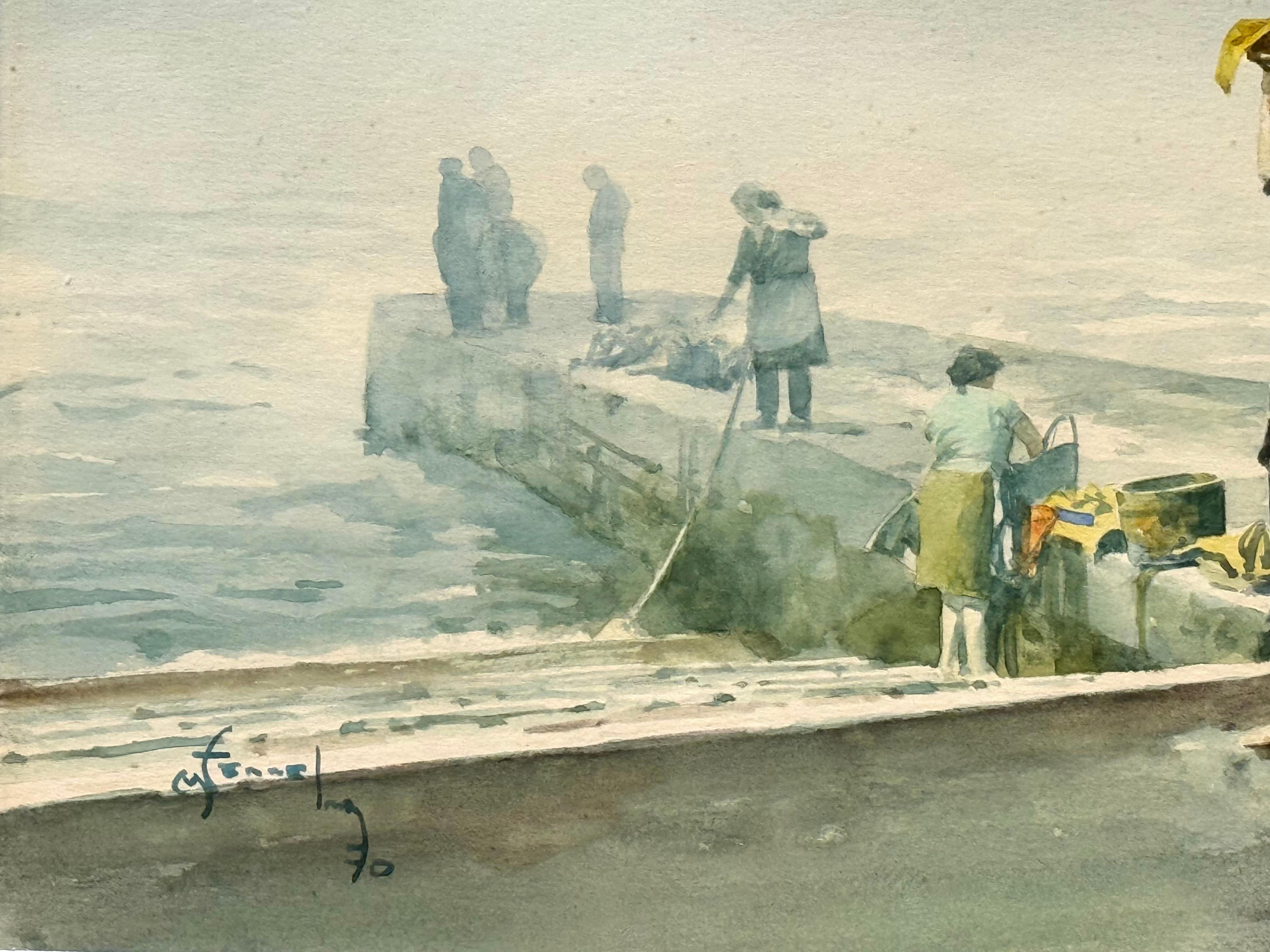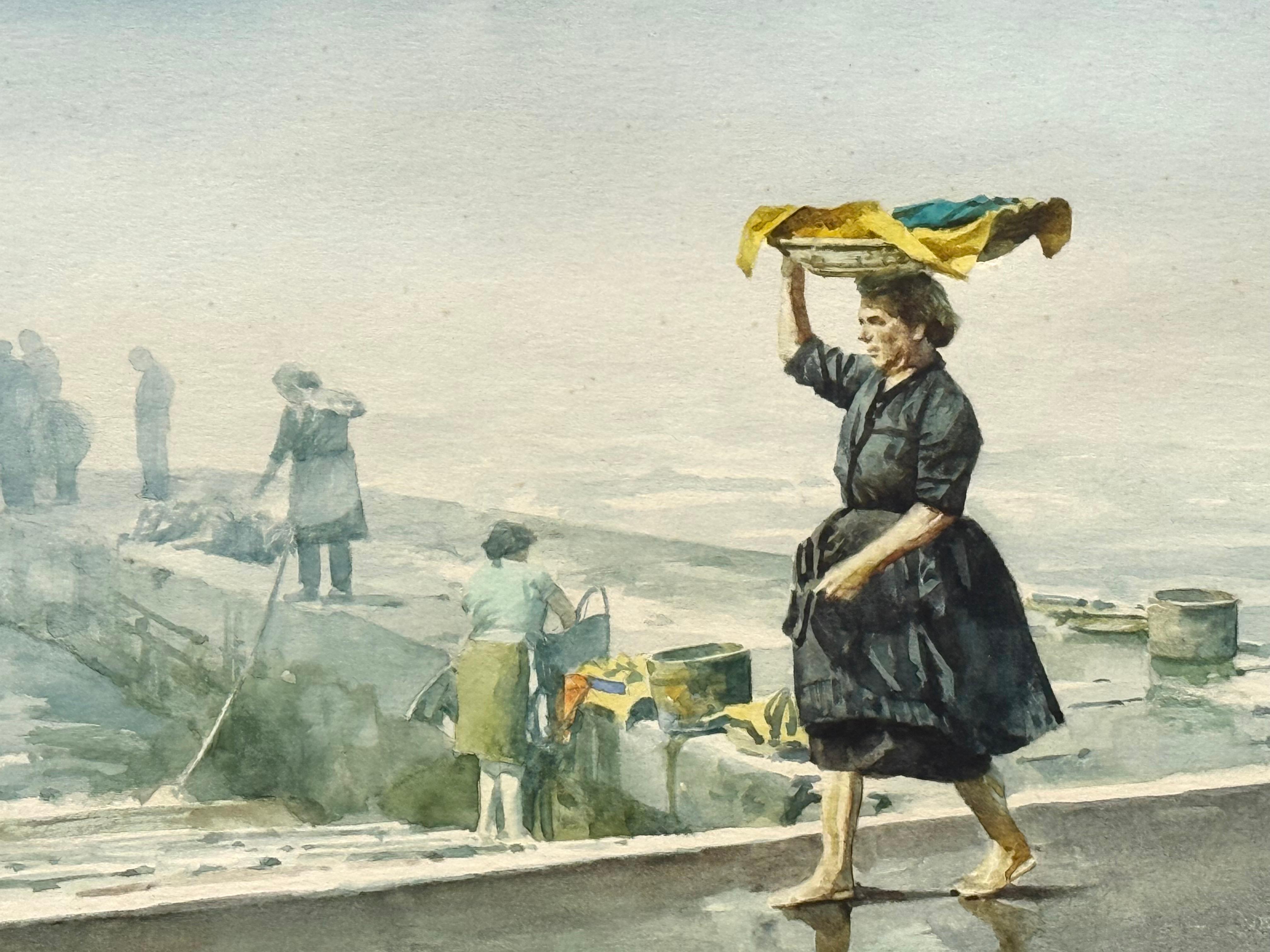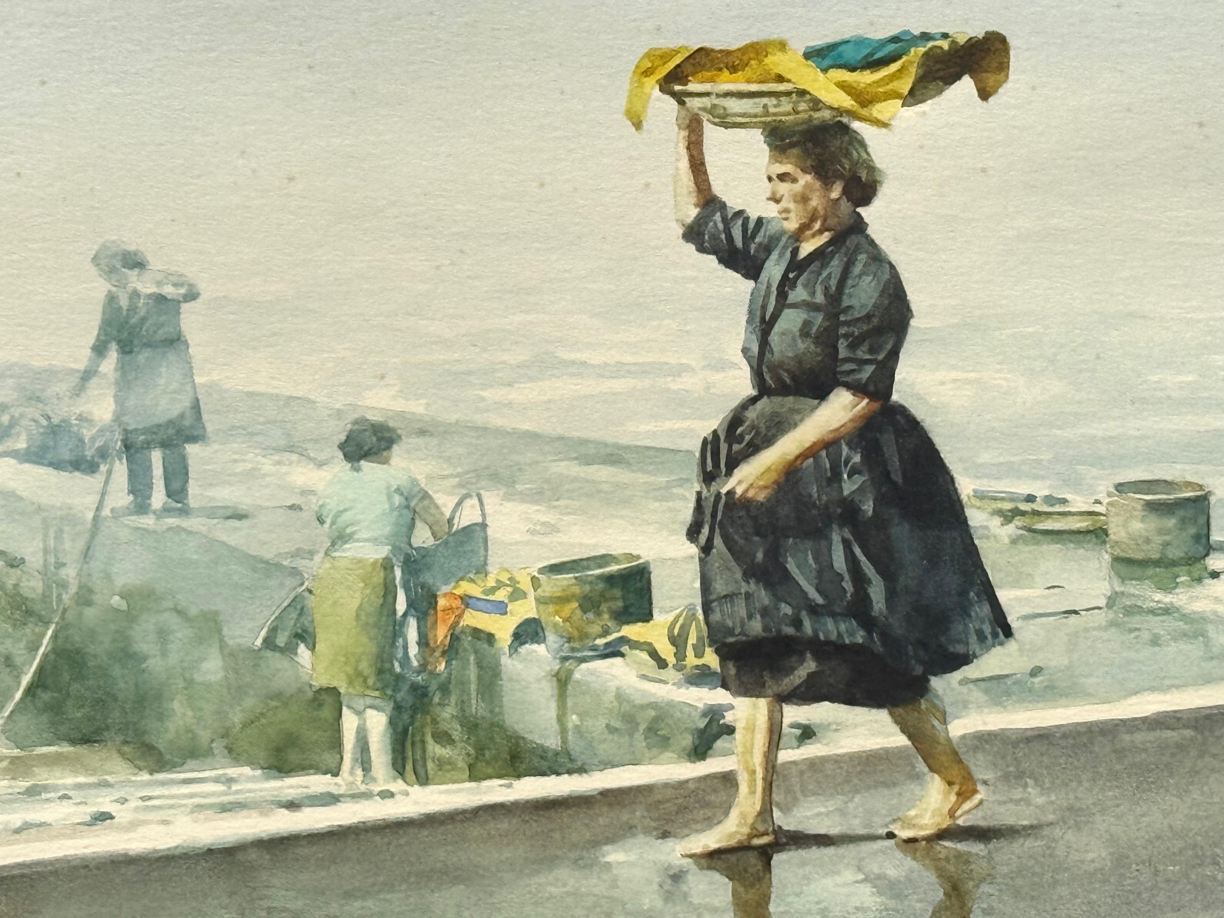Aquarelle originale sur papier d'archives représentant un groupe de villageois locaux lavant leur linge au bord de la mer. Dans un style académique. Détail important. Signé par l'artiste et daté 1970 en bas à gauche. D'après les archives des ventes aux enchères précédentes, l'artiste a été identifiée comme étant l'artiste britannique I.L.A.. Actif dans les années 1960 et 1970. La scène se déroule très probablement au Portugal. L'état est excellent. Sous verre. L'ensemble est encadré dans un cadre fin à la feuille d'or de 16,25 x 20,75 pouces. Provenance : Un collectionneur de Sarasota, en Floride.