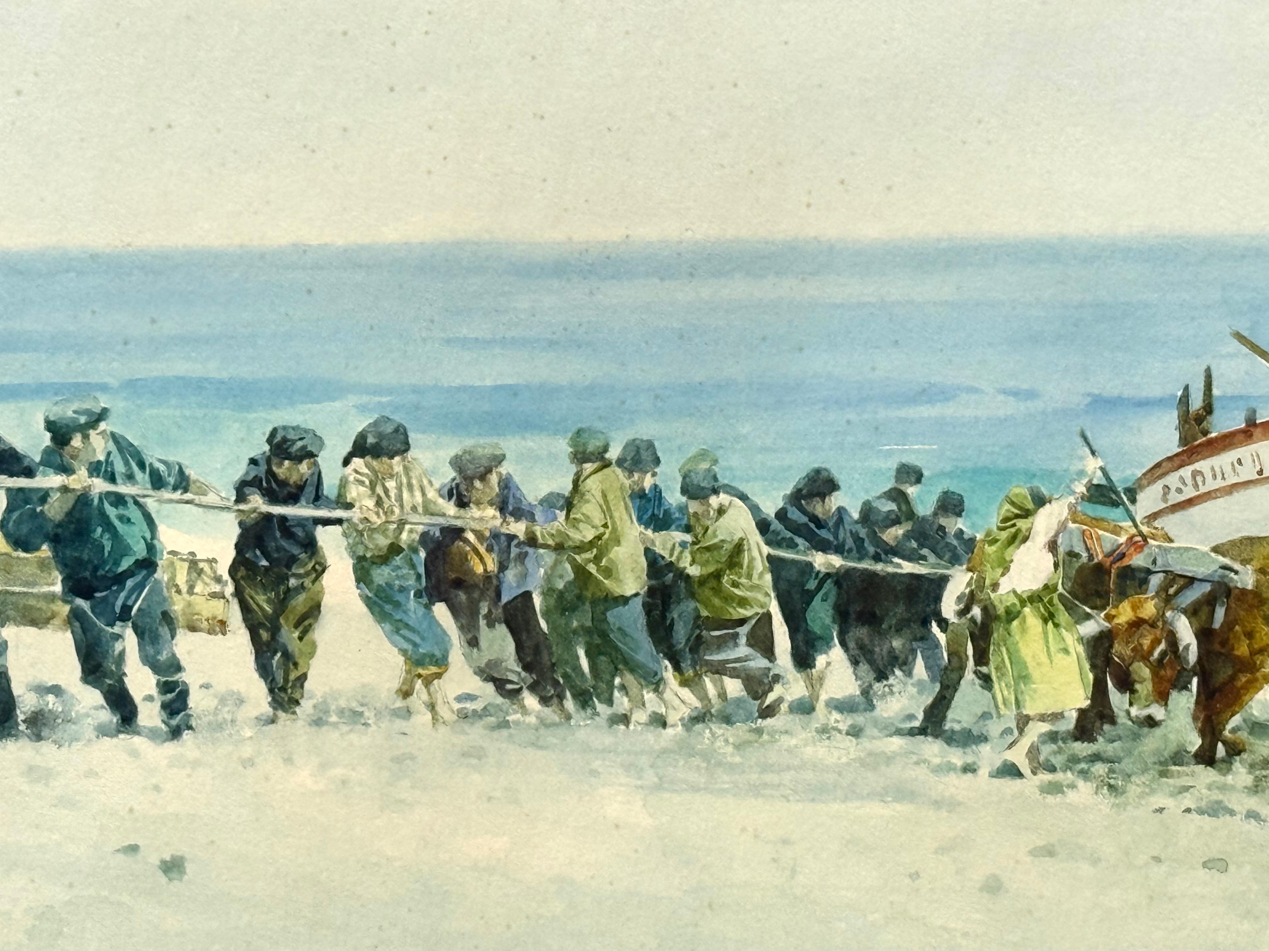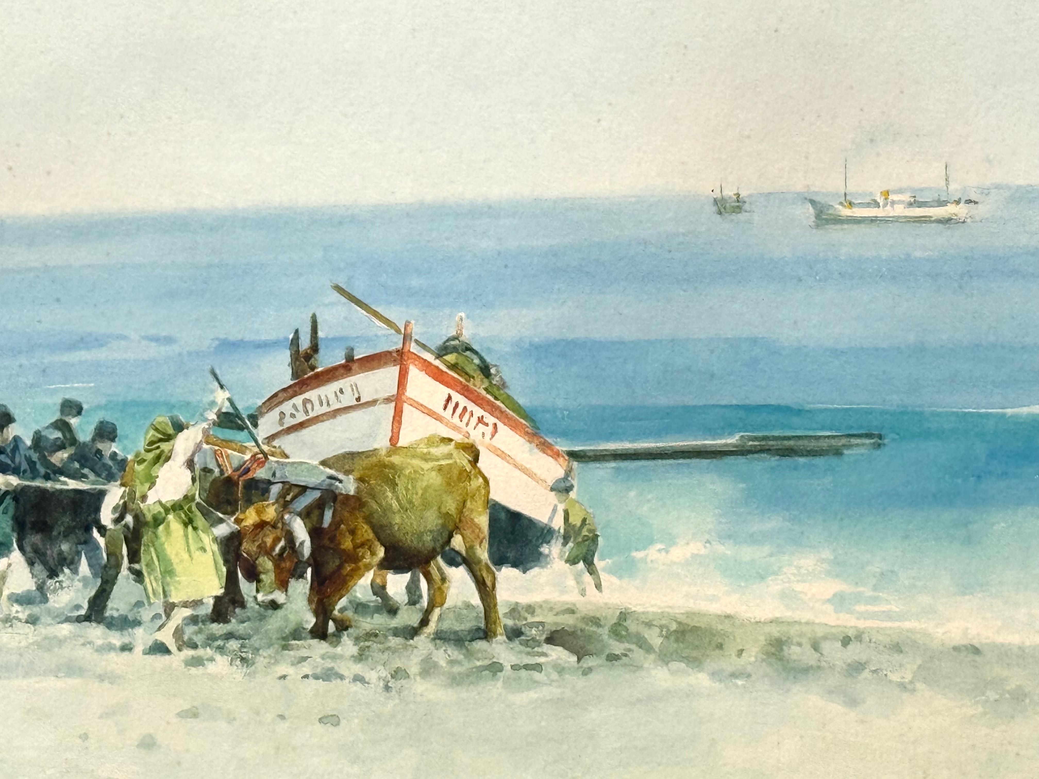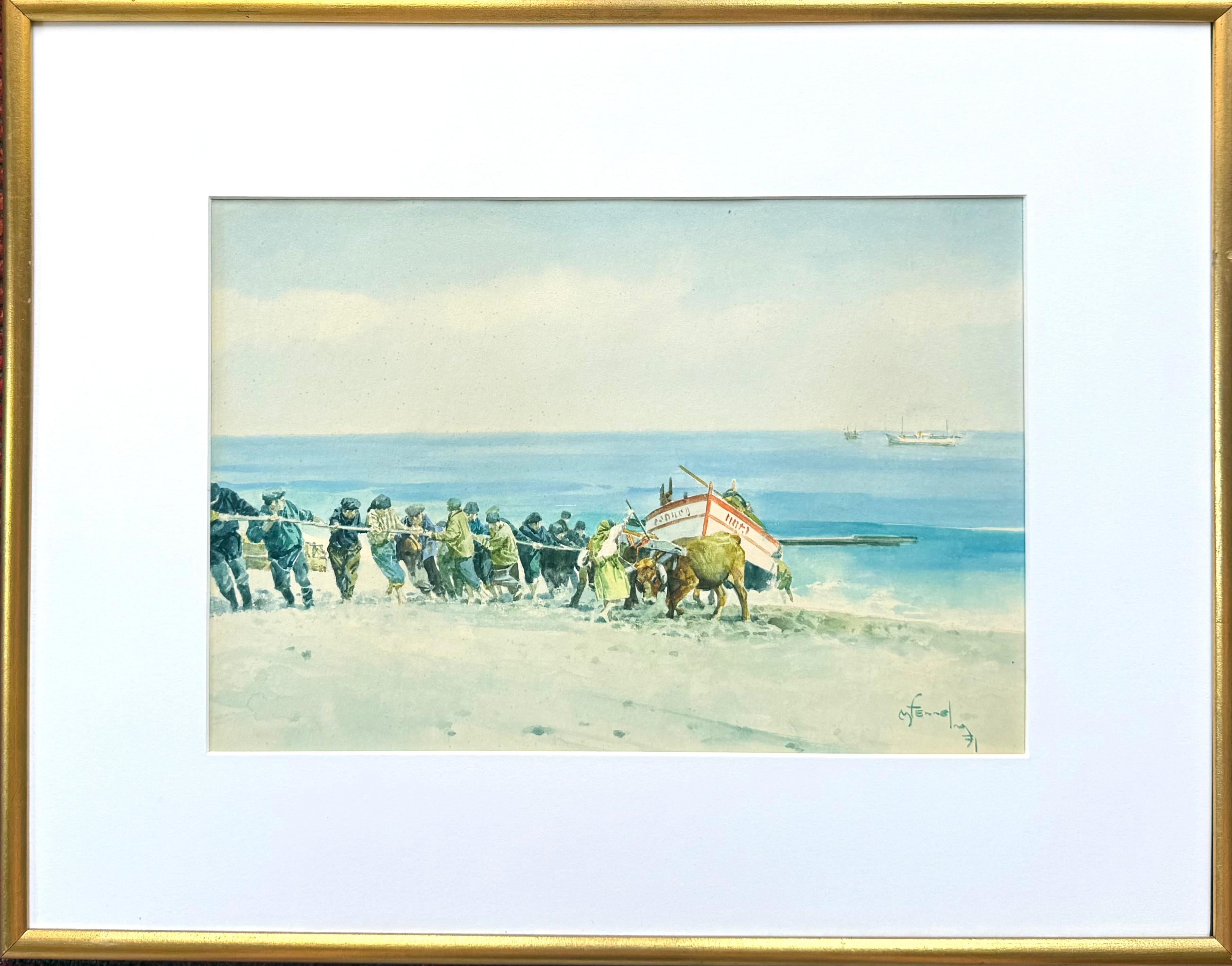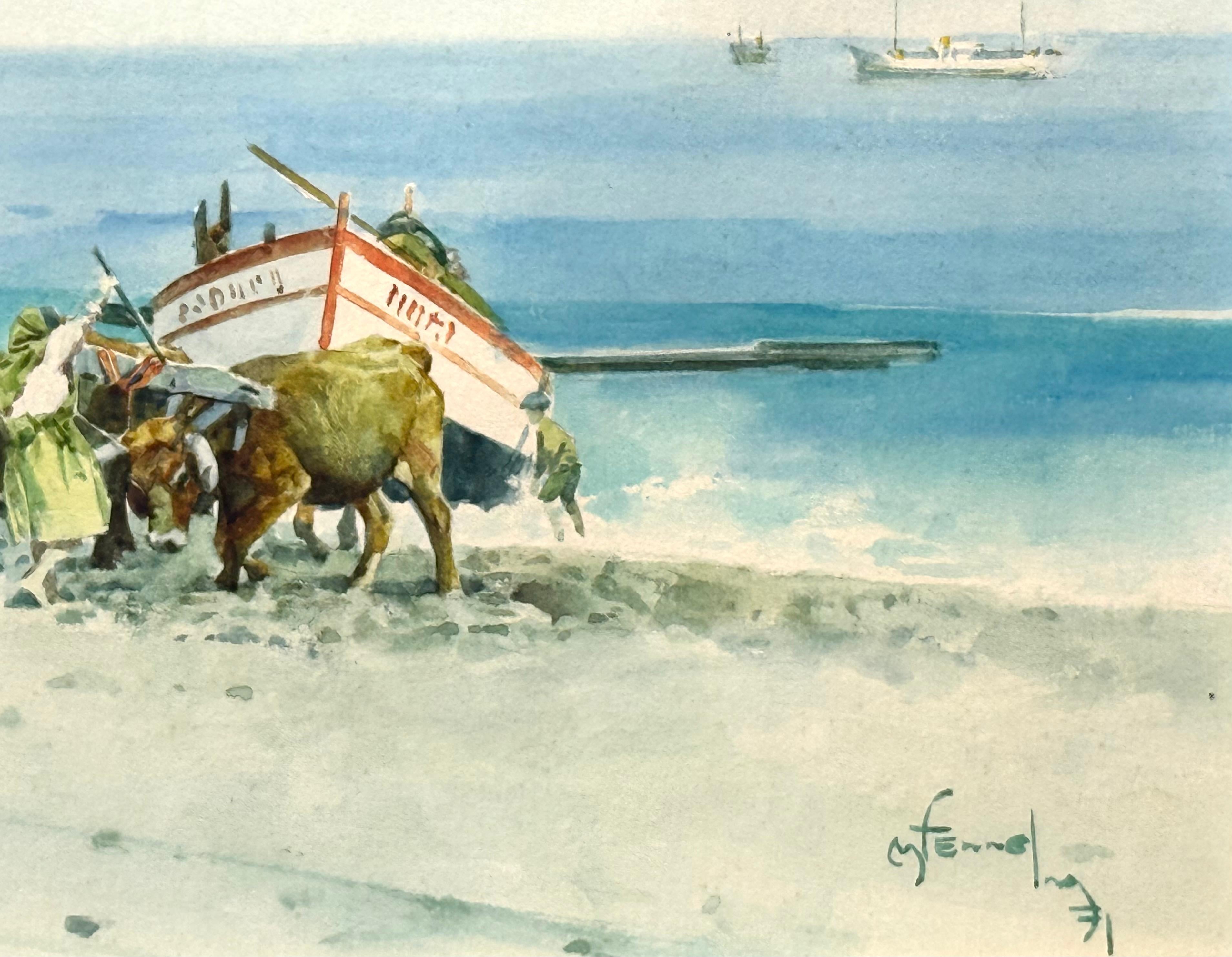 Aquarelle originale sur papier d'archives représentant un bateau de pêche tiré sur la plage par une équipe d'animaux et de villageois. Dans un style académique. Signé par l'artiste et daté 1971 en bas à droite. D'après les archives des ventes aux enchères précédentes, l'artiste a été identifiée comme étant l'artiste britannique I.L.A.. Actif dans les années 1960 et 1970. La scène se déroule très probablement au Portugal. L'état est excellent. Sous verre. L'ensemble est encadré dans un cadre fin à la feuille d'or de 16,25 x 20,75 pouces. Provenance : Un collectionneur de Sarasota, en Floride.