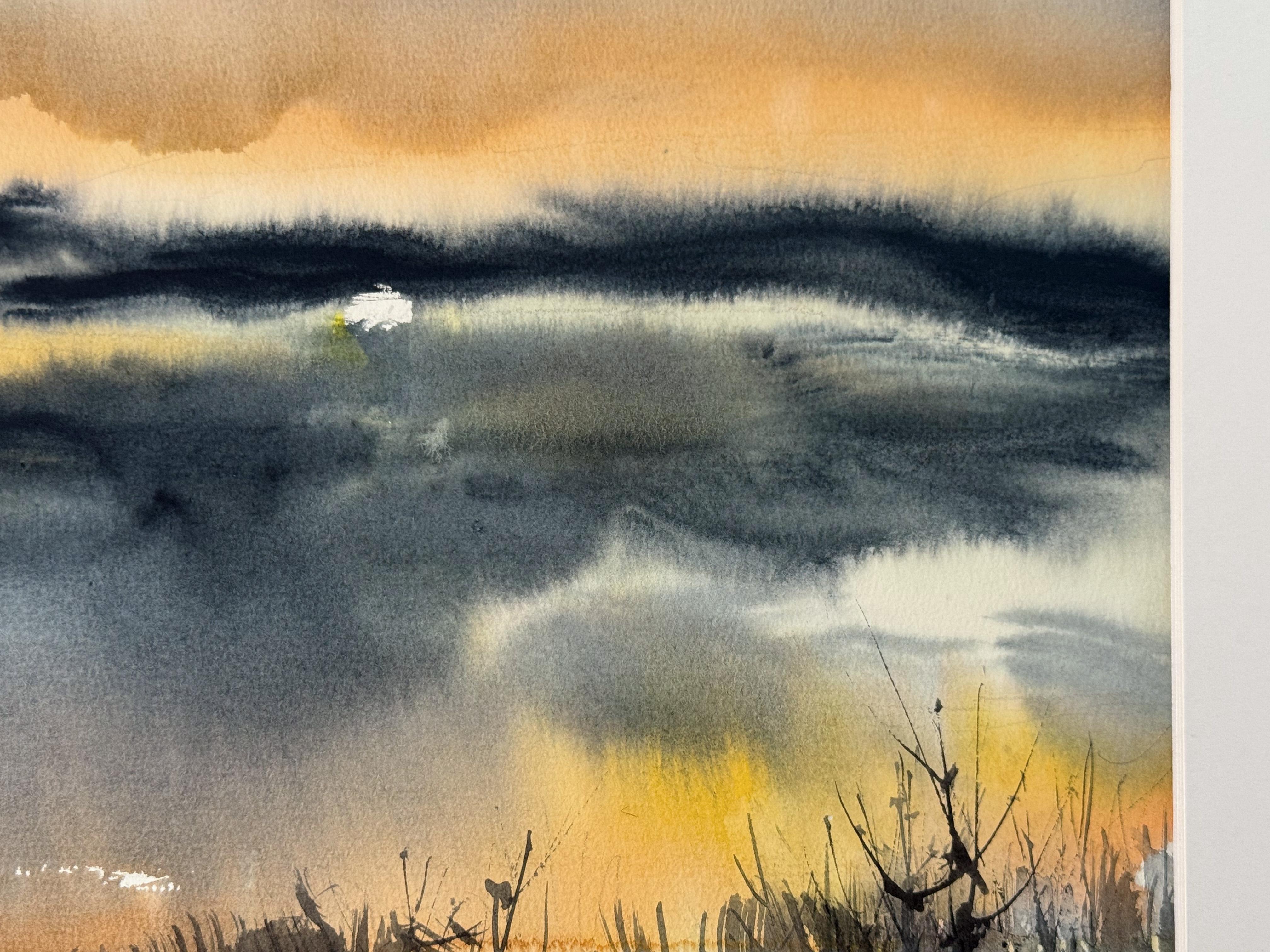 "Heavy Clouds" est un paysage dramatique et immersif exécuté à l'aquarelle, qui capture l'immense puissance et le mouvement d'un vaste ciel rencontrant un champ fertile.