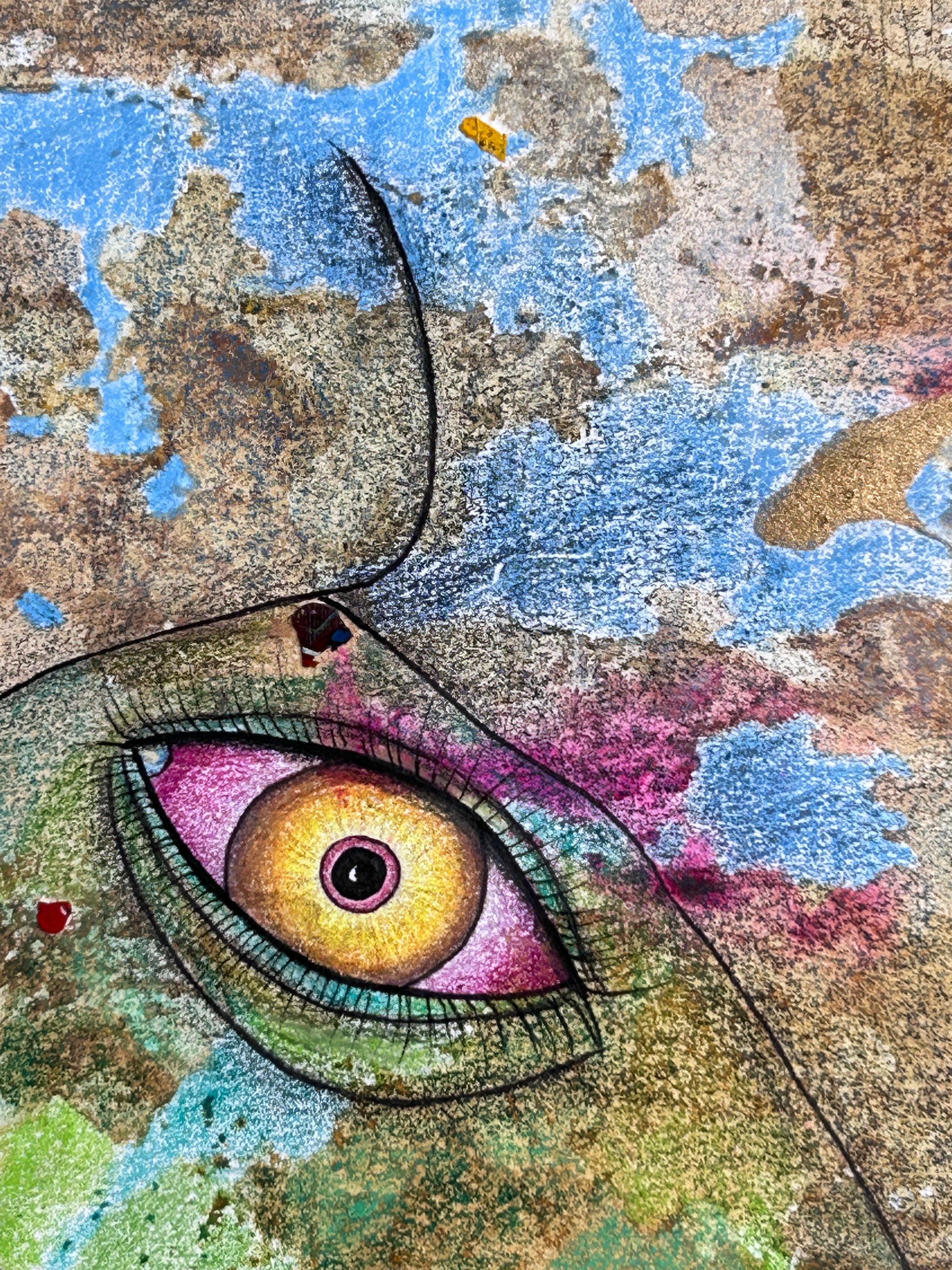 Il s'agit d'une composition qui simule un chaos contrôlé, des rencontres entre des êtres visibles et invisibles. Le fond et la première couche du dessin ont été réalisés avec des pigments de fleurs et de feuilles du jardin de l'artiste.