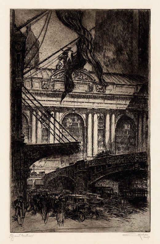 Meyerowitz, William. N.Y. L'ACIER ET LE FER. Pointe sèche, 1928. Edition de 40 exemplaires. Titré, numéroté "2/40" et signé au crayon. 12 x 9 7/8 pouces (plaque), 13 1/2 x 11 pouces ...