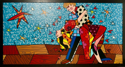 Impression sur toile d'une peinture numérique giclée en techniques mixtes, représentant un couple dansant sur un thème fantaisiste caractéristique...