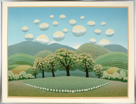 Ivan Rabuzin était un peintre naïf croate et l'un des plus éminents peintres lyriques du XXe siècle en Croatie. Pendant de nombreuses années, il a travaillé comme charpentier, jusqu'à ce qu'il commence à peindre dans sa 35e année. Il avait une palette pastel caractéristique avec des couleurs douces, agréables et lumineuses, ce qui rendait ses œuvres calmes et paisibles. Il y a toujours des motifs liés à la nature et à la campagne, en particulier dans le Zagorje croate, et nous pouvons généralement voir des paysages avec des collines, des nuages gonflés et du soleil, des fleurs colorées surdimensionnées, des petits villages, des forêts, des champs, etc. L'œuvre de Rabuzin se caractérise par une organisation parfaite de l'espace, une stylisation des formes et une gradation douce des nuances et, surtout, des cercles. Pour lui, le cercle est une forme de base dans la Nature, qu'il a transformée en colline, en fleur, en nuage, en couronne d'arbre et en soleil. Il réalisait généralement des gradations ou des formes entières avec des points ou des cercles disposés en chaînes rythmiques strictes. Les perspectives et les proportions sont adaptées au sens représenté dans la conscience du peintre. Les fleurs surdimensionnées, caractéristiques de son œuvre, sont un symbole de vie, d'infini, de naissance et de jeunesse, d'harmonie universelle et de paradis.