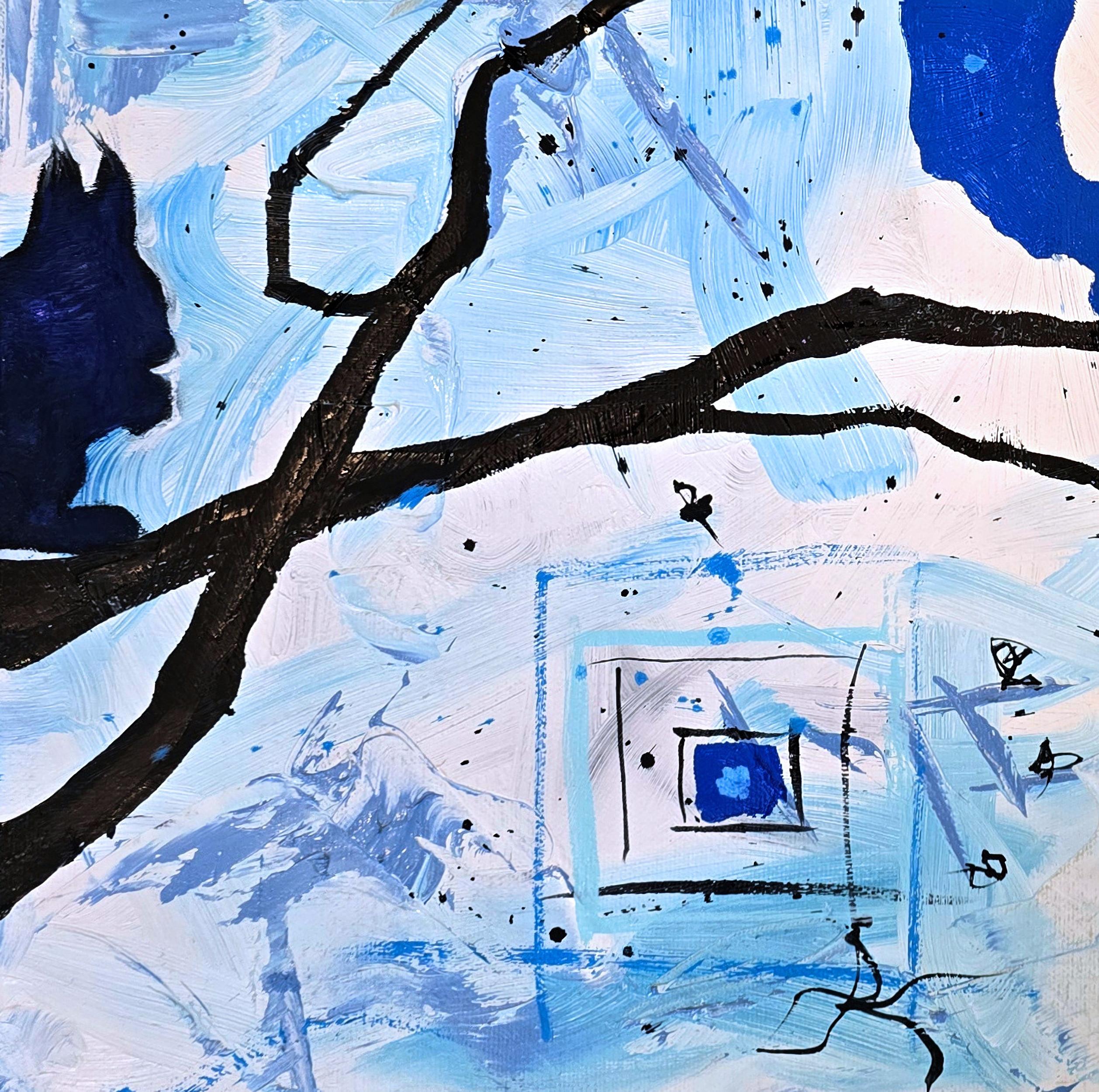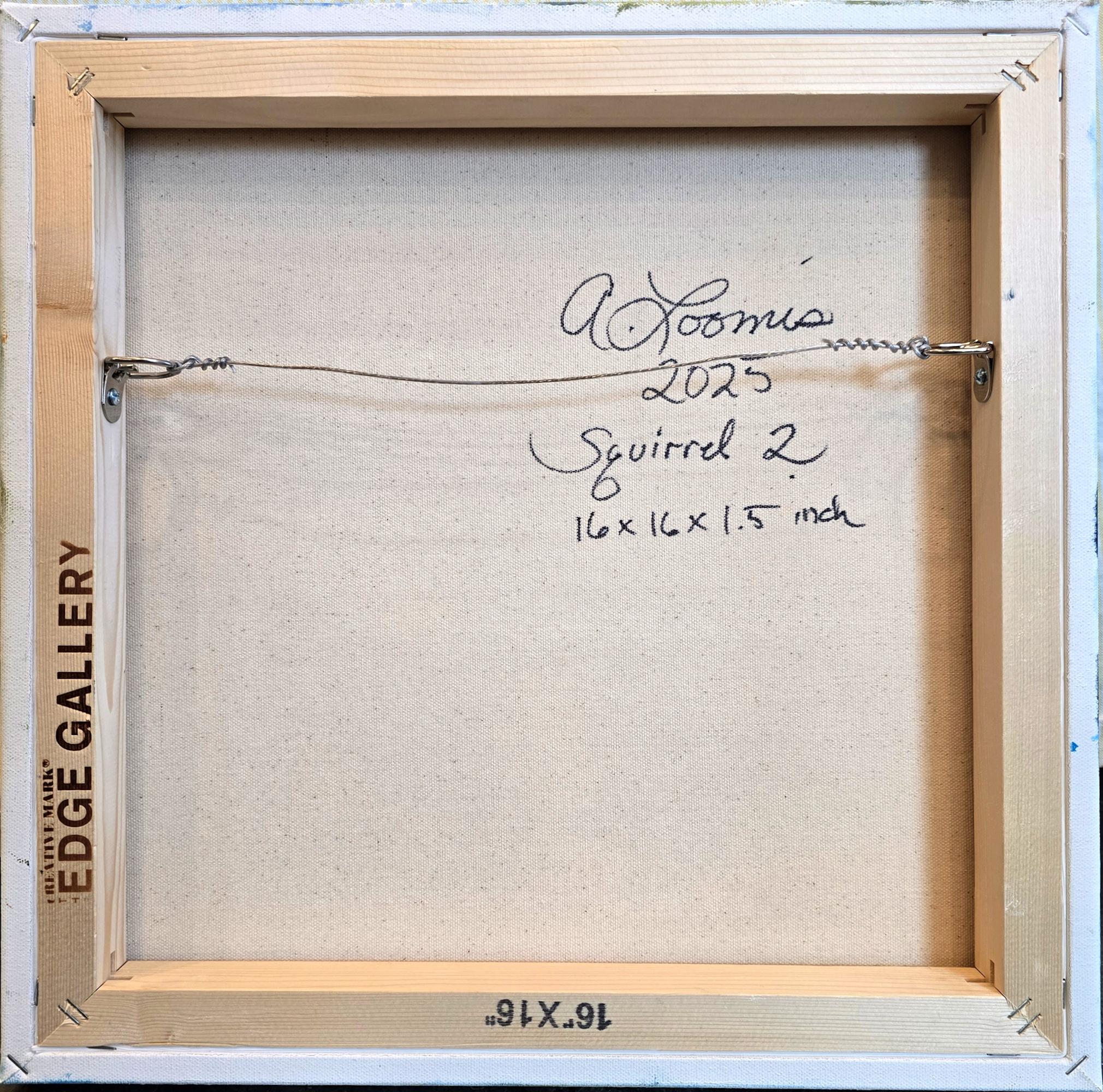 "Squirrels 2" est une charmante peinture à l'huile abstraite d'Anita Loomis. Cette composition présente une belle variété de bleus dans un arrangement léger et enjoué qui met en valeur la silhouette des écureuils, qui abondent dans la région d'origine de l'artiste, la Nouvelle-Angleterre. Cette peinture à l'huile de 16 x 16 pouces a une ambiance douce et énergique.