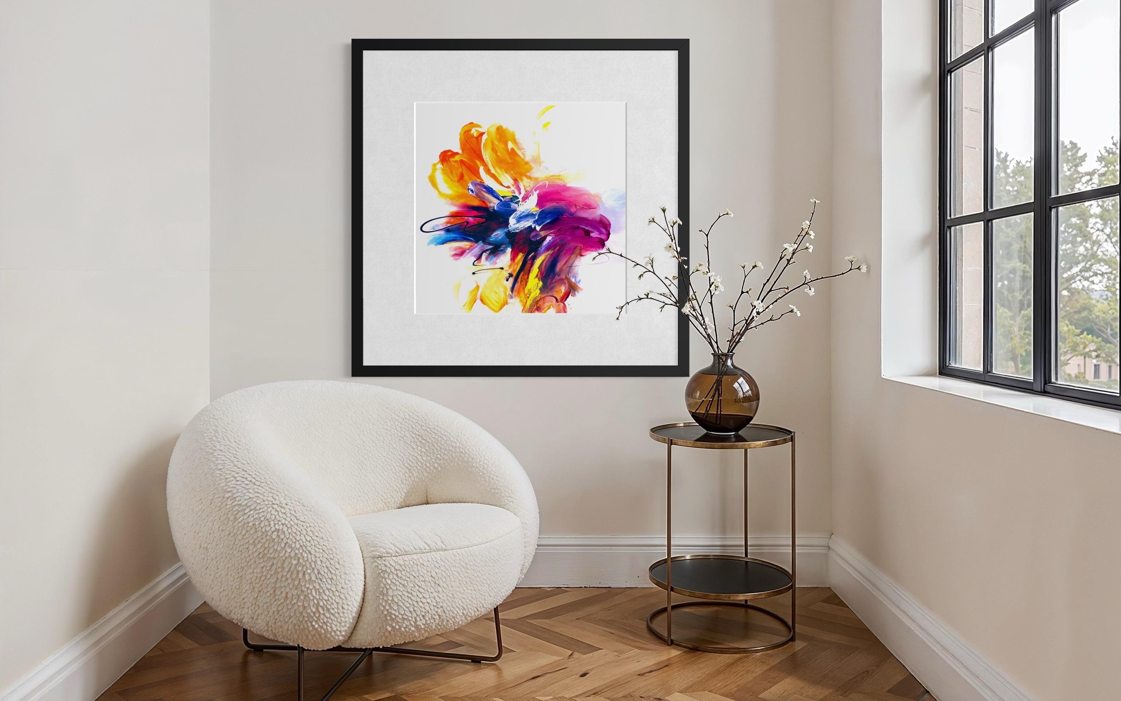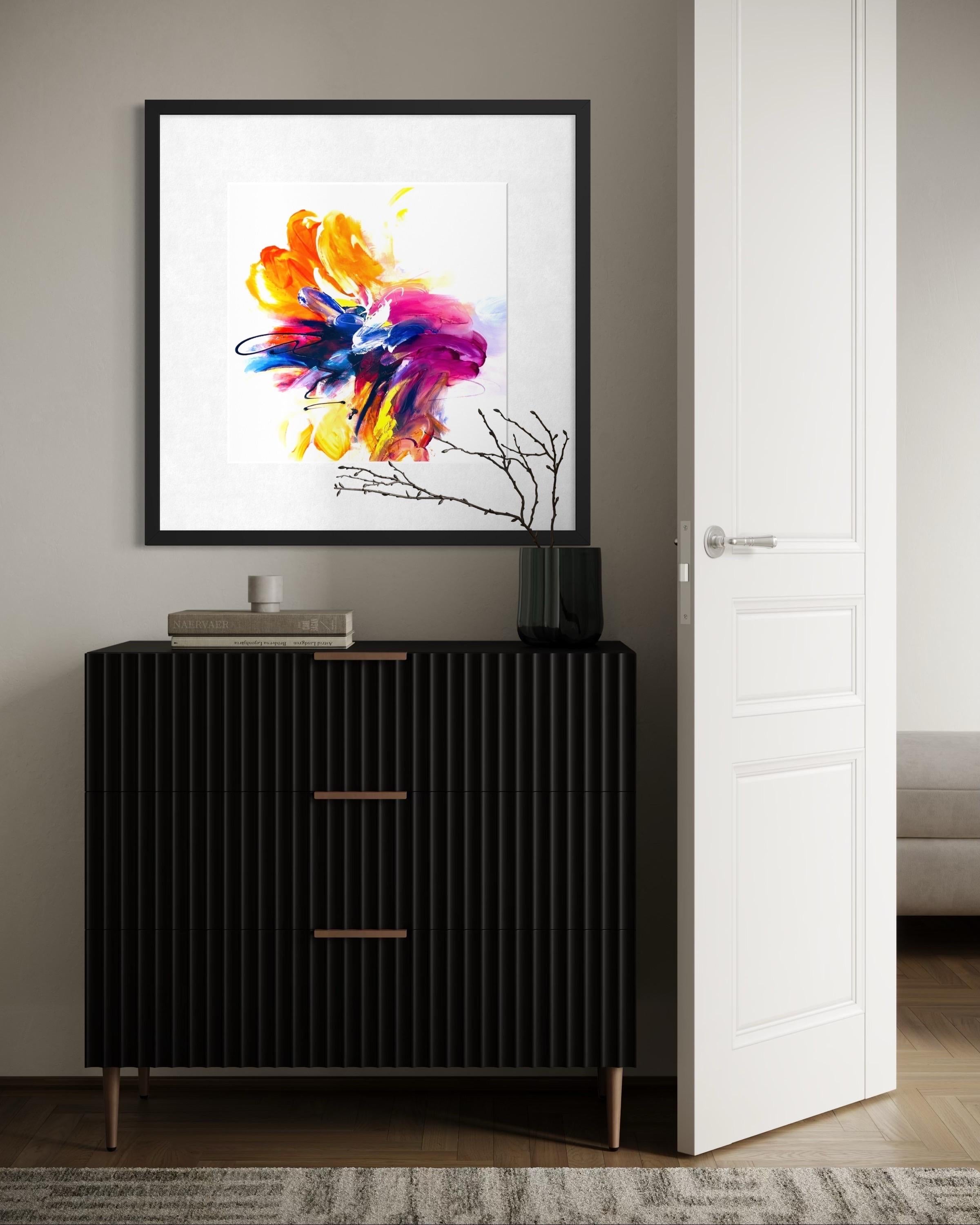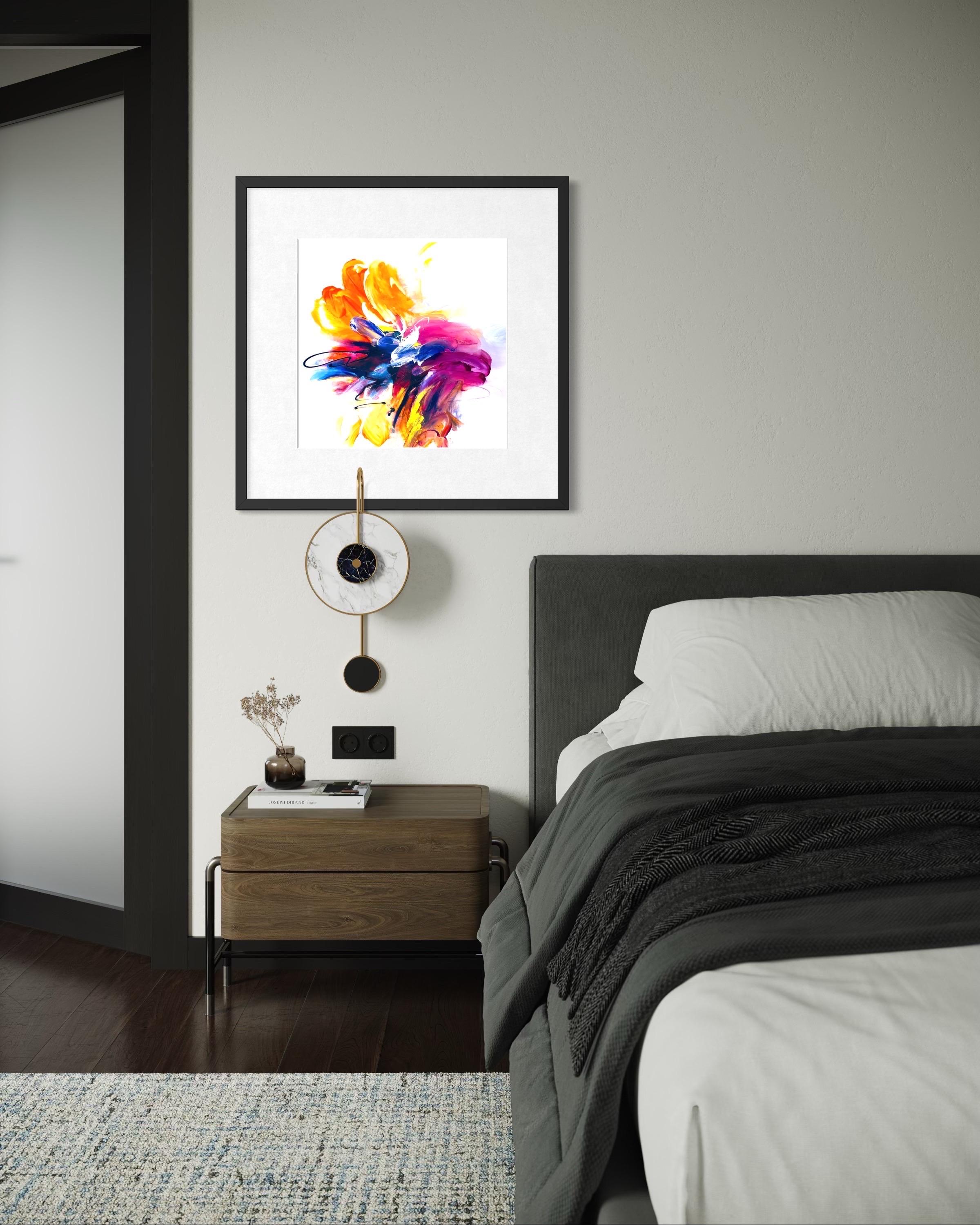 "Arrested Love" capture la beauté volatile d'une émotion en pleine floraison - un moment où la passion, la tendresse et la retenue coexistent dans une tension lumineuse. Des éclats de fuchsia, de cobalt, d'or et de cramoisi profond s'entrechoquent dans un tourbillon rythmique de couleurs, d'énergie et de mouvement suspendu.