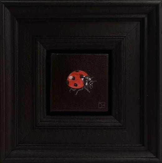 Pocket Ladybird 7 est une peinture à l'huile originale de Dani Humberstone, qui fait partie de sa série Pocket Painting, composée de peintures à l'huile réalistes à petite échelle, avec un clin d'œil aux natures mortes baroques. Les peintures sont placées dans un cadre en bois noir.