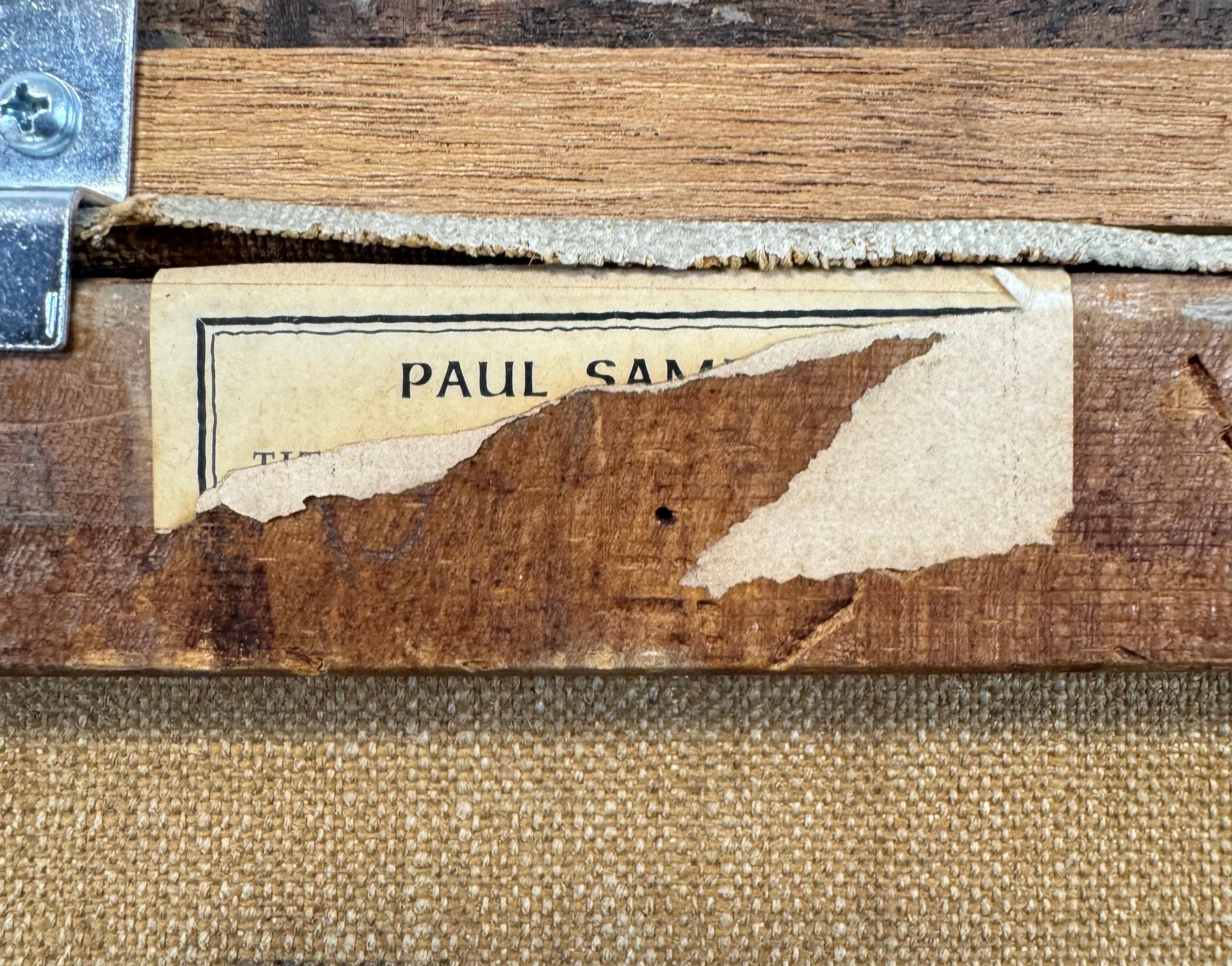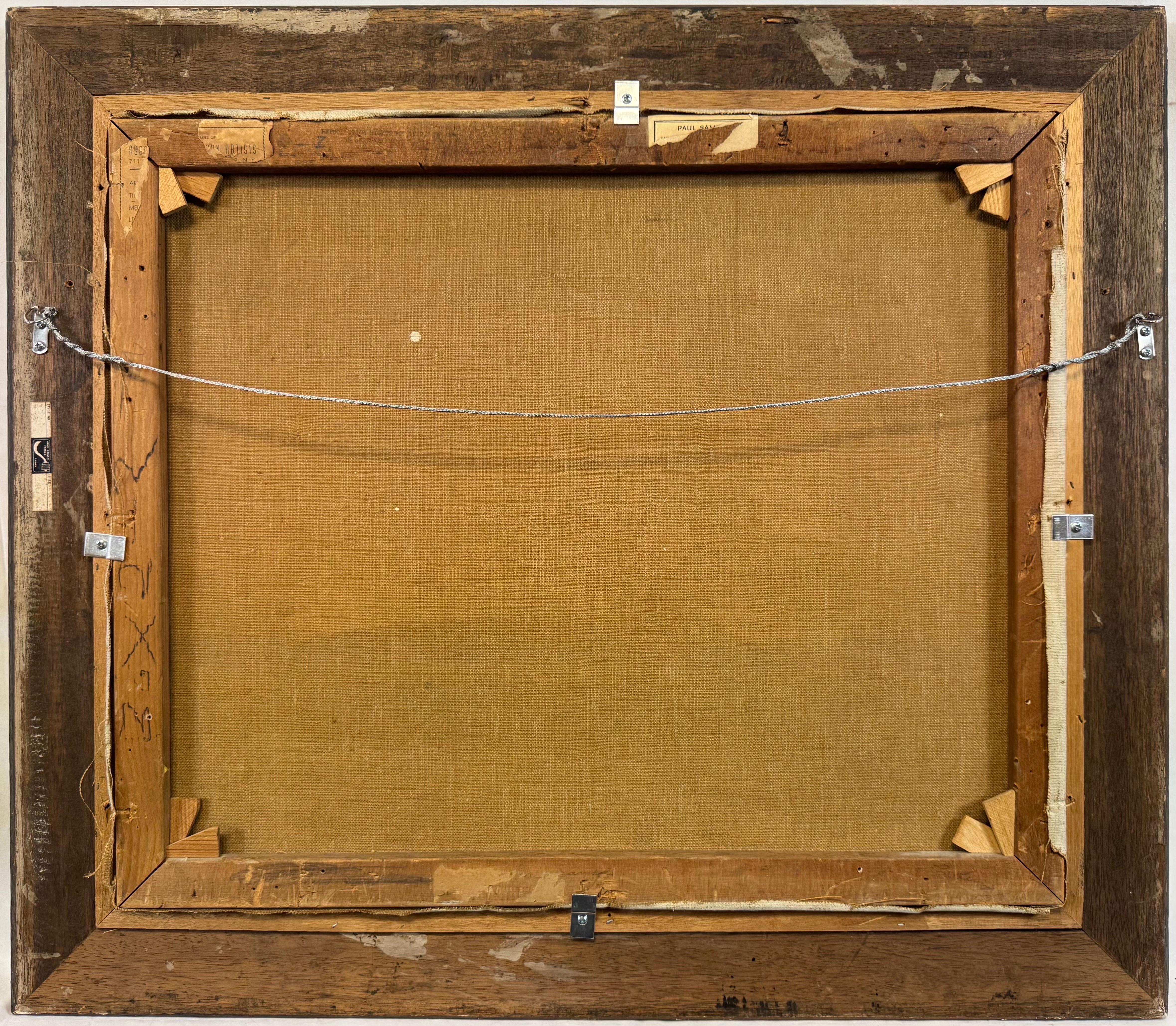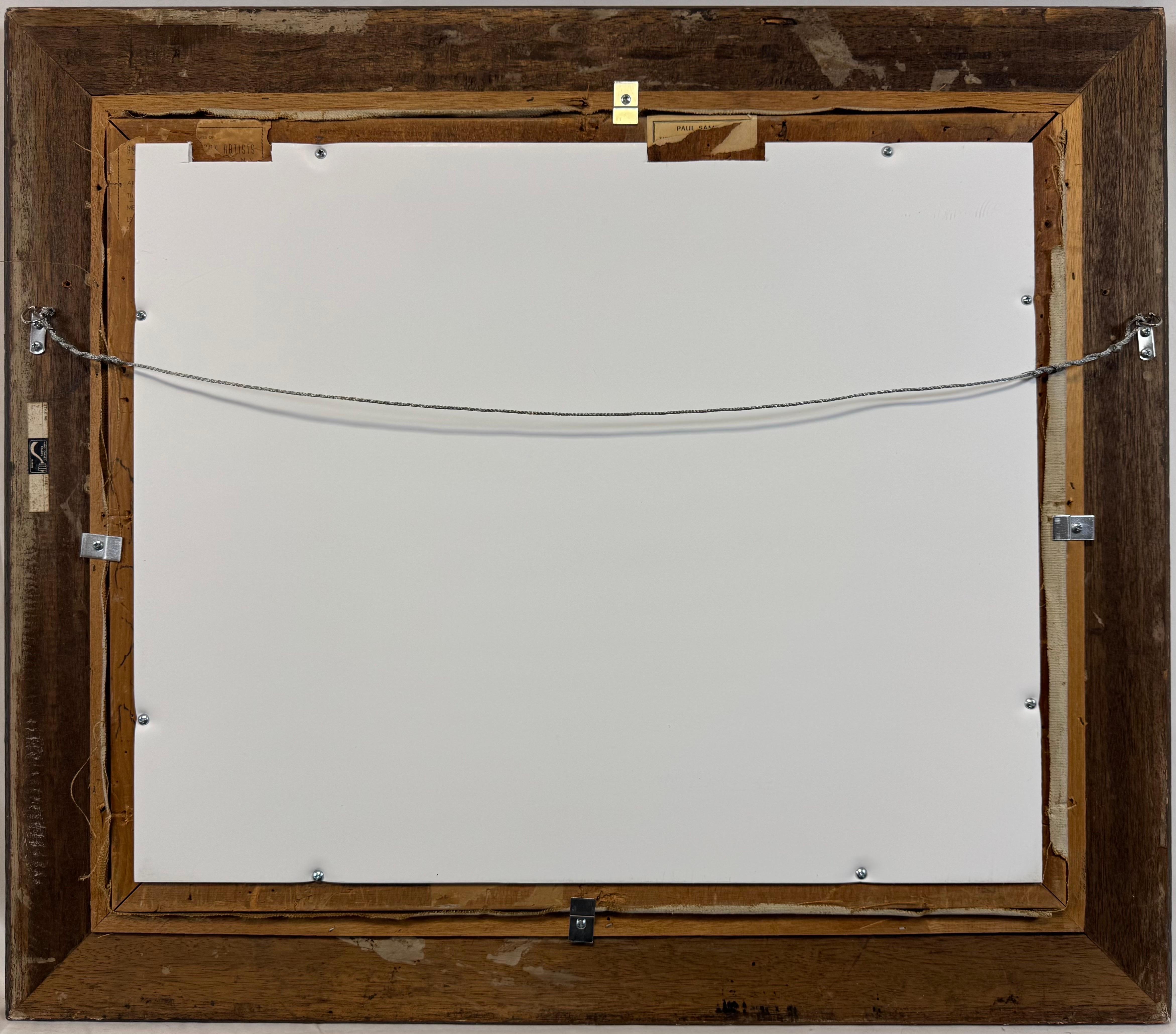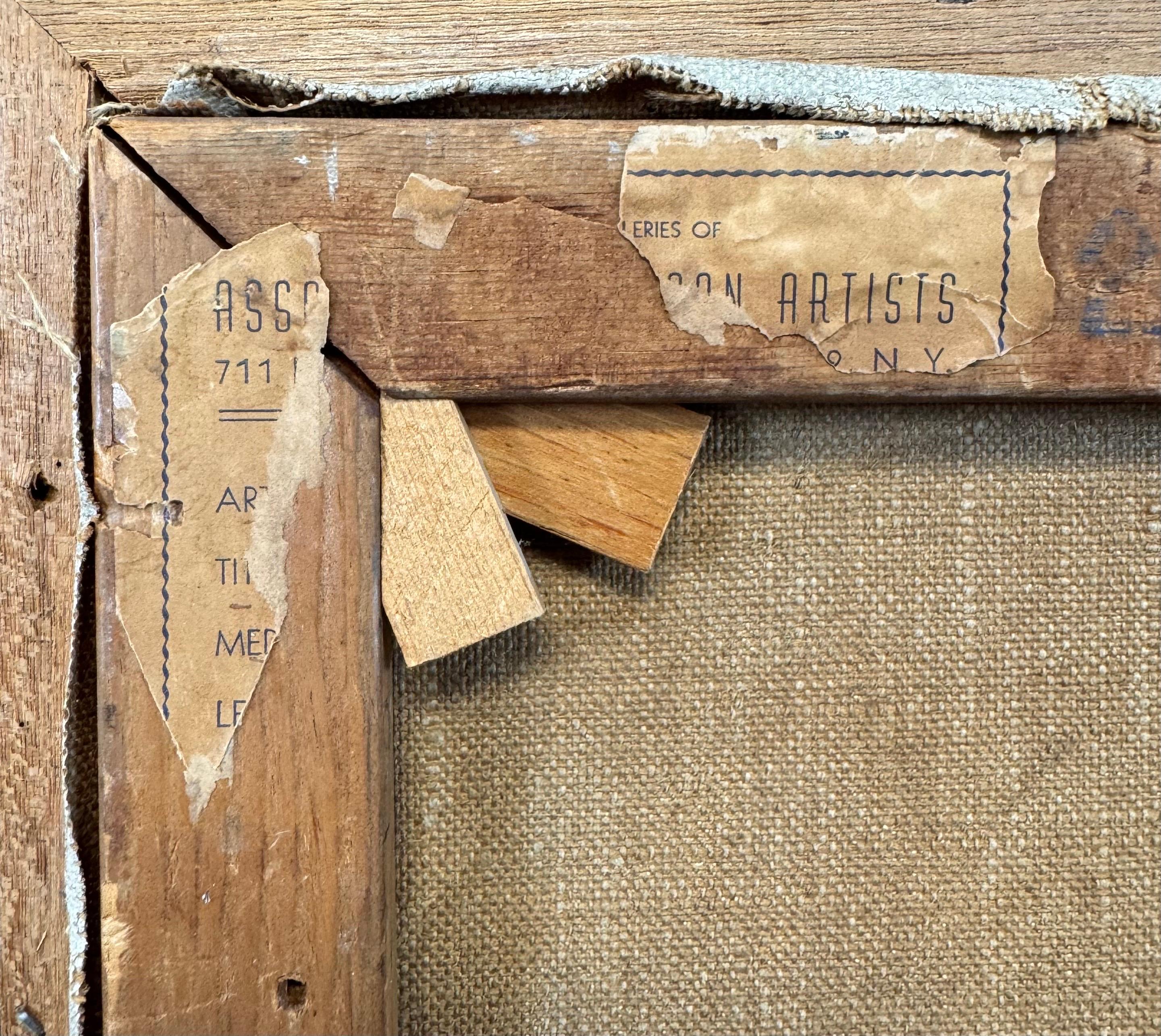 L'œuvre est une huile sur toile et est signée en bas à droite. Il est logé dans un magnifique cadre du milieu du siècle. L'œuvre conserve deux labels déchirés au verso - l'un de l'Associated American Artists et l'autre de l'artiste lui-même. Une faible inscription au crayon sur le châssis indique " ( ?) Yard ".