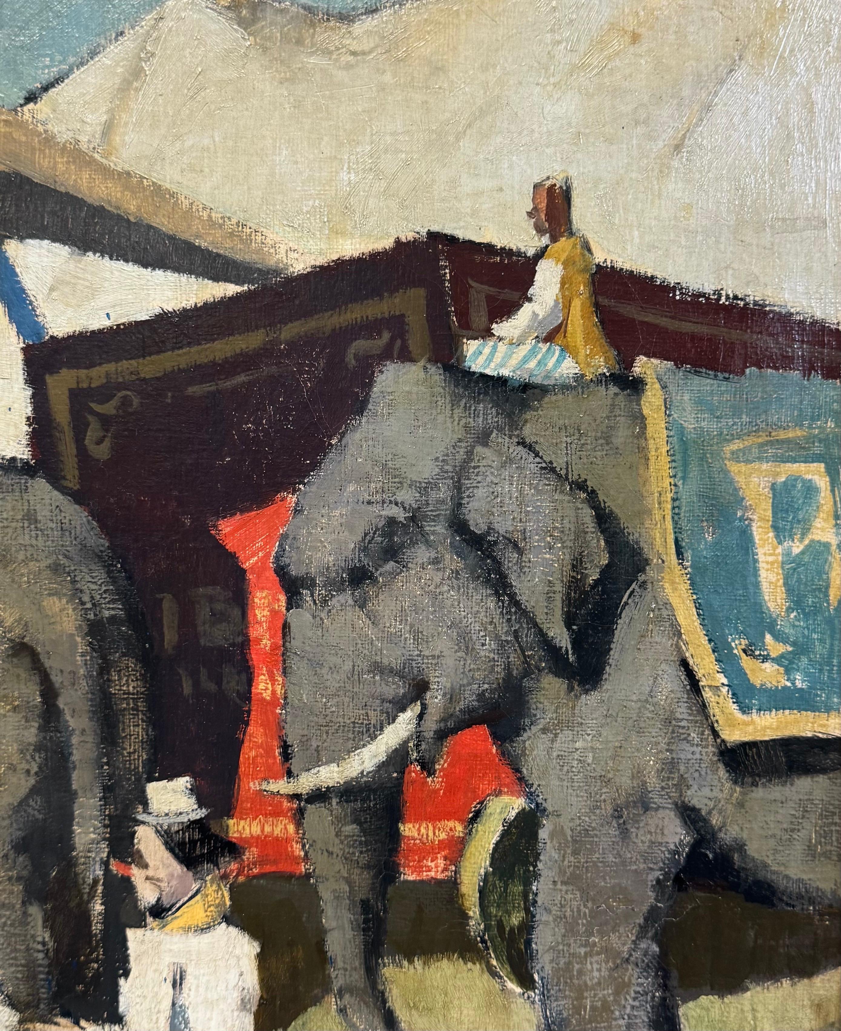 Articles similaires à "Cour du cirque" Régionaliste américain, éléphants, tentes, artistes, clowns, huile