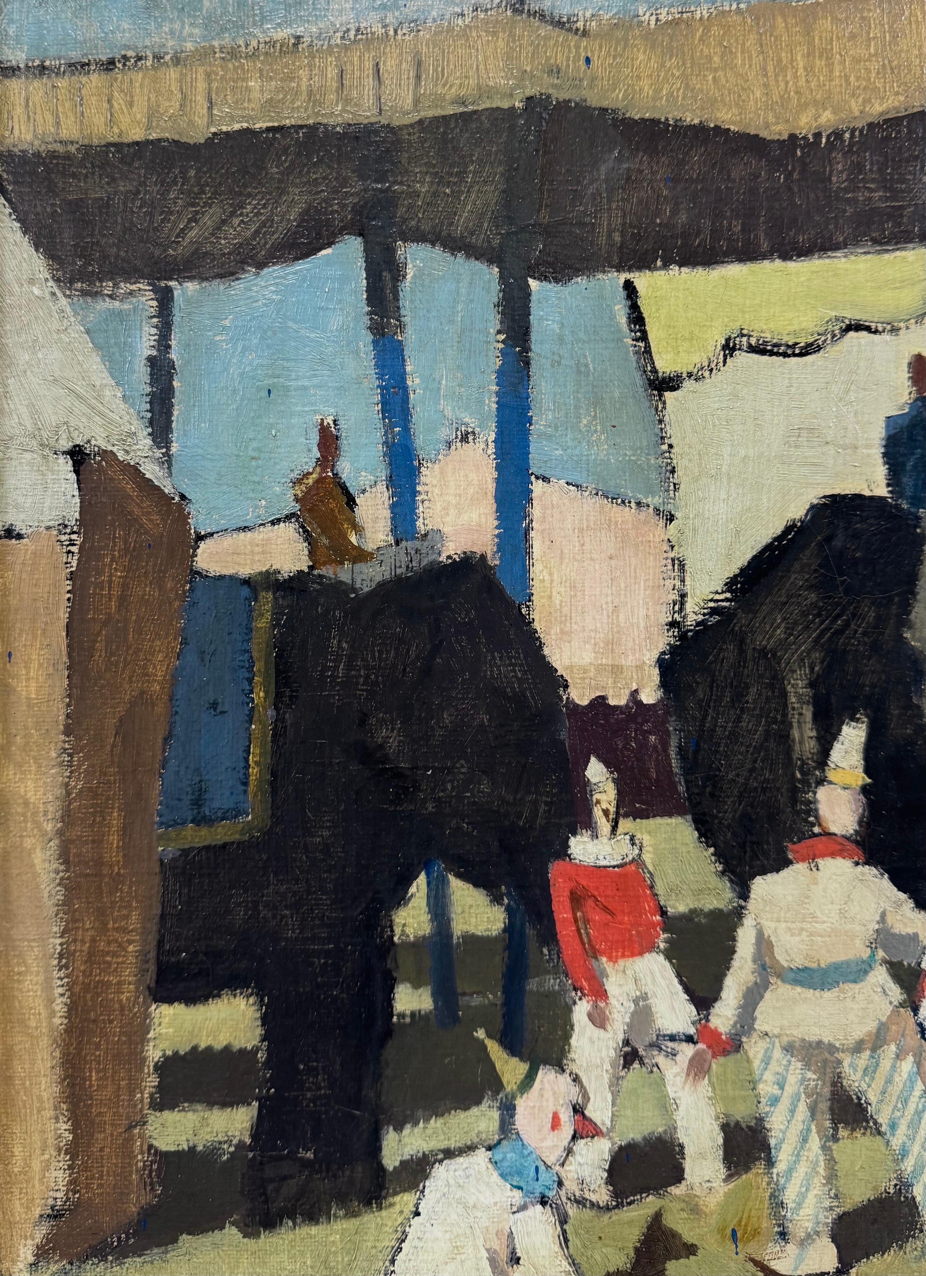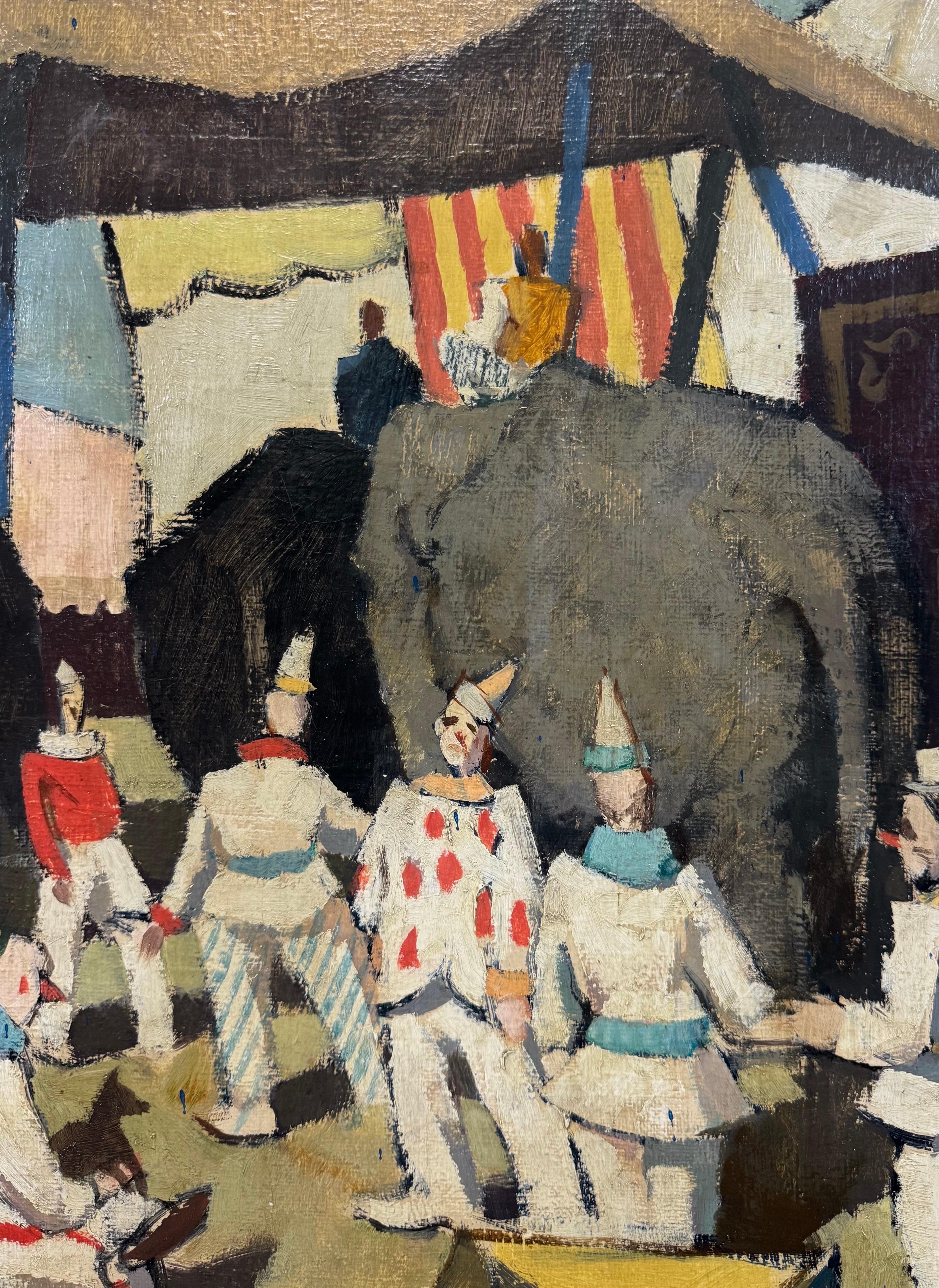 Antique scène de cirque moderniste d'école américaine par Ann Taube Goodman (Né en 1905). Huile sur toile, vers 1925.