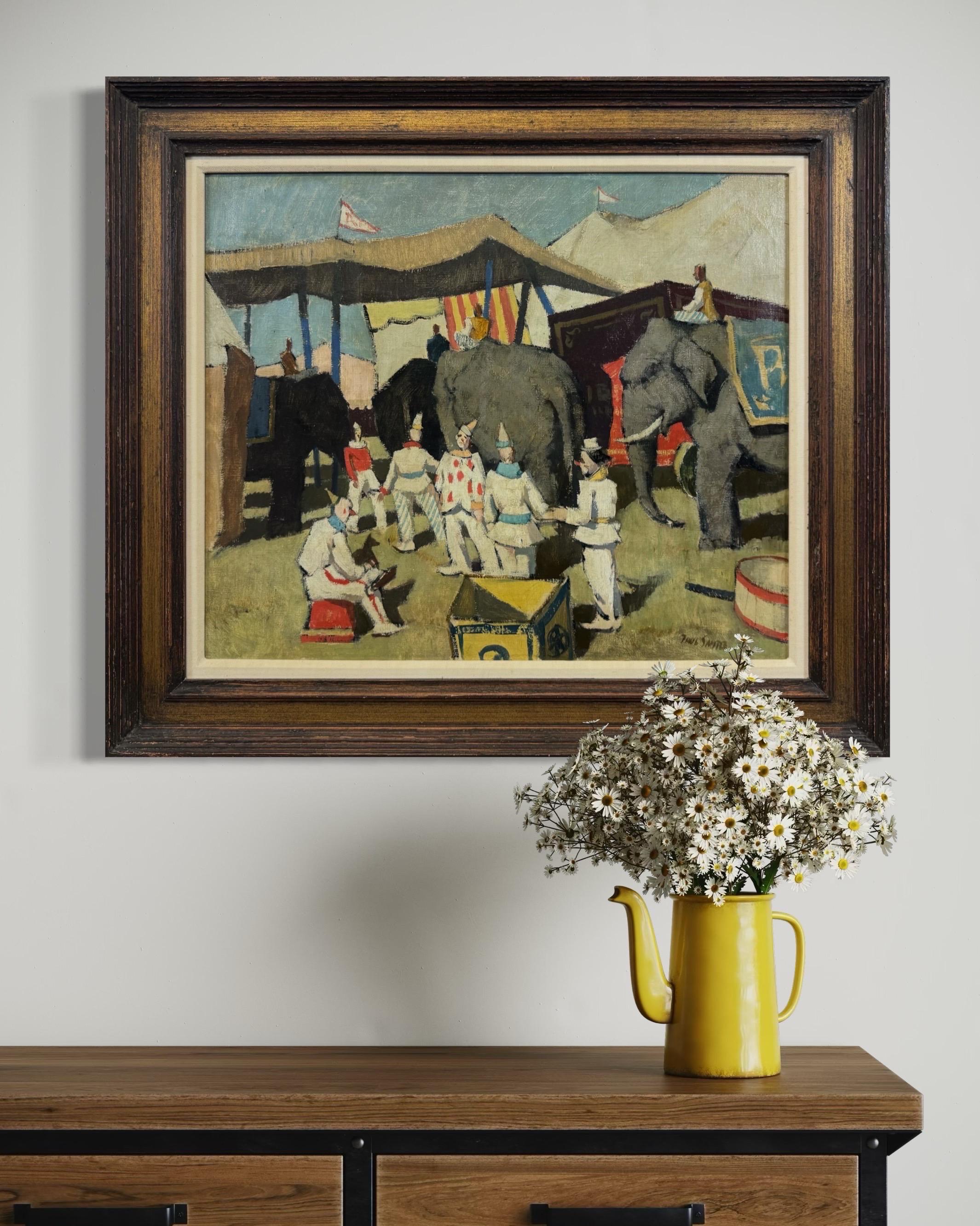 Exubérant et vivement peint, ce tableau représente le chapiteau d'un cirque à l'orée d'une petite ville, avec un chariot sur le côté, une paire d'éléphants attendant leur heure et de...