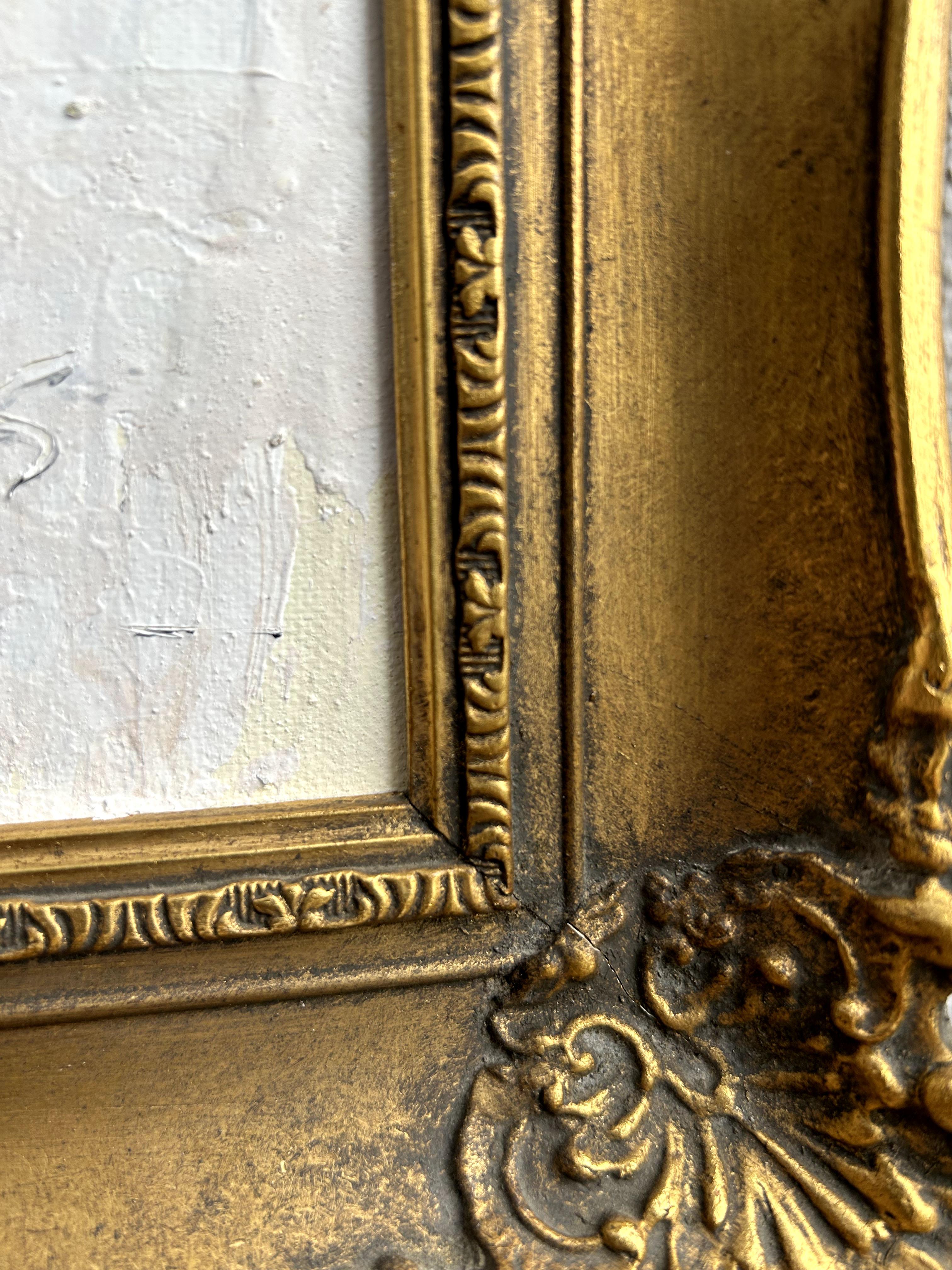 Le cadre en bois antique/doré présente des signes normaux d'usure dus à son âge, des ébréchures ou des imperfections mineures correspondant à sa période de fabrication.