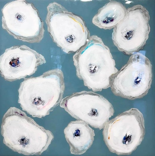 Anne Harney« Oyster Trio » 3 huîtres dorées et blanches sur fond noir avec finition en résine.2022