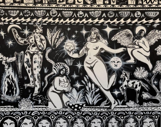 Daphne Sweet, une artiste contemporaine dynamique basée dans le Montana, présente une collection saisissante qui transporte le spectateur dans un monde où le mythe et le paysage sont inextricablement liés. S'inspirant d'une éducation profonde et matriarcale et d'un engagement profond dans les récits de l'Ouest américain, la pratique de Mme Sweet s'étend à la peinture et à la céramique, tout en restant unifiée par un langage visuel distinctif et imaginatif. Sweet récupère et réanime des tropes artistiques historiques - des figures célestes des fresques de la Haute Renaissance au mouvement luxuriant du Rococo - et les recontextualise à travers une lentille audacieuse et féministe. Ses compositions possèdent une complexité qui rappelle les manuscrits enluminés, équilibrant un travail au trait illustratif complexe avec une immédiateté moderne et une utilisation vive et symbolique de la couleur. Cette juxtaposition insuffle une énergie ludique, souvent électrique, à des formes anciennes.