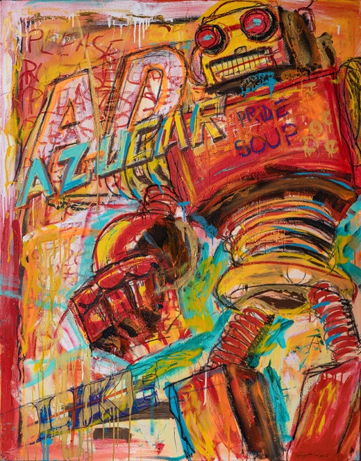 Diego Tirigall, né en Argentine en 1976 et résidant aujourd'hui en Espagne, a grandi dans un environnement assombri par un trouble de l'accumulation. Immergé dans une famille d'antiquaires et de restaurateurs d'art, la maison de son enfance ressemblait davantage à un entrepôt surpeuplé regorgeant d'antiquités et d'œuvres d'art en attente de restauration, loin d'être un espace idéal pour une enfance conventionnelle. Ce cadre, saturé de reliques vieillies et en décomposition, a profondément marqué sa jeunesse, faisant naître en lui un esprit rebelle et une profonde aspiration à la libération. Cette soif de libération s'est traduite dans l'art, mais pas dans celui qui prévalait dans son environnement familial. Tirigall s'est d'abord orienté vers l'art numérique, apparemment pour se dissocier des souvenirs obsédants de son enfance. Sa rébellion artistique a finalement trouvé un écho dans les domaines de l'art de la rue et de l'expressionnisme - des styles célébrés pour leur spontanéité, leur dynamisme et leur refus de se conformer aux normes traditionnelles. L'œuvre de Tirigall propose une exploration critique de thèmes contemporains, notamment l'intelligence artificielle, l'addiction aux écrans et la décentralisation. Son art se caractérise par des éléments récurrents tels que des robots vintage, des crânes, des logos et des mots, un clin d'œil subtil à l'influence profonde de Basquiat et de Warhol sur son art. Autodidacte, Tirigall a appris par essais et erreurs, évitant toute instruction formelle. Son expérience réussie en tant que graphiste et directeur artistique lui a permis d'acquérir une approche unique et délibérément décontractée du traitement des couches, des espaces, des formes et des couleurs - une démonstration artistique de sa compréhension des règles qu'il enfreint consciemment. Ses œuvres ont été reconnues dans le monde entier et ont été exposées de Séoul à Beverly Hills. Il a également fait la couverture du catalogue "New Masters" de SaatchiArt. Au-delà de ses activités créatives, Artistics consacre du temps à aider d'autres artistes à améliorer leur profil et leurs stratégies de promotion. Le parcours de Diego Tirigall, d'une enfance limitée par des restrictions à une carrière artistique riche en créativité et en succès, est un témoignage convaincant de la rébellion en tant que catalyseur de la créativité.