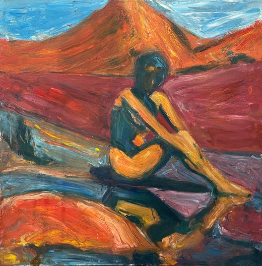 Dans "Horse and Woman", Maura Petersen capture un moment de connexion profonde entre la forme humaine et le monde naturel. Les personnages - femme et cheval - sont rendus dans des teintes audacieuses et non conventionnelles, où dominent les bleus, les verts et les violets, ce qui permet de passer d'une représentation réaliste à une résonance émotionnelle. La femme est immobile, face au cheval, mais sa forme semble se fondre dans le paysage, comme si elle s'intégrait elle aussi à l'environnement et vivait en harmonie avec l'animal.