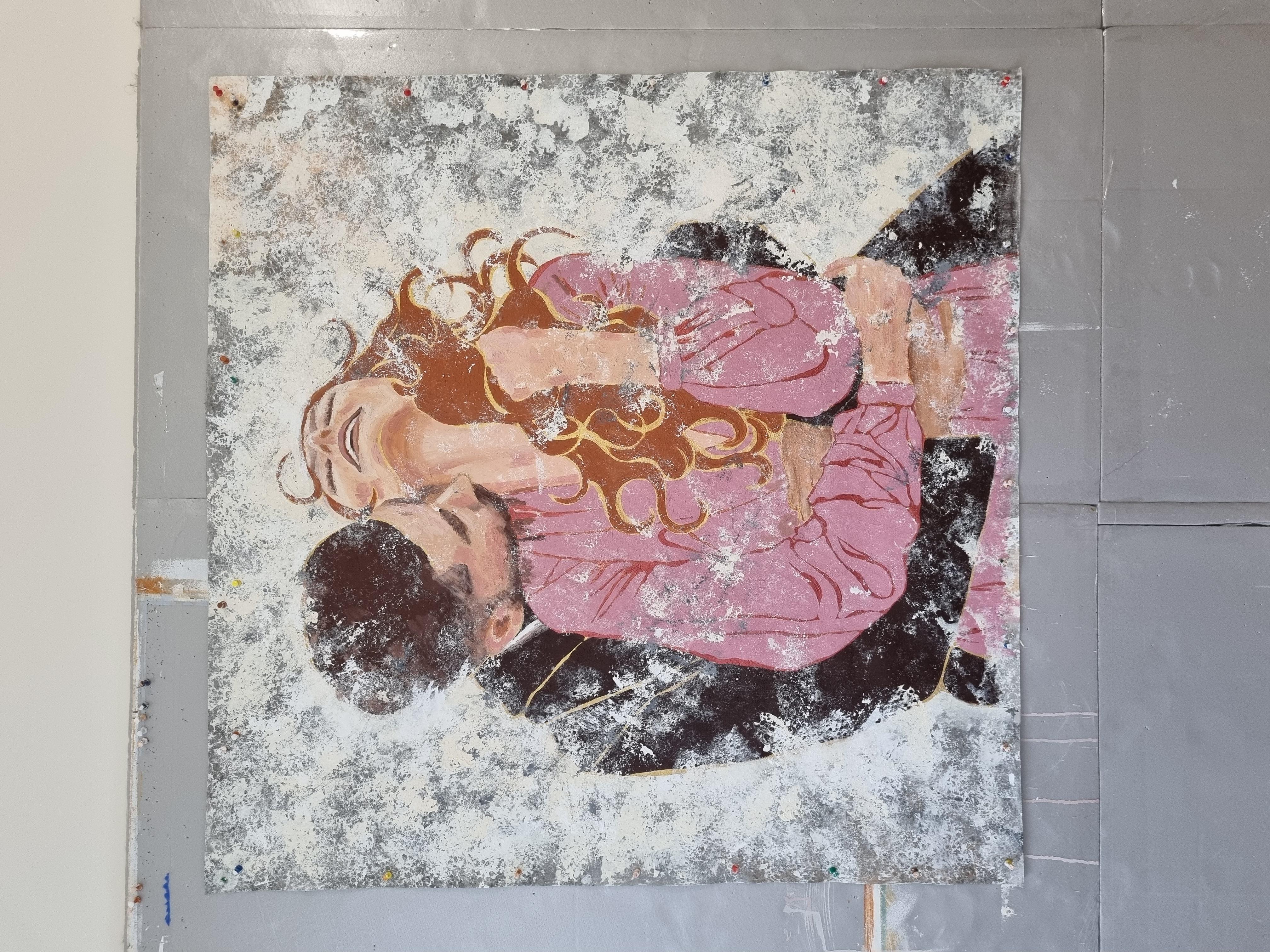 "Exhale' visualise le moment où l'on s'abandonne complètement à l'émotion. Les coups de pinceau expressifs et les touches d'or créent une vibration dans l'air qui entoure le couple, comme si l'espace lui-même respirait à l'unisson avec eux. C'est l'histoire de l'amour qui nous permet d'être enfin nous-mêmes".