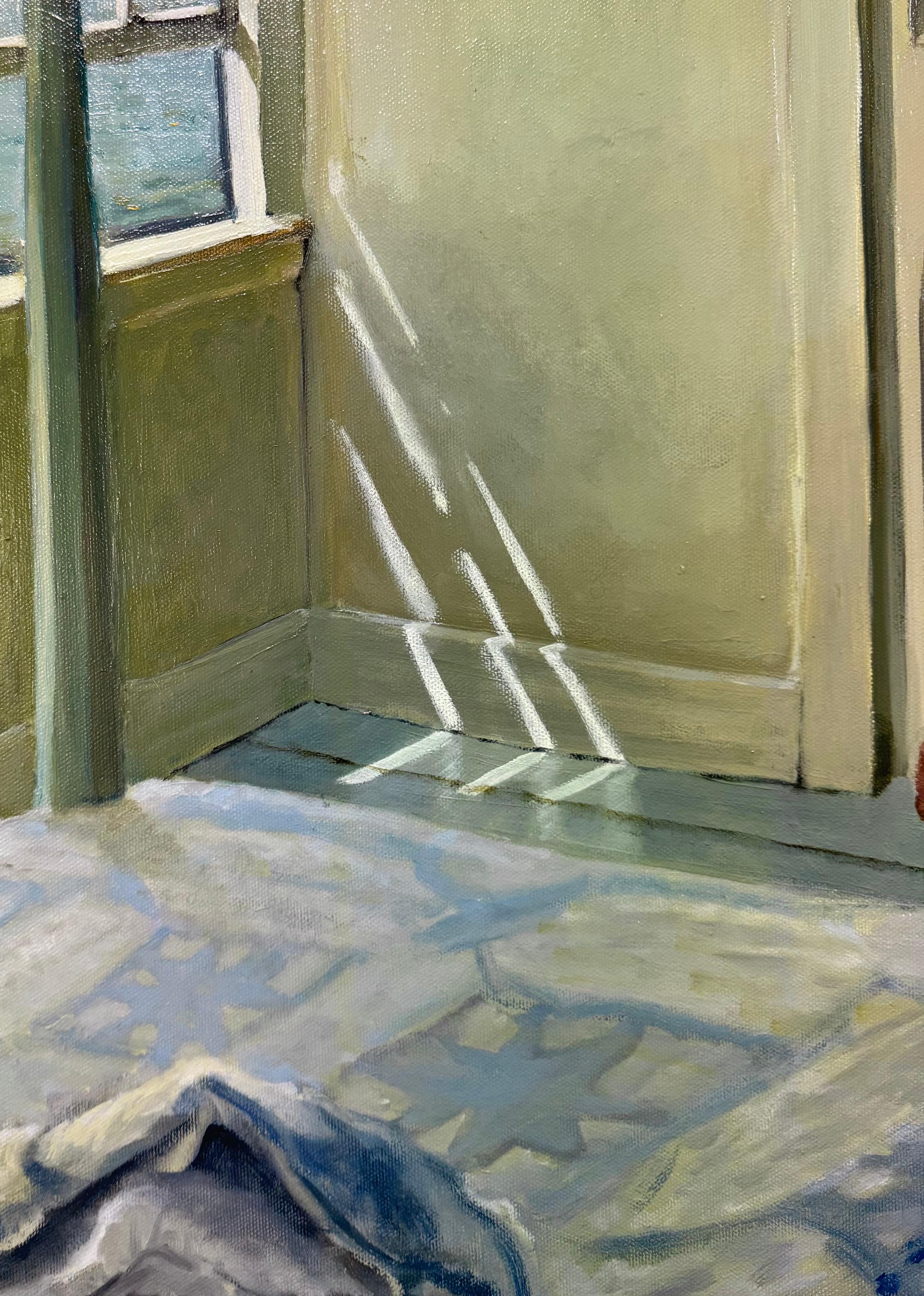 Warm Light" (2023) de Riley Doyle est une peinture à l'huile originale, réalisée à la main, qui représente le soleil qui brille à travers la fenêtre. Cette œuvre mesure 17 x 14 pouce...