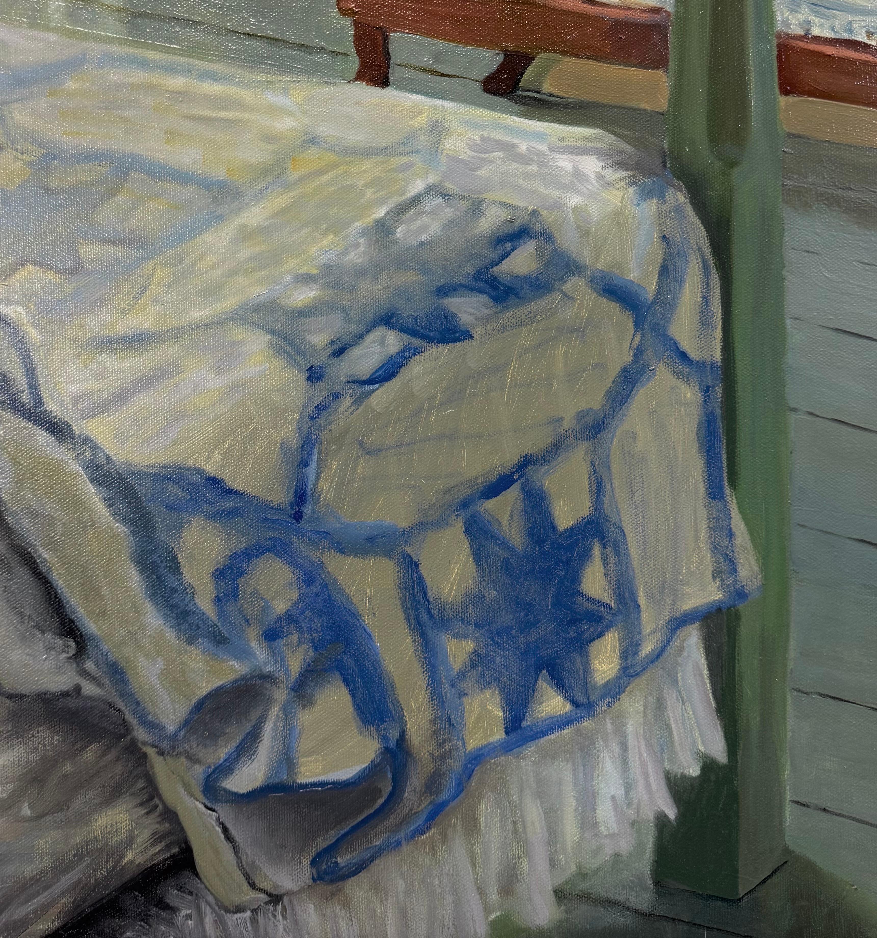 Une œuvre sereine et délicieusement composée qui capture la poésie tranquille d'une chambre à coucher éclairée par le soleil aux premières heures du jour. Descendante de la célèbre dynastie artistique des Wyeth, Mme McCoy s'inscrit ici dans la tradition de réalisme de Brandywine tout en insufflant à son travail sa propre sensibilité intuitive à la lumière, à la texture et à l'atmosphère.