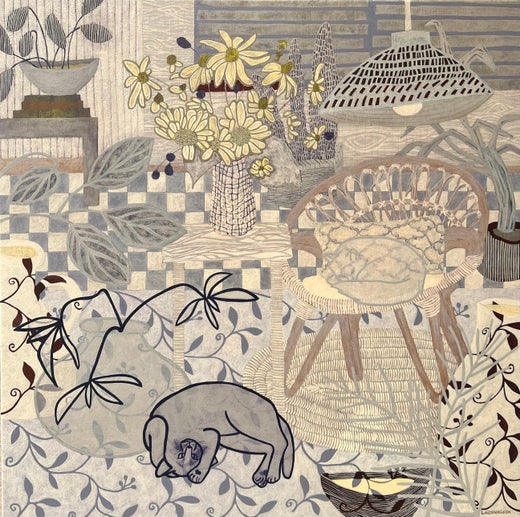 Mes peintures mettent l'accent sur les couleurs et les motifs. Dernièrement, j'ai introduit la représentation par le biais de fleurs dans des vases, et plus récemment