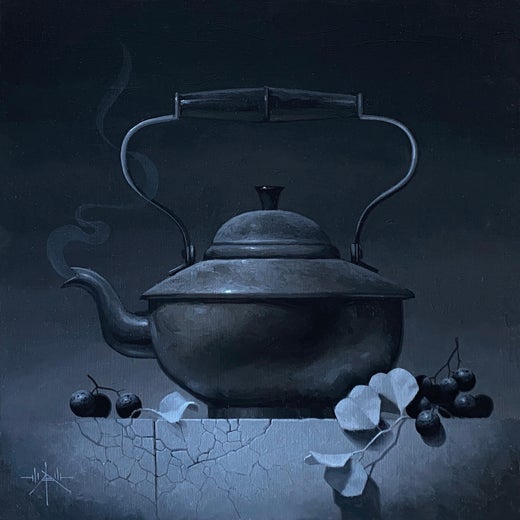 "Achromatic" de Blair Atherholt est une peinture originale réalisée à la main représentant une théière fumante avec des raisins et des feuilles.