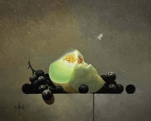 "Approach" de Blair est une peinture originale, réalisée à la main, représentant une grappe de raisin suspendue au-dessus d'une orange brillamment éclairée.