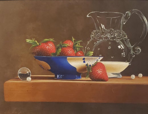 Fraises, billes et crème, tempera à l'œuf, réalisme 9.5 " x 7.5" Elle est peinte à la détrempe à l'œuf, une technique vieille de plusieurs siècles dans le monde de l'art. Remarquez...