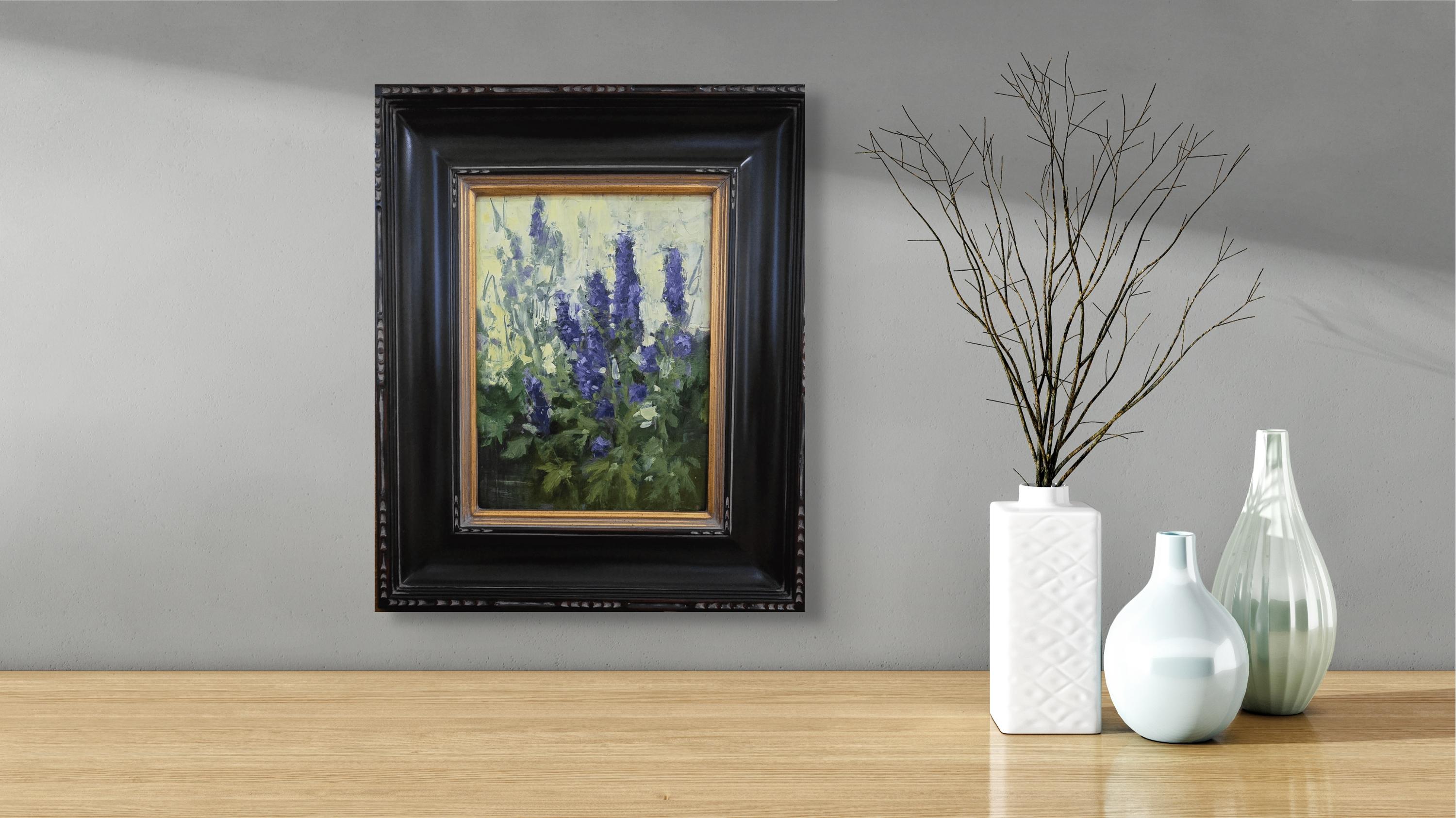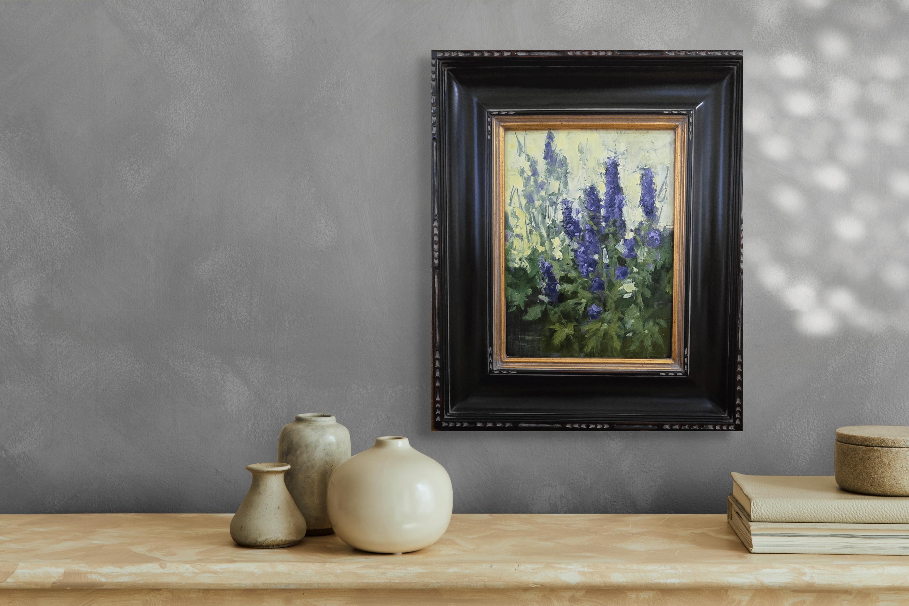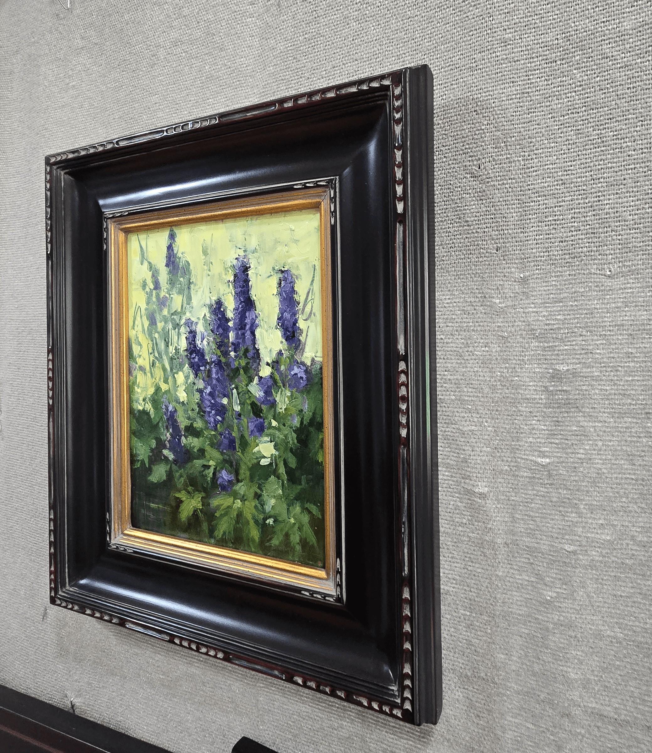 "Chapel Delphiniums" (2025) par Susie Hyer est une peinture à l'huile originale faite à la main sur toile de lin tendue. Cette peinture mesure 12 x 9 pouces et est encadrée au format 20 x 16 pouces.