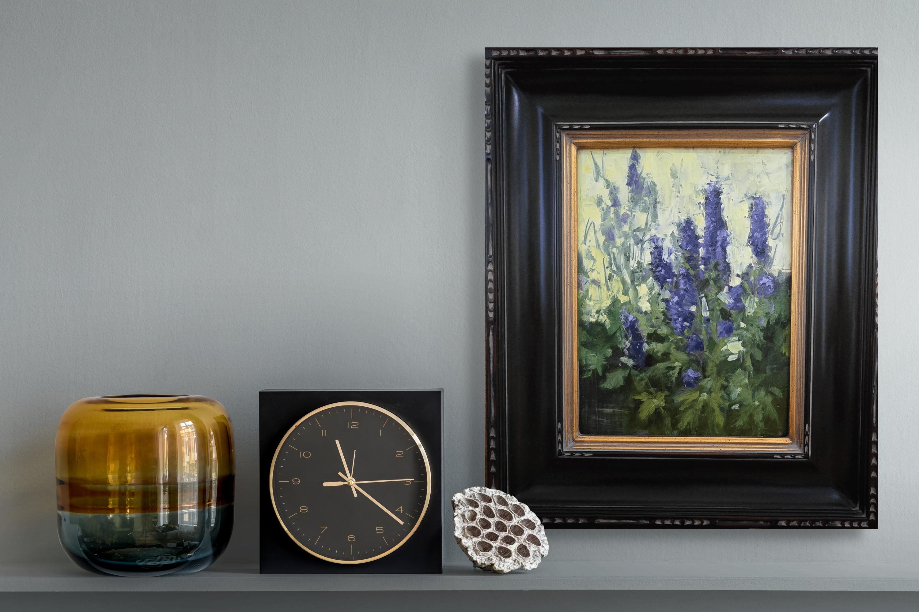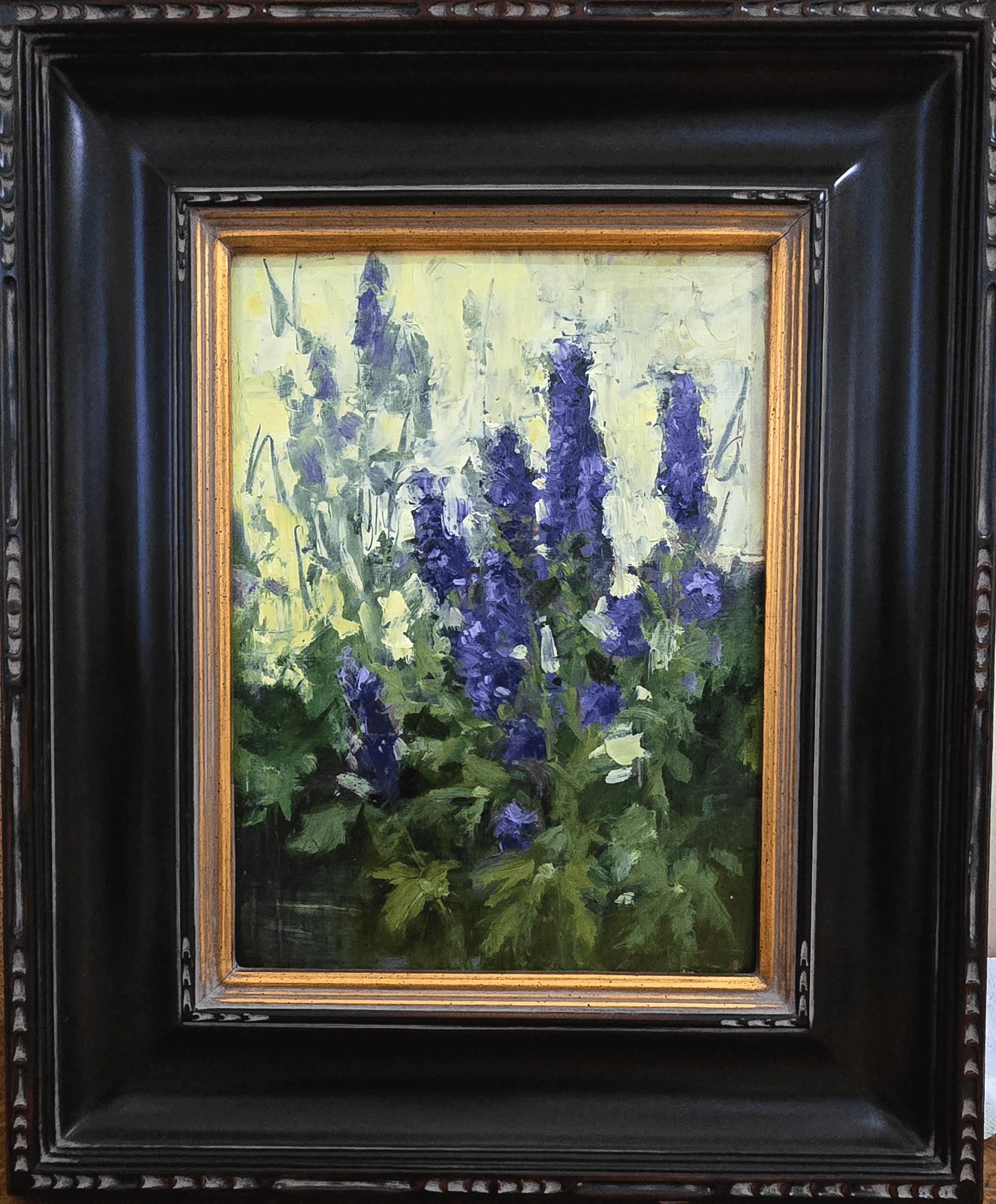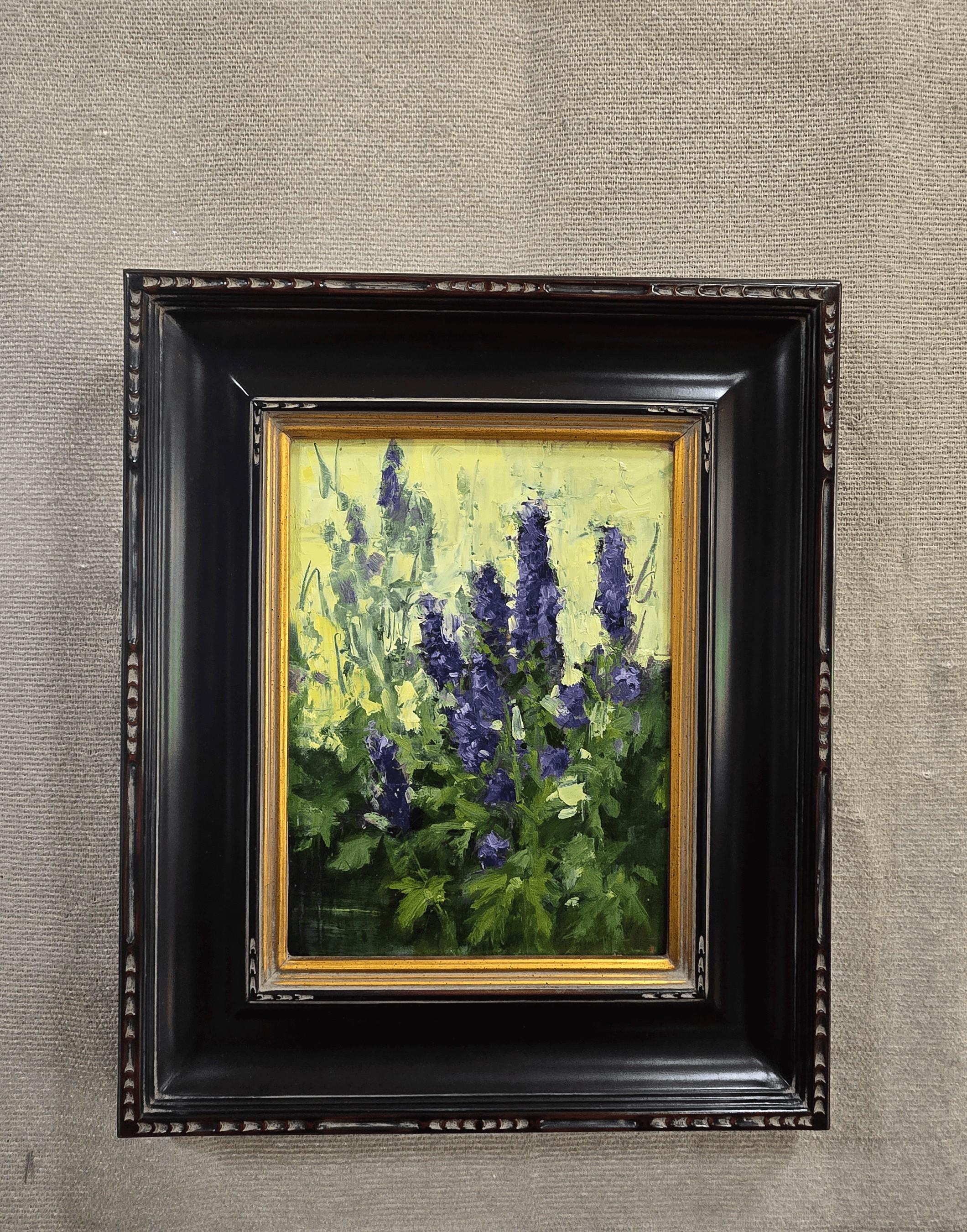 "Chapel Delphiniums" (2025) par Susie Hyer est une peinture à l'huile originale faite à la main sur toile de lin tendue. Cette peinture mesure 12 x 9 pouces et est encadrée au format 20 x 16 pouces.