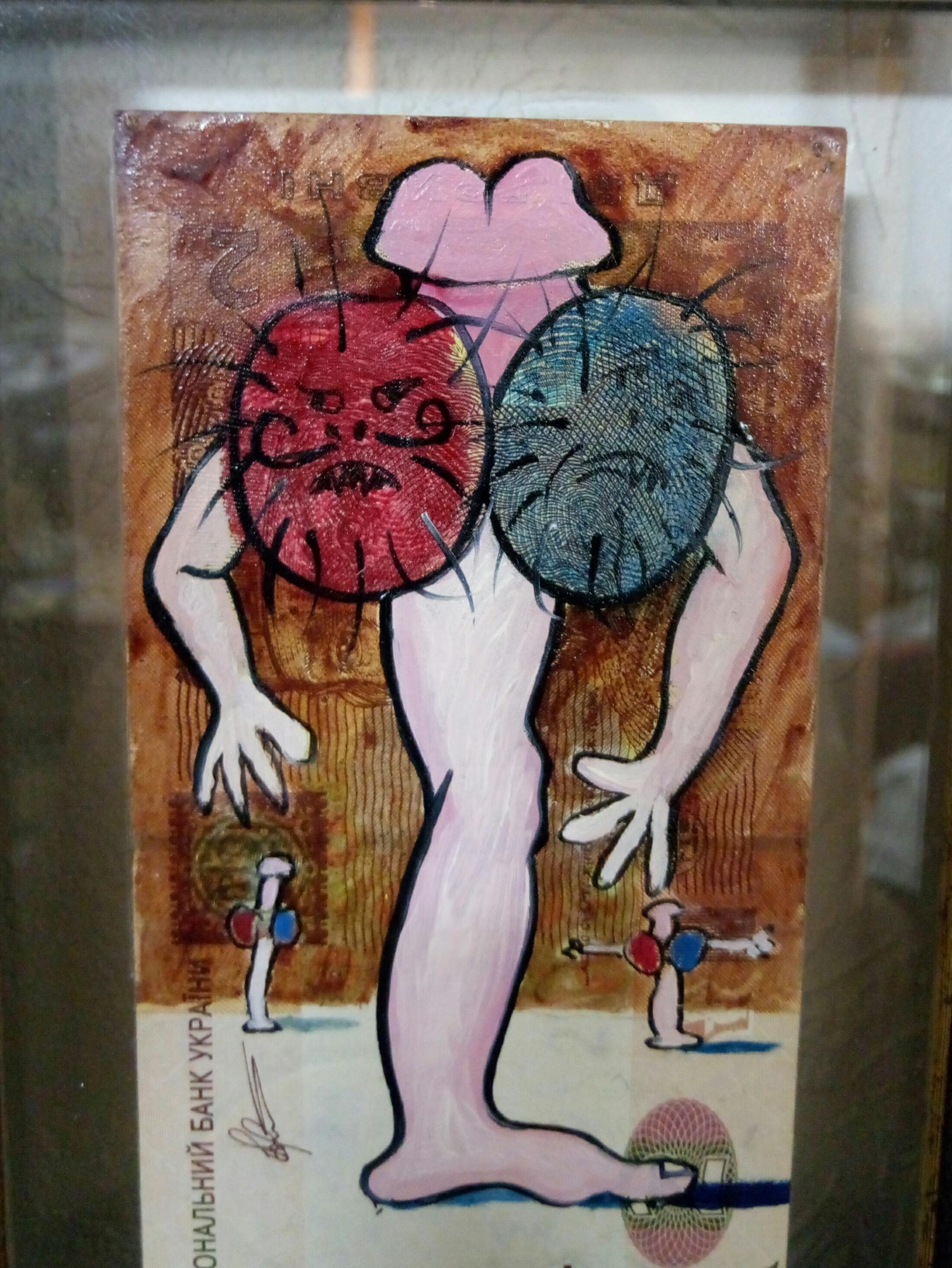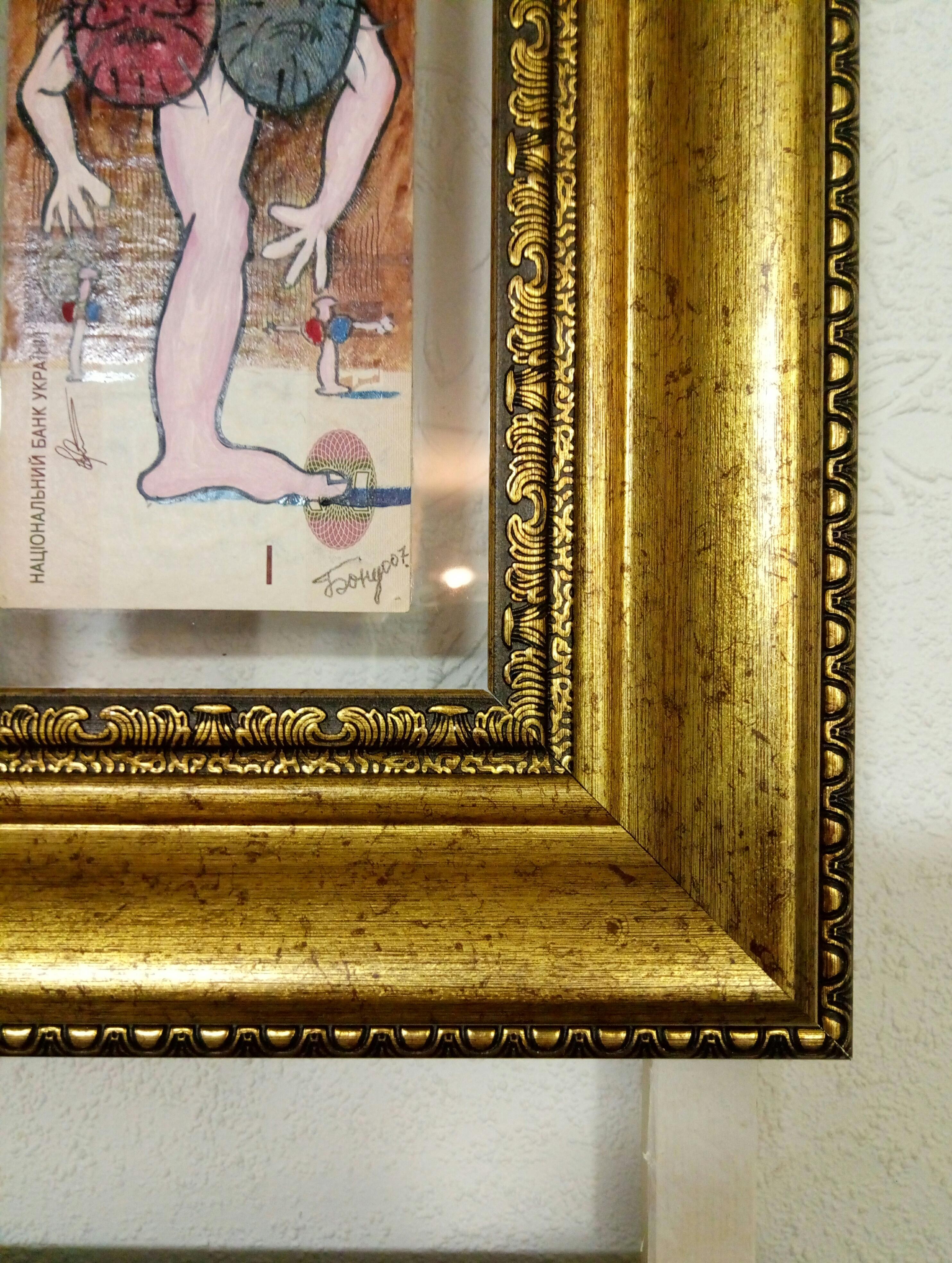 Peintures sur billets de banque ukrainiens, taille du cadre 25-20 centimètres, le billet lui-même ayant une taille de 12-6 centimètres, une miniature. Le tableau est encadré dans un cadre en plastique, le billet est collé sur du plexiglas. Le passeport est transparent, il ressemblera à vos murs.