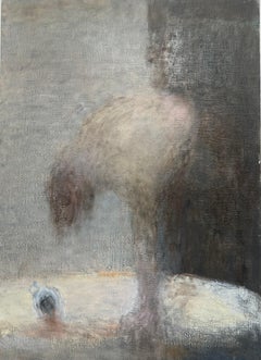 Stillness" (2024) de Matt Talbert est une peinture à l'huile sur lin, mesurant 21 x 14 pouces (53,34 x 35,56 cm). L'œuvre d'art non encadrée représente une figure féminine nue assise...