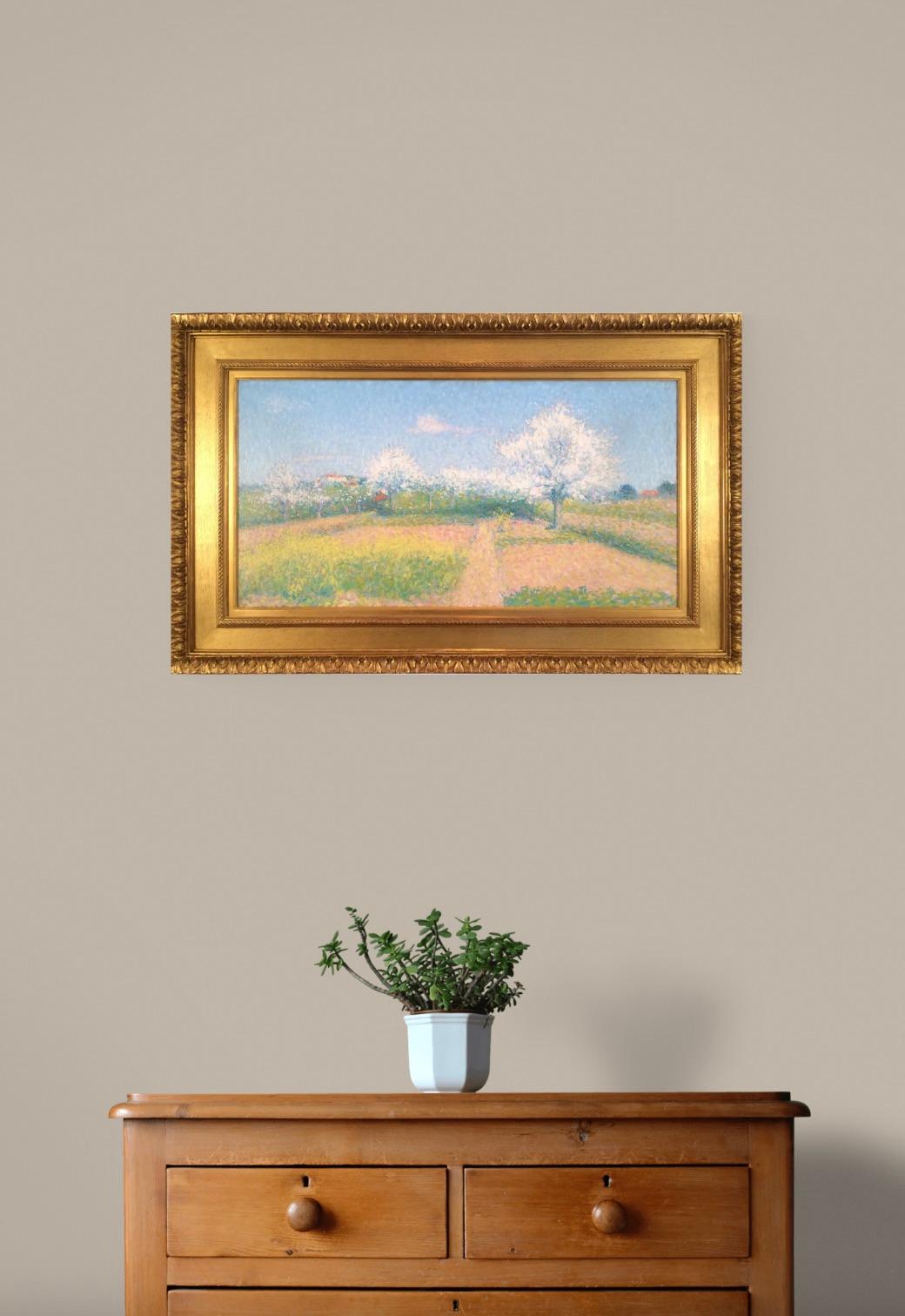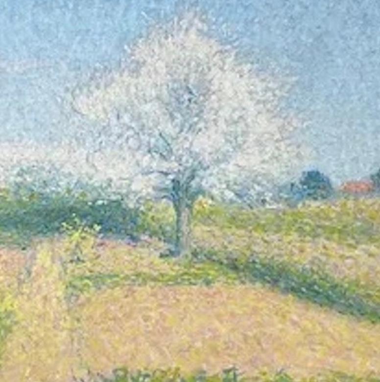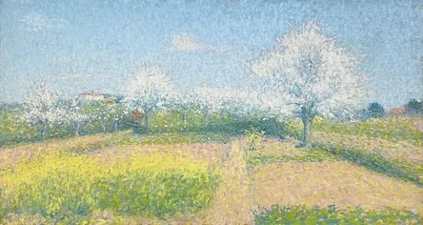 Notre tableau, Verger de l'Ariste, bien que datant de 1925, semble pencher davantage vers la technique divisionniste antérieure de Laugé. Ici, l'artiste dépeint un verger fleuri au début du printemps avec des couleurs vives et lumineuses appliquées par touches rapides. En arrière-plan, on aperçoit des maisons de campagne, facilement discernables par l'orange vif de leurs toits. Le bleu clair du ciel, les verts et les jaunes du champ, ainsi que le blanc cotonneux des arbres en fleurs créent une peinture vibrante et joyeuse qui semble vibrer d'énergie.