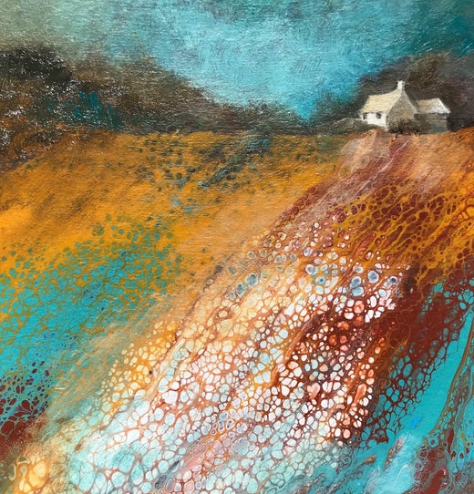 Pastel Meadow est une peinture de paysage originale inspirée par la jolie campagne de l'Oxfordshire où Cathryn aime se promener quotidiennement. La peinture aqueuse a été versée sur la toile et inclinée pour créer l'effet dramatique de prairie. Le point focal de la petite maison et du soleil attire le regard du spectateur vers le haut, tandis que le champ lointain ajoute de la profondeur à l'horizon. Des éclats de couleurs pastel, dont le rose et l'orange, suggèrent des fleurs sauvages pour ajouter de l'intérêt au premier plan.
