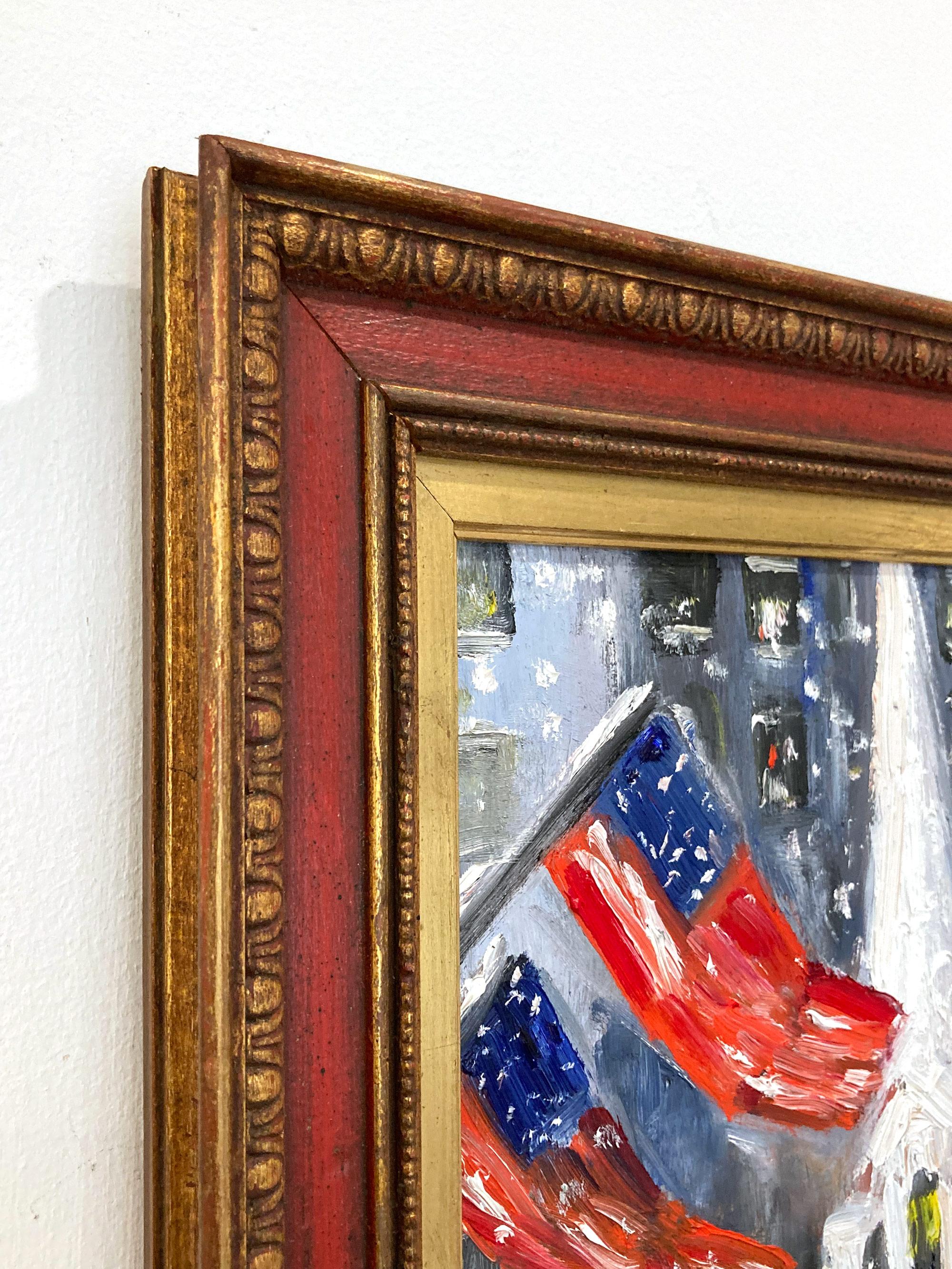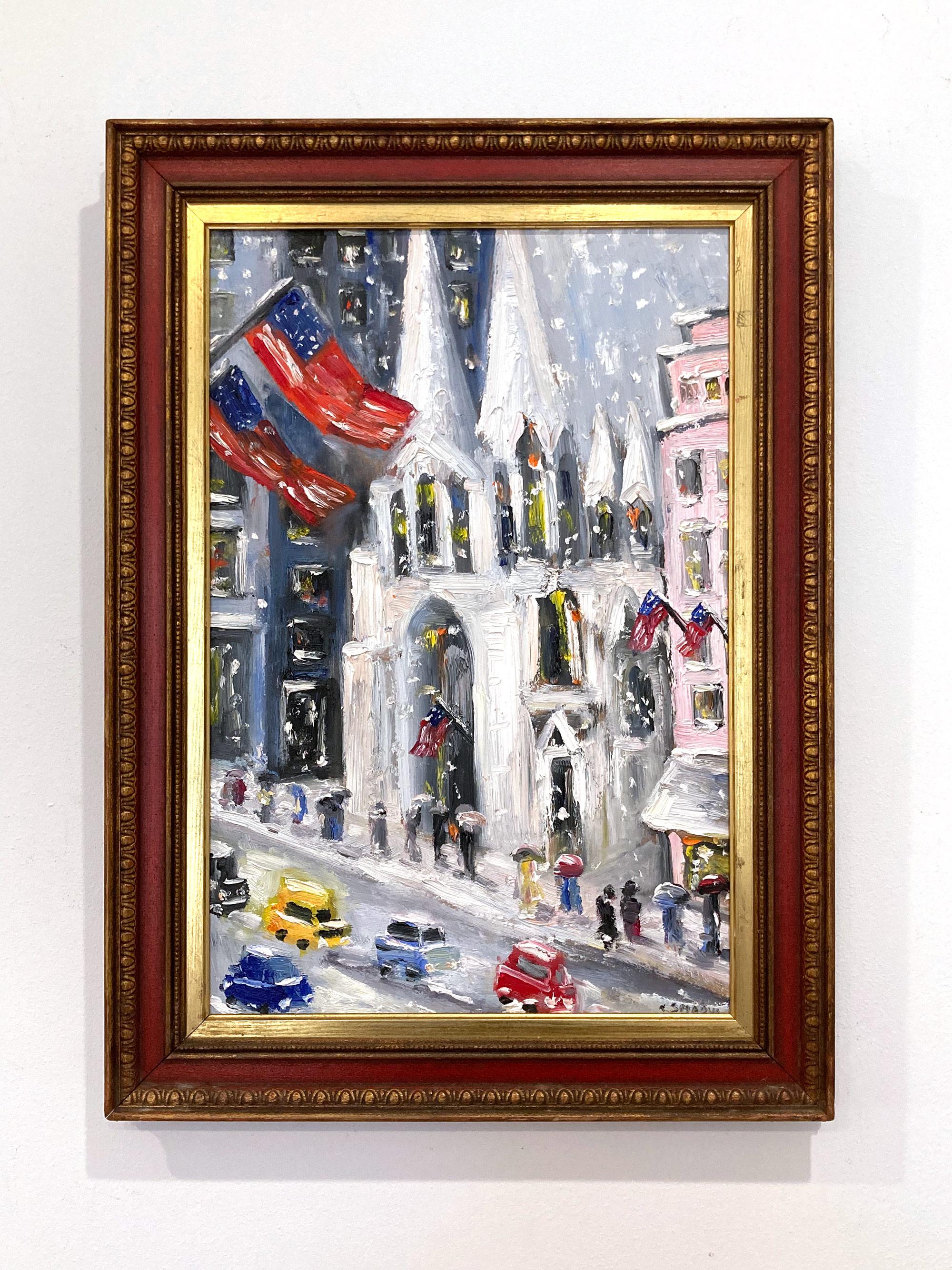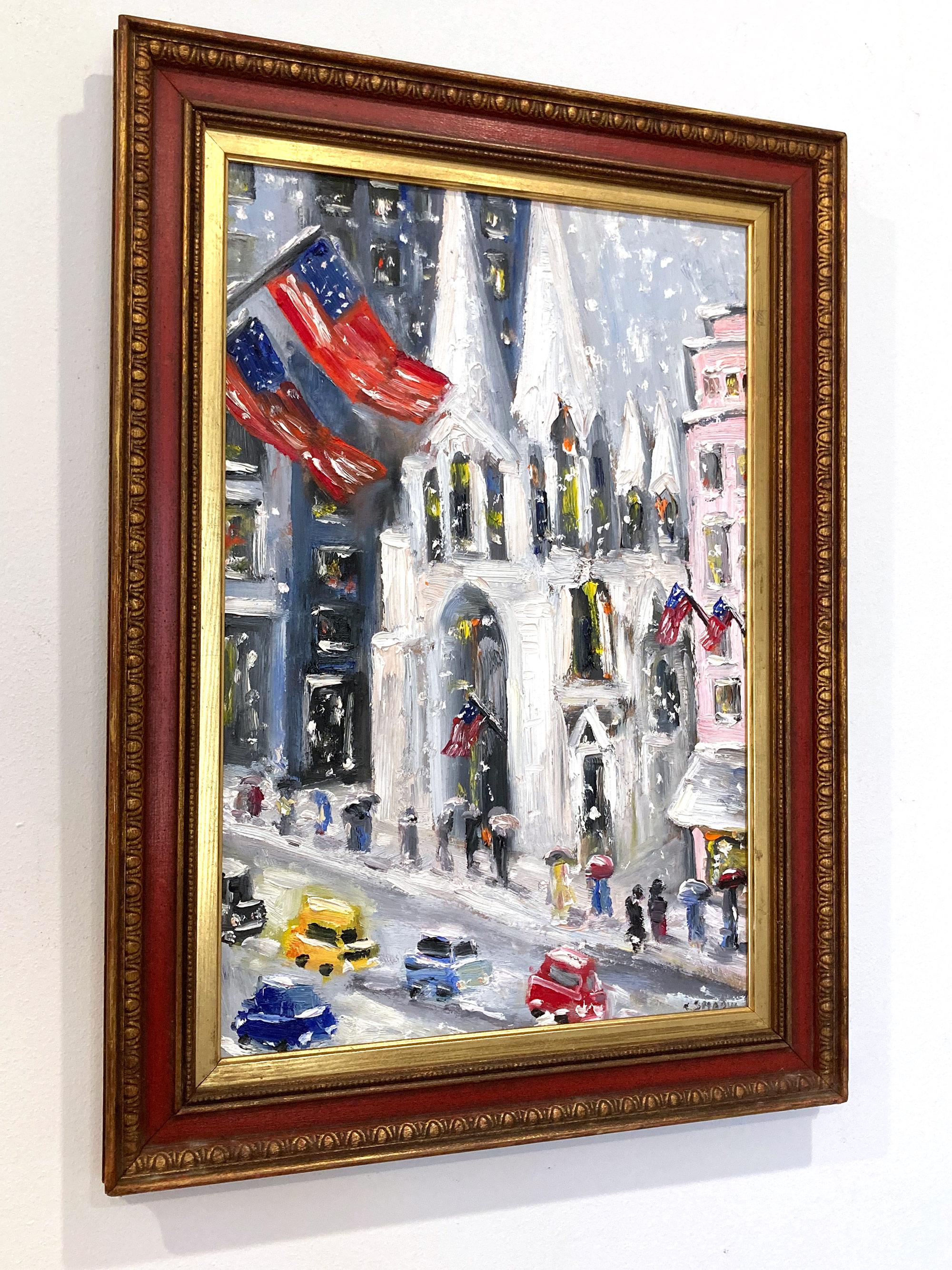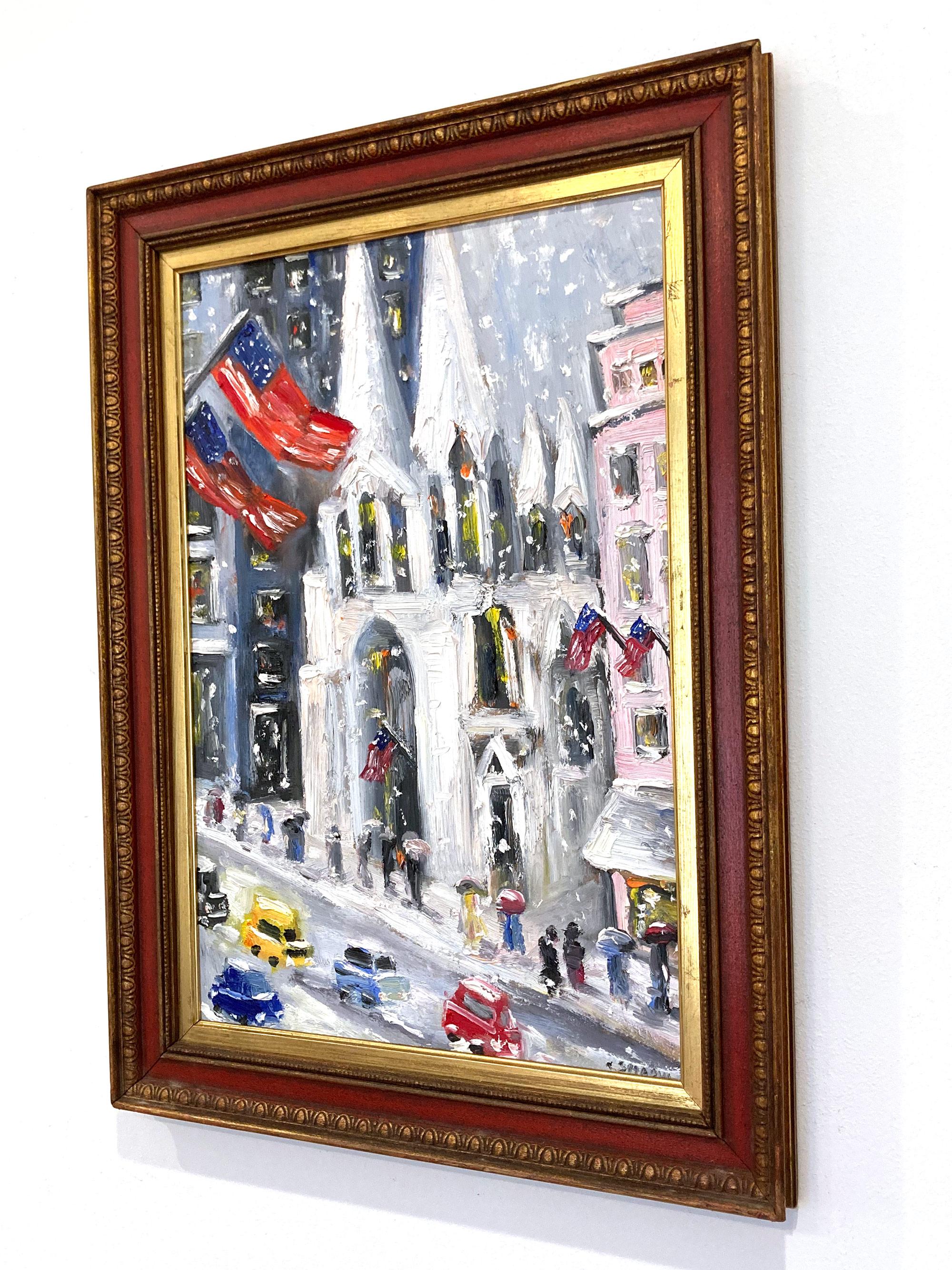 Une charmante représentation de la cathédrale Saint-Patrick sur la 5e avenue dans la neige avec des personnages et des voitures. Cette scène évocatrice de l'hiver urbain capture les flèches majestueuses de la cathédrale Saint-Patrick s'élevant de façon spectaculaire dans un ciel sombre et chargé de neige à New York. Peinte dans un style audacieux et empâté, avec des coups de pinceau épais et texturés, la composition est pleine d'énergie et de mouvement. Les drapeaux américains flottent vigoureusement dans le vent, leurs étoiles et leurs rayures se déclinant dans des rouges, des blancs et des bleus éclatants qui se détachent sur les gris et les blancs atténués des chutes de neige. Une scène impressionniste chaleureuse inspirée par Guy Wiggins. Cette pièce capture l'essence de la vie dans la ville de New York, et bien plus encore. Dynamique et doux, on est attiré par les couleurs et la peinture à l'huile épaisse et texturée. Elle est présentée dans un cadre ancien avec un fil de suspension au verso.