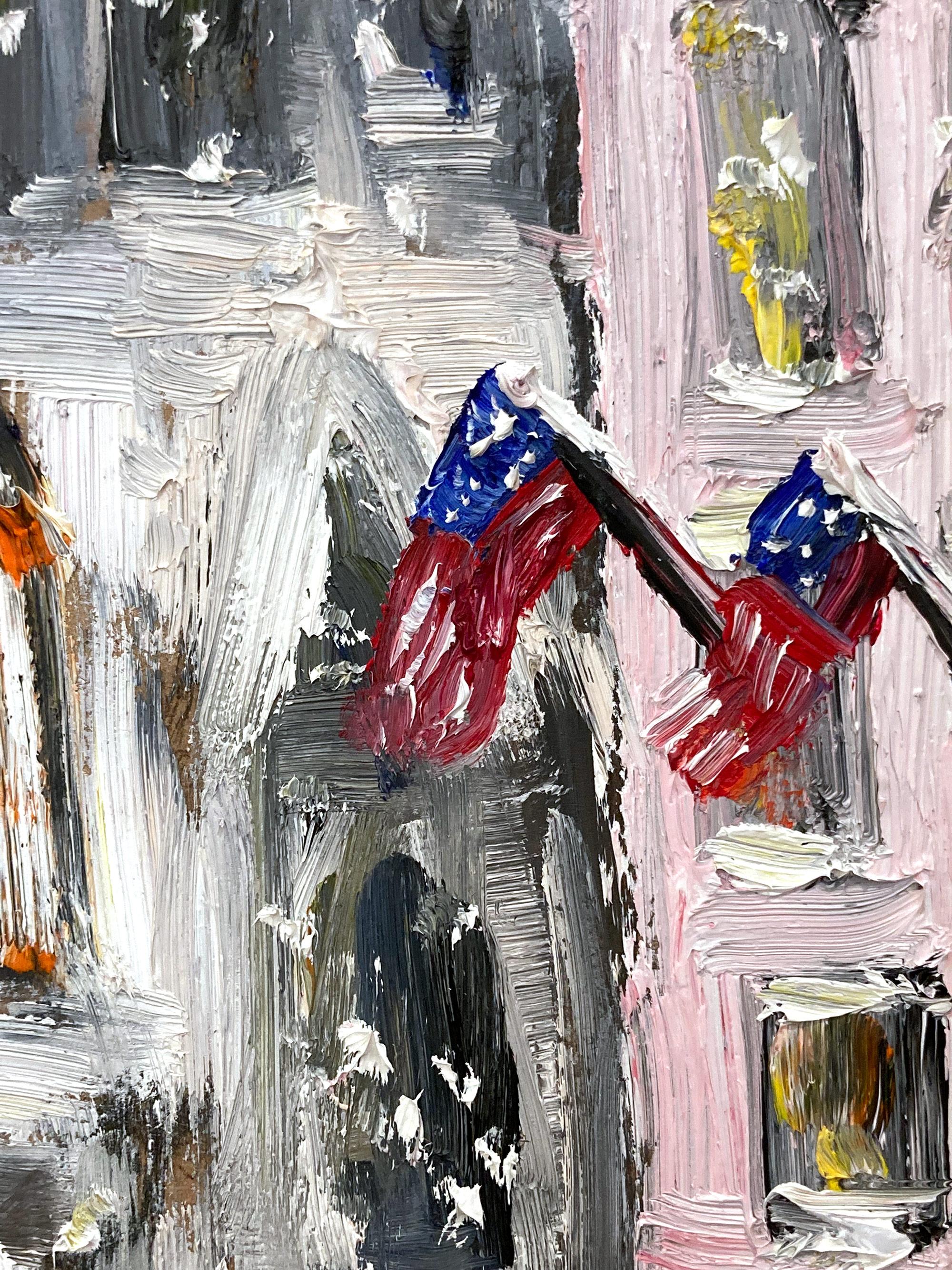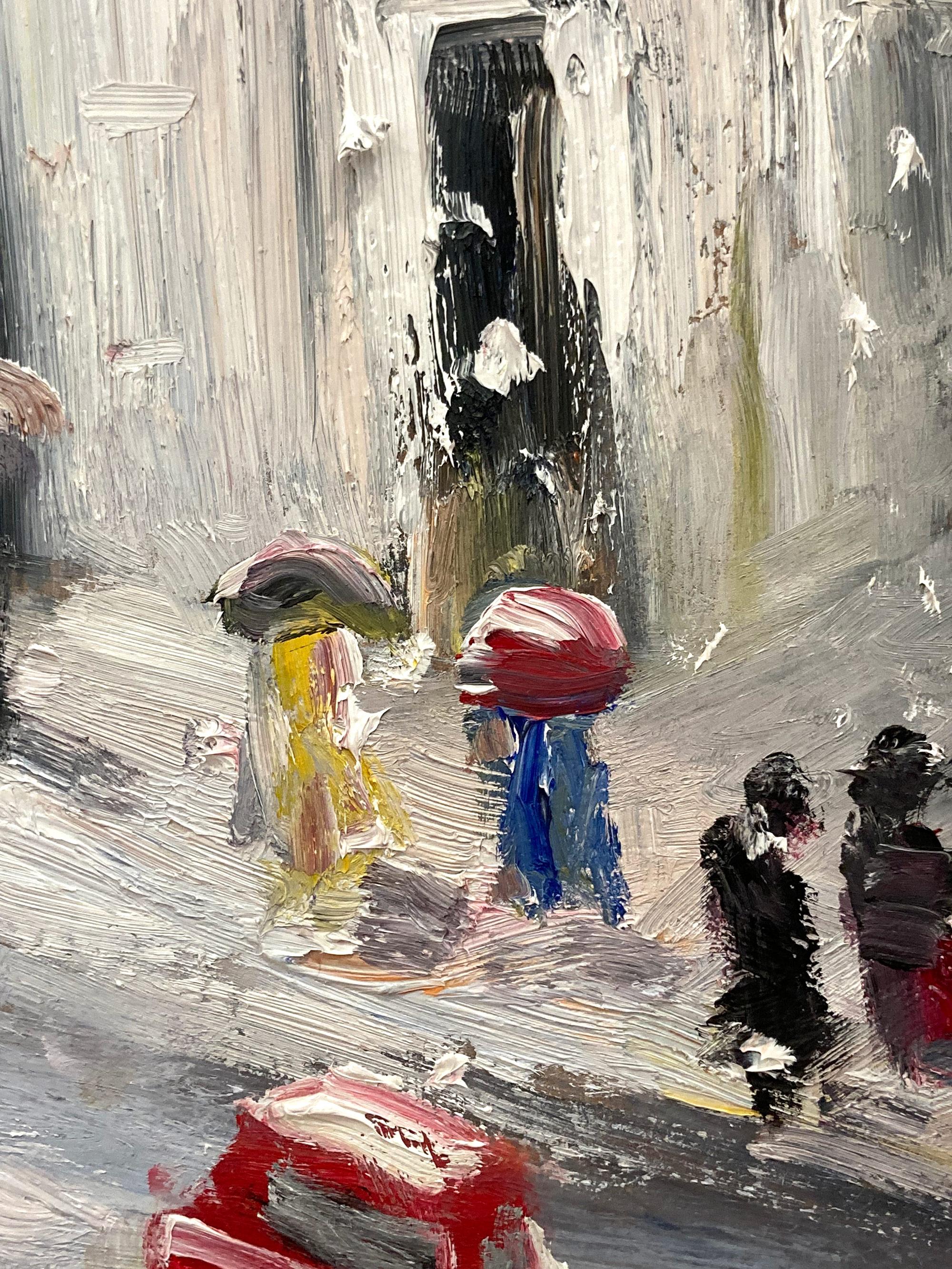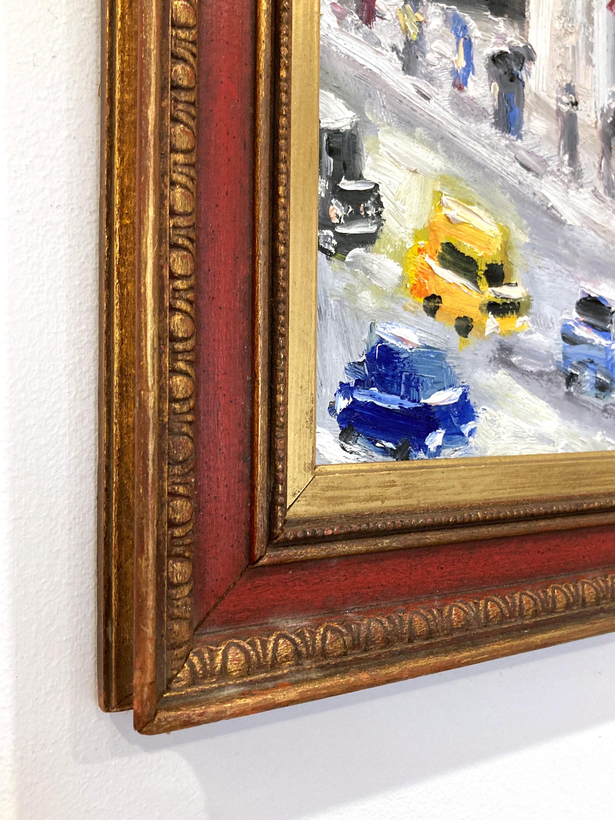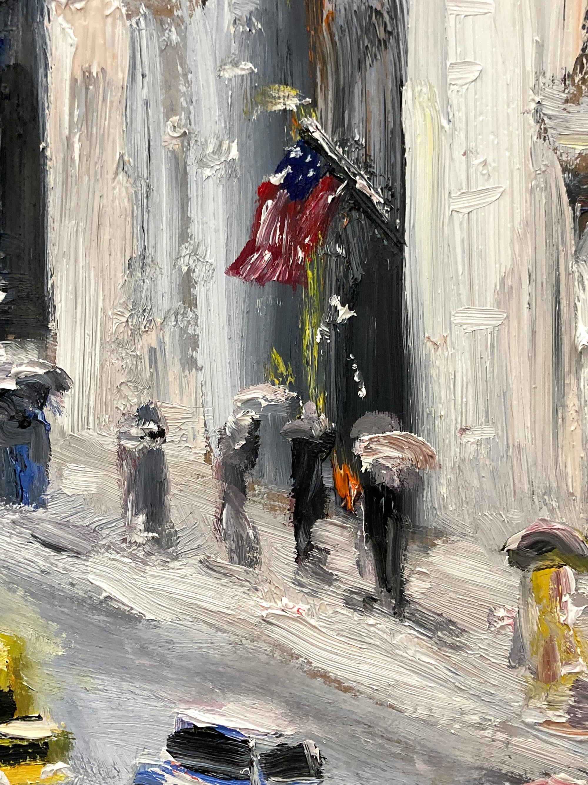 Une charmante représentation de la cathédrale Saint-Patrick sur la 5e avenue dans la neige avec des personnages et des voitures. Cette scène évocatrice de l'hiver urbain capture les flèches majestueuses de la cathédrale Saint-Patrick s'élevant de façon spectaculaire dans un ciel sombre et chargé de neige à New York. Peinte dans un style audacieux et empâté, avec des coups de pinceau épais et texturés, la composition est pleine d'énergie et de mouvement. Les drapeaux américains flottent vigoureusement dans le vent, leurs étoiles et leurs rayures se déclinant dans des rouges, des blancs et des bleus éclatants qui se détachent sur les gris et les blancs atténués des chutes de neige. Une scène impressionniste chaleureuse inspirée par Guy Wiggins. Cette pièce capture l'essence de la vie dans la ville de New York, et bien plus encore. Dynamique et doux, on est attiré par les couleurs et la peinture à l'huile épaisse et texturée. Elle est présentée dans un cadre ancien avec un fil de suspension au verso.