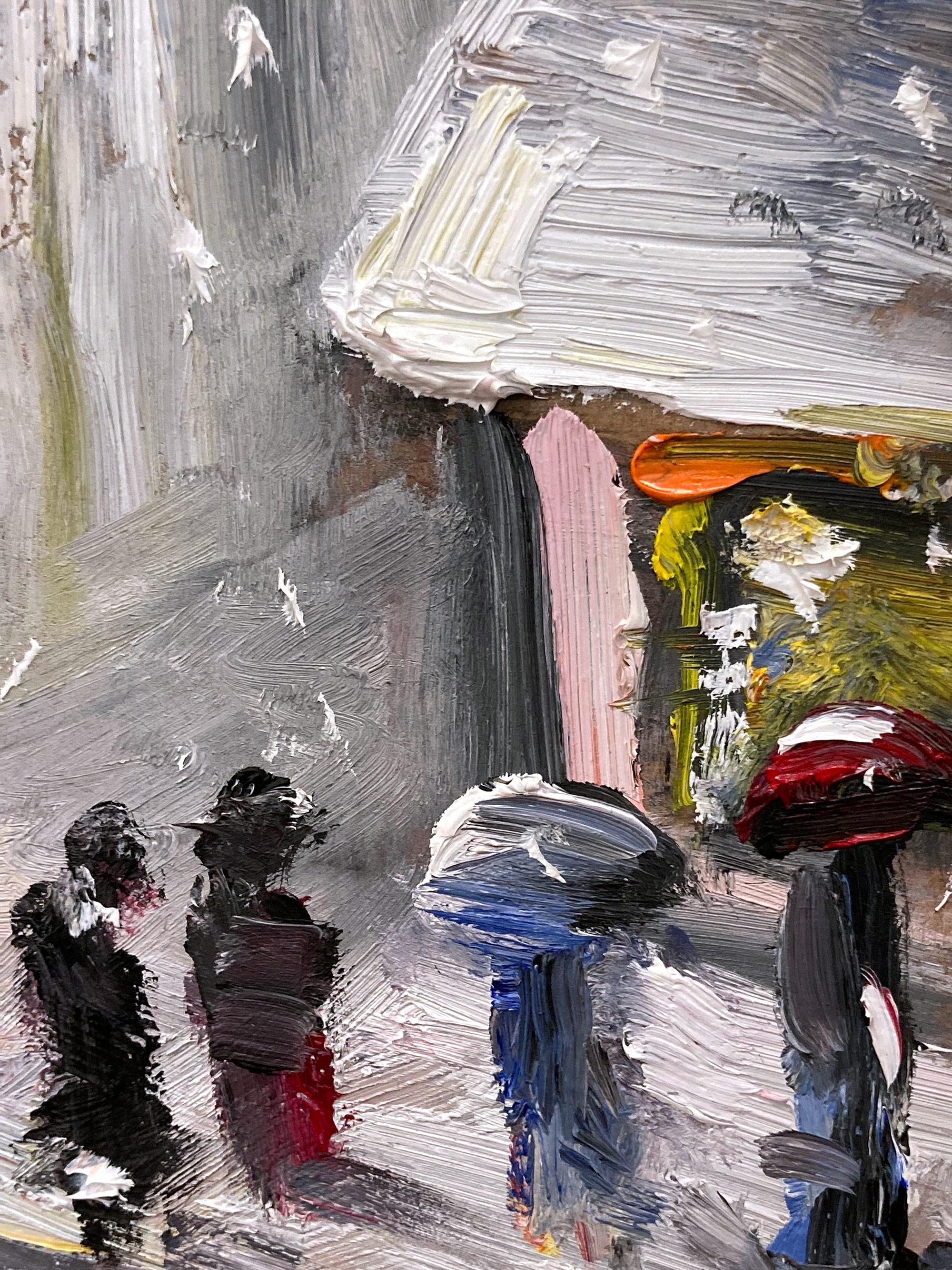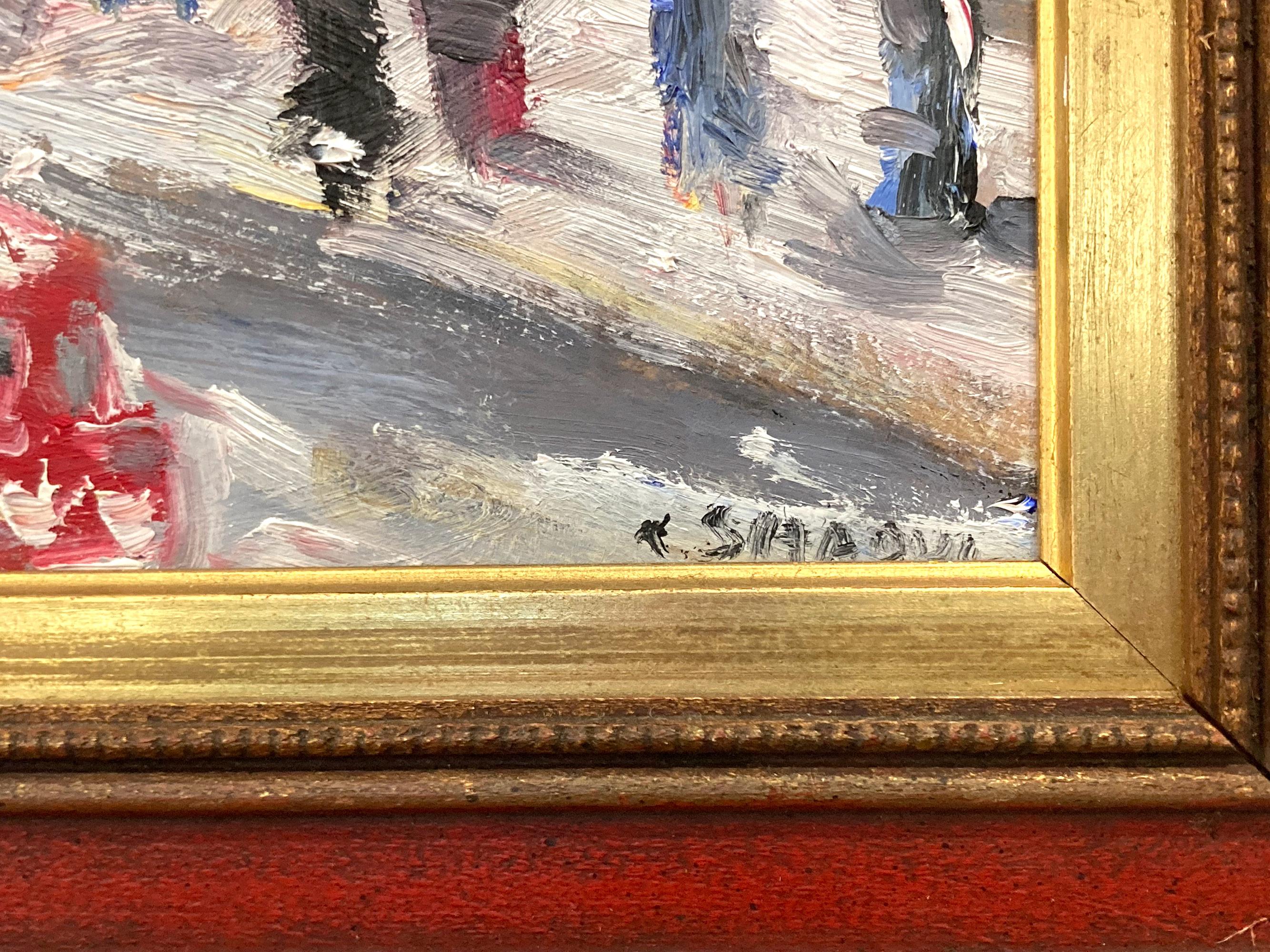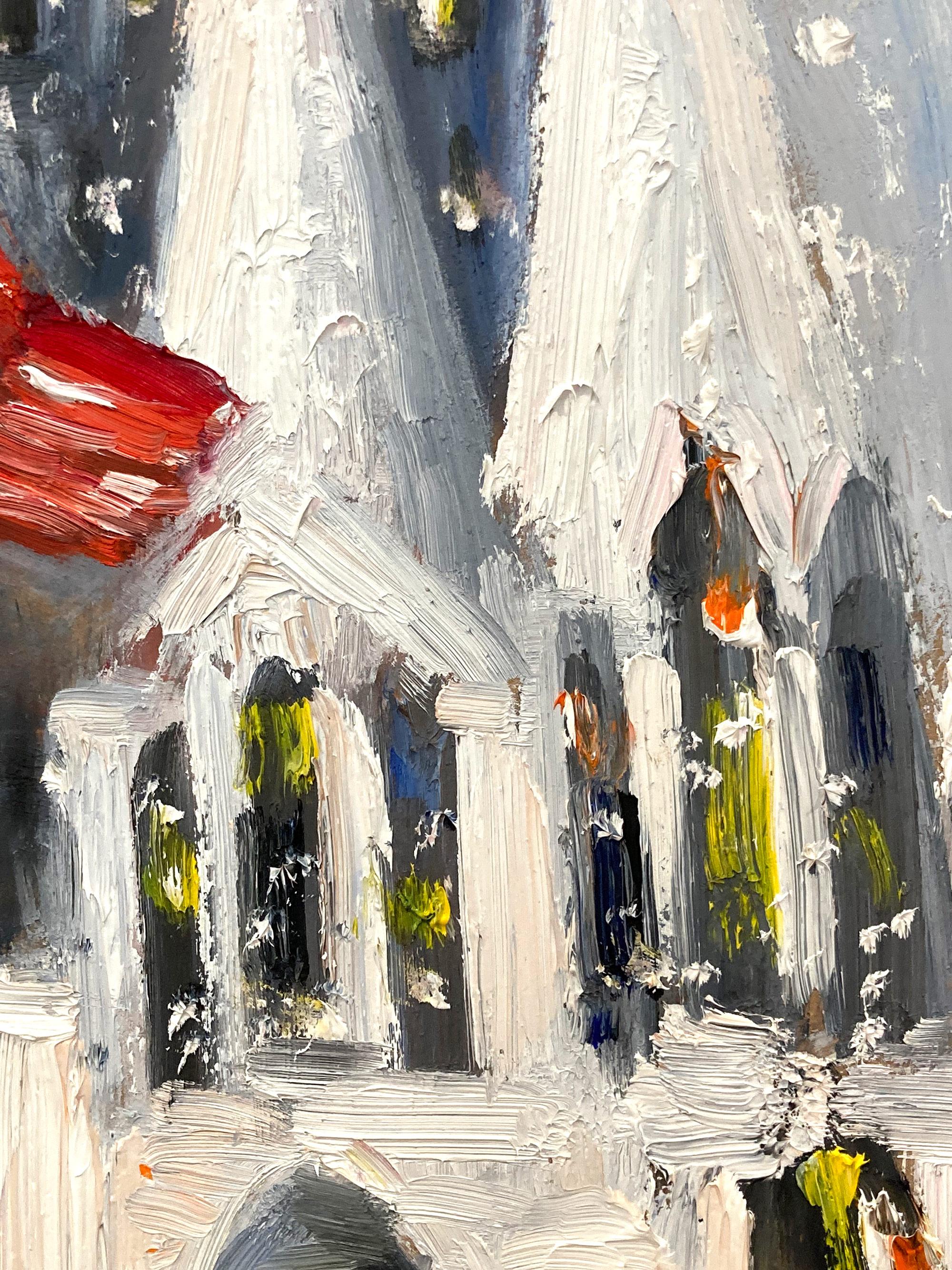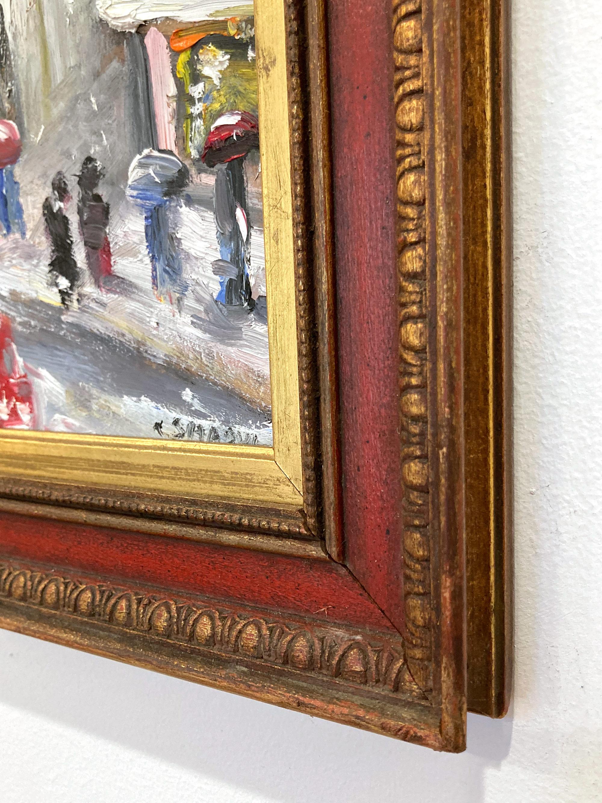 Une charmante représentation de la cathédrale Saint-Patrick sur la 5e avenue dans la neige avec des personnages et des voitures. Cette scène évocatrice de l'hiver urbain capture les flèches majestueuses de la cathédrale Saint-Patrick s'élevant de façon spectaculaire dans un ciel sombre et chargé de neige à New York. Peinte dans un style audacieux et empâté, avec des coups de pinceau épais et texturés, la composition est pleine d'énergie et de mouvement. Les drapeaux américains flottent vigoureusement dans le vent, leurs étoiles et leurs rayures se déclinant dans des rouges, des blancs et des bleus éclatants qui se détachent sur les gris et les blancs atténués des chutes de neige. Une scène impressionniste chaleureuse inspirée par Guy Wiggins. Cette pièce capture l'essence de la vie dans la ville de New York, et bien plus encore. Dynamique et doux, on est attiré par les couleurs et la peinture à l'huile épaisse et texturée. Elle est présentée dans un cadre ancien avec un fil de suspension au verso.