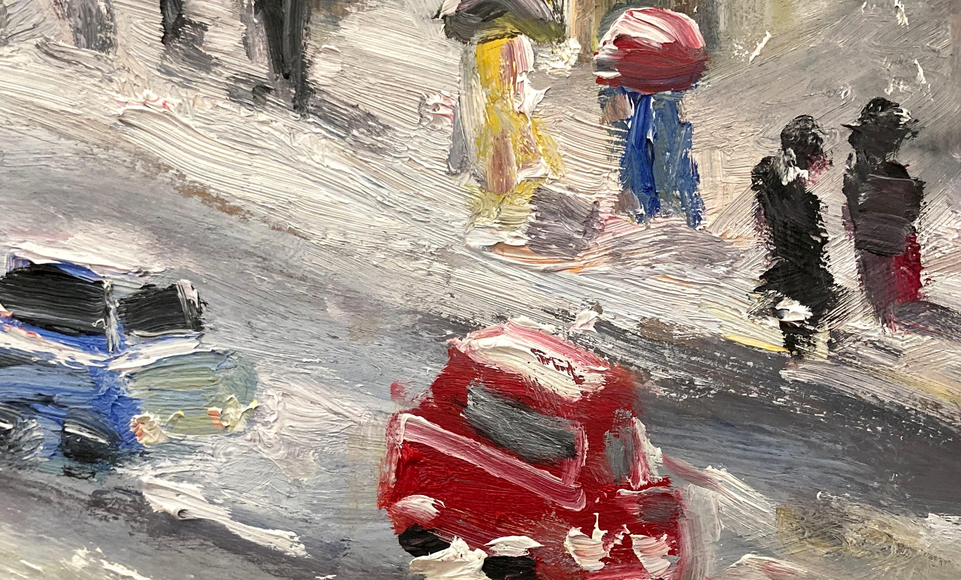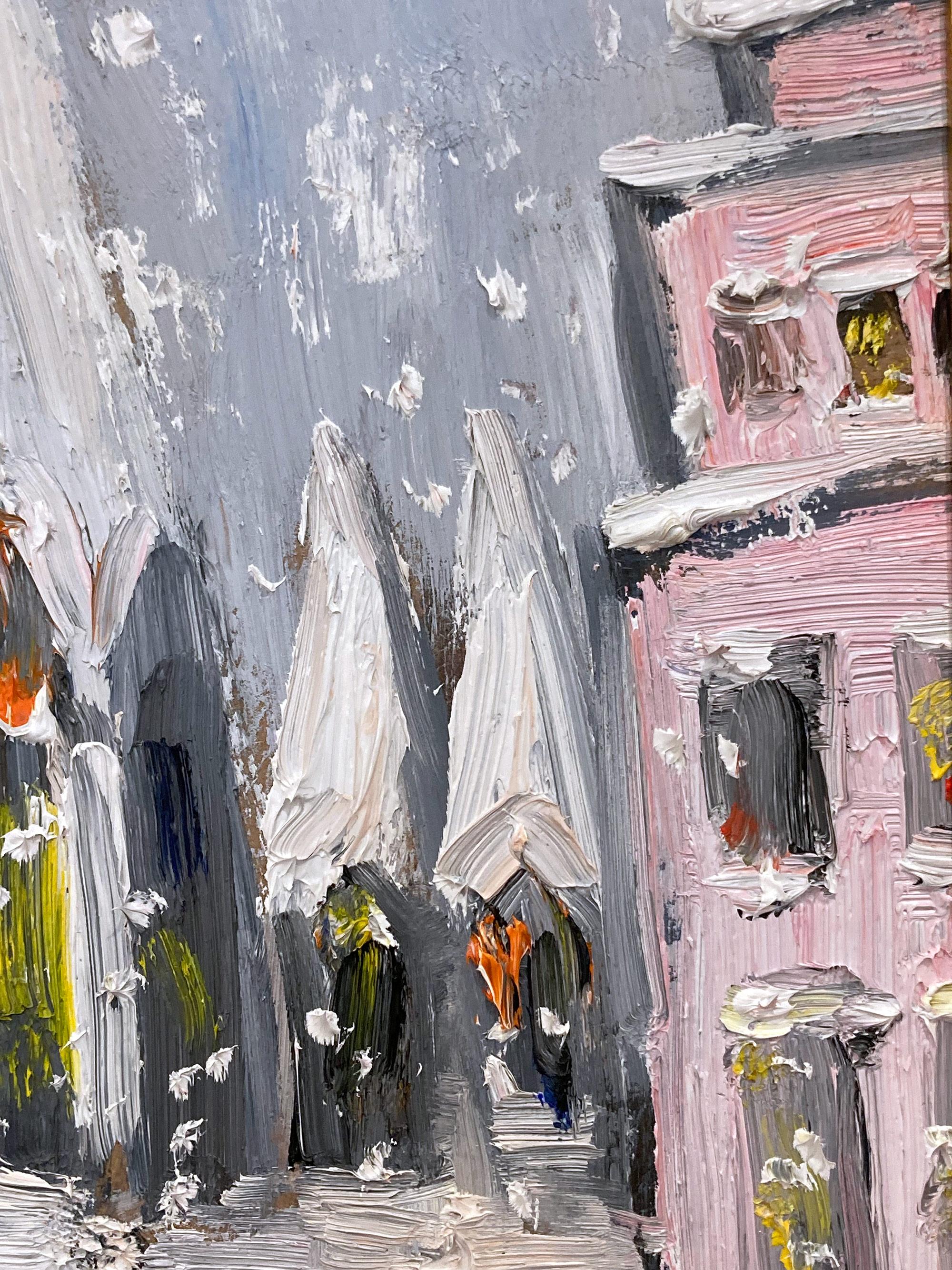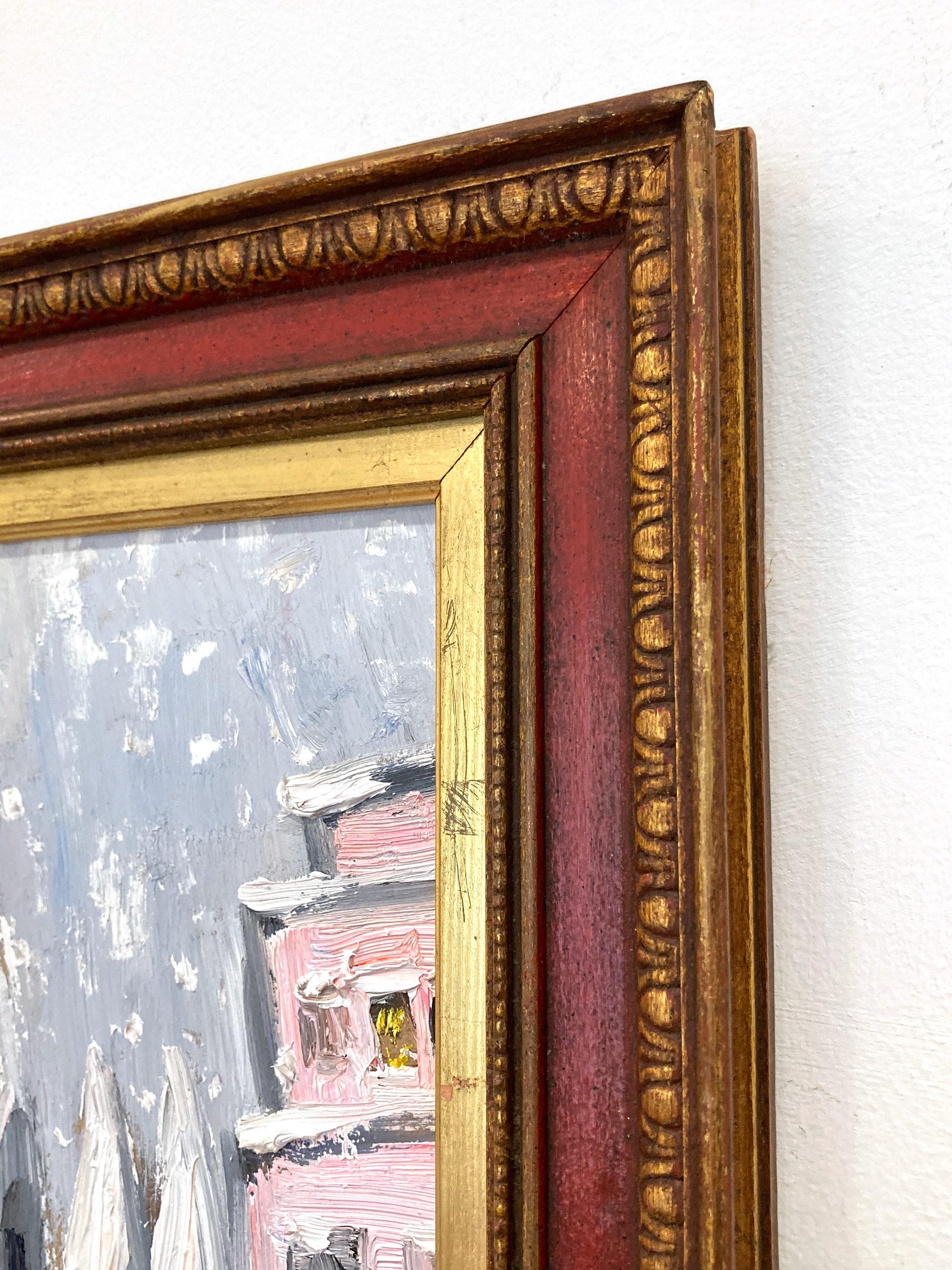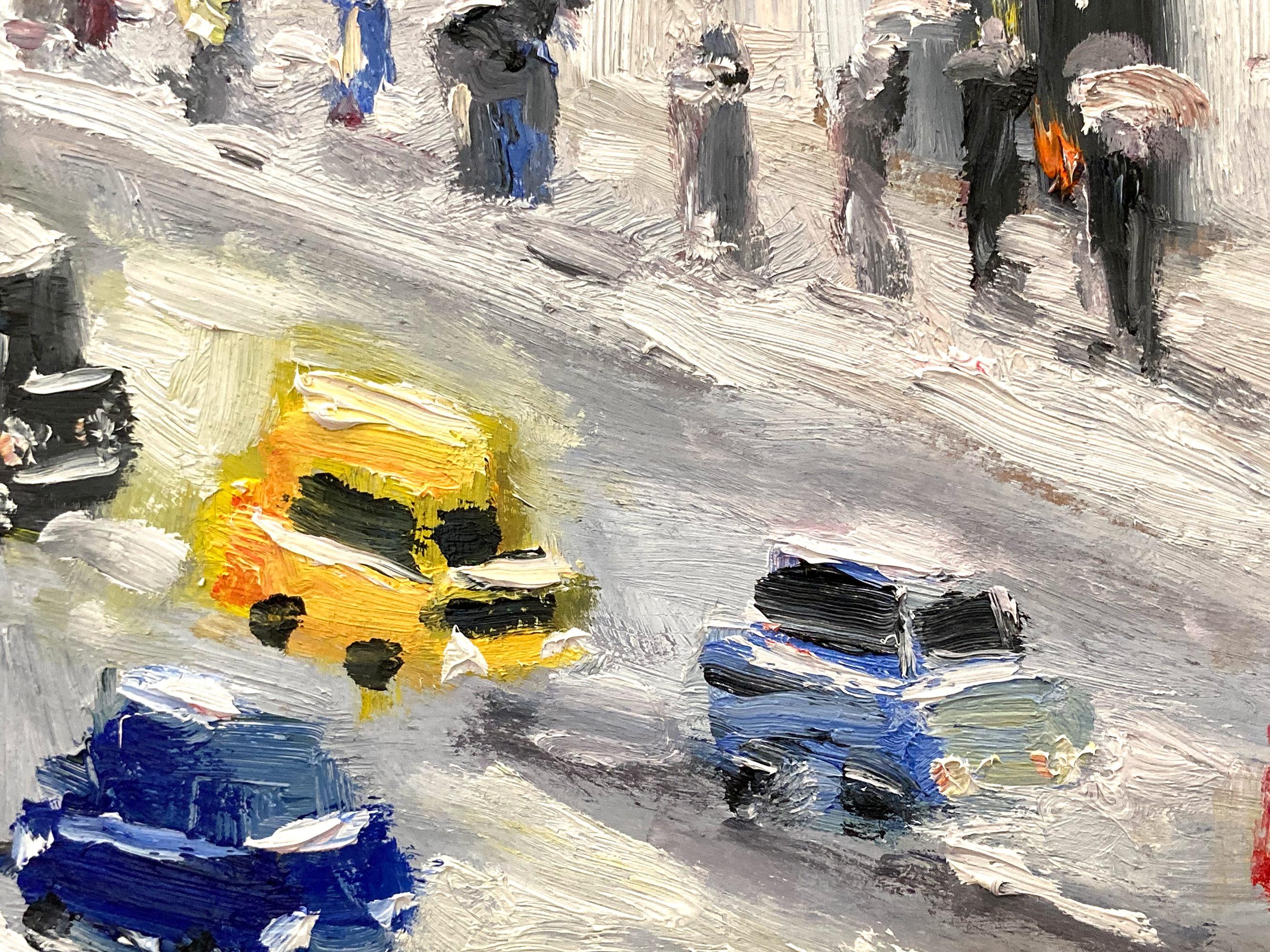 Une charmante représentation de la cathédrale Saint-Patrick sur la 5e avenue dans la neige avec des personnages et des voitures. Cette scène évocatrice de l'hiver urbain capture les flèches majestueuses de la cathédrale Saint-Patrick s'élevant de façon spectaculaire dans un ciel sombre et chargé de neige à New York. Peinte dans un style audacieux et empâté, avec des coups de pinceau épais et texturés, la composition est pleine d'énergie et de mouvement. Les drapeaux américains flottent vigoureusement dans le vent, leurs étoiles et leurs rayures se déclinant dans des rouges, des blancs et des bleus éclatants qui se détachent sur les gris et les blancs atténués des chutes de neige. Une scène impressionniste chaleureuse inspirée par Guy Wiggins. Cette pièce capture l'essence de la vie dans la ville de New York, et bien plus encore. Dynamique et doux, on est attiré par les couleurs et la peinture à l'huile épaisse et texturée. Elle est présentée dans un cadre ancien avec un fil de suspension au verso.