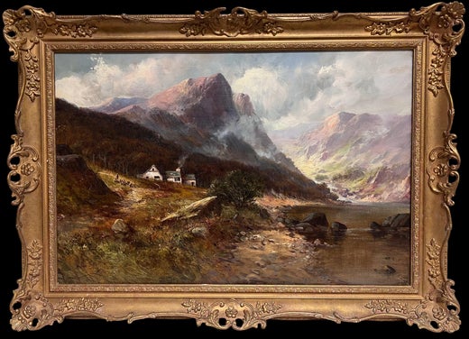 huile ancienne de paysage atmosphérique des Highlands écossais signée Loch Landscape