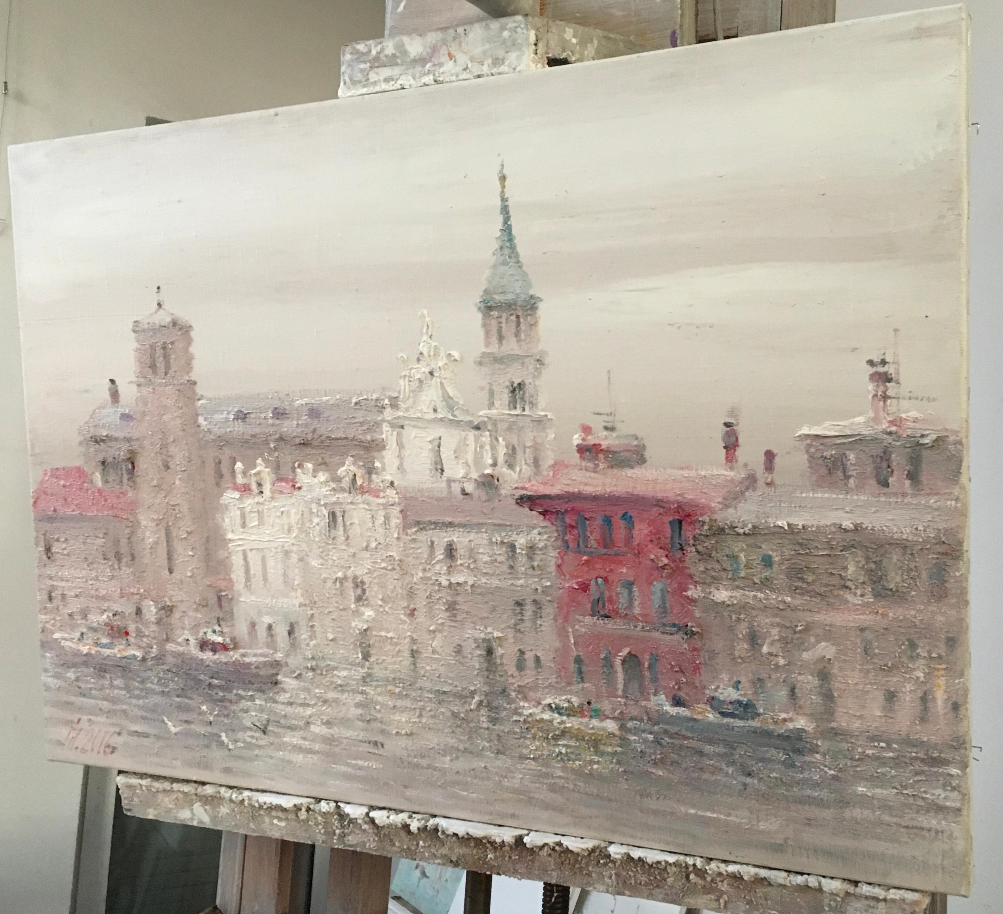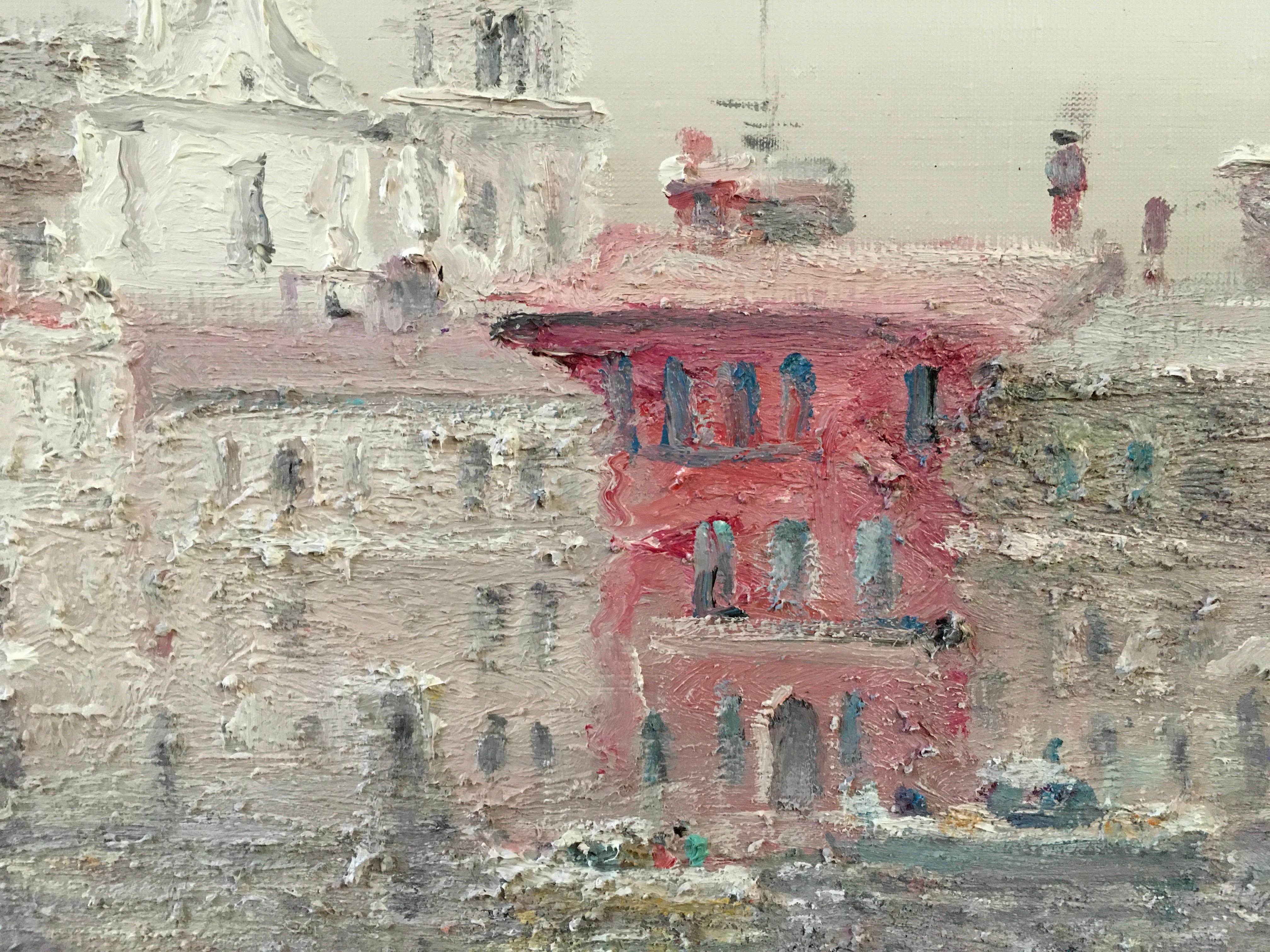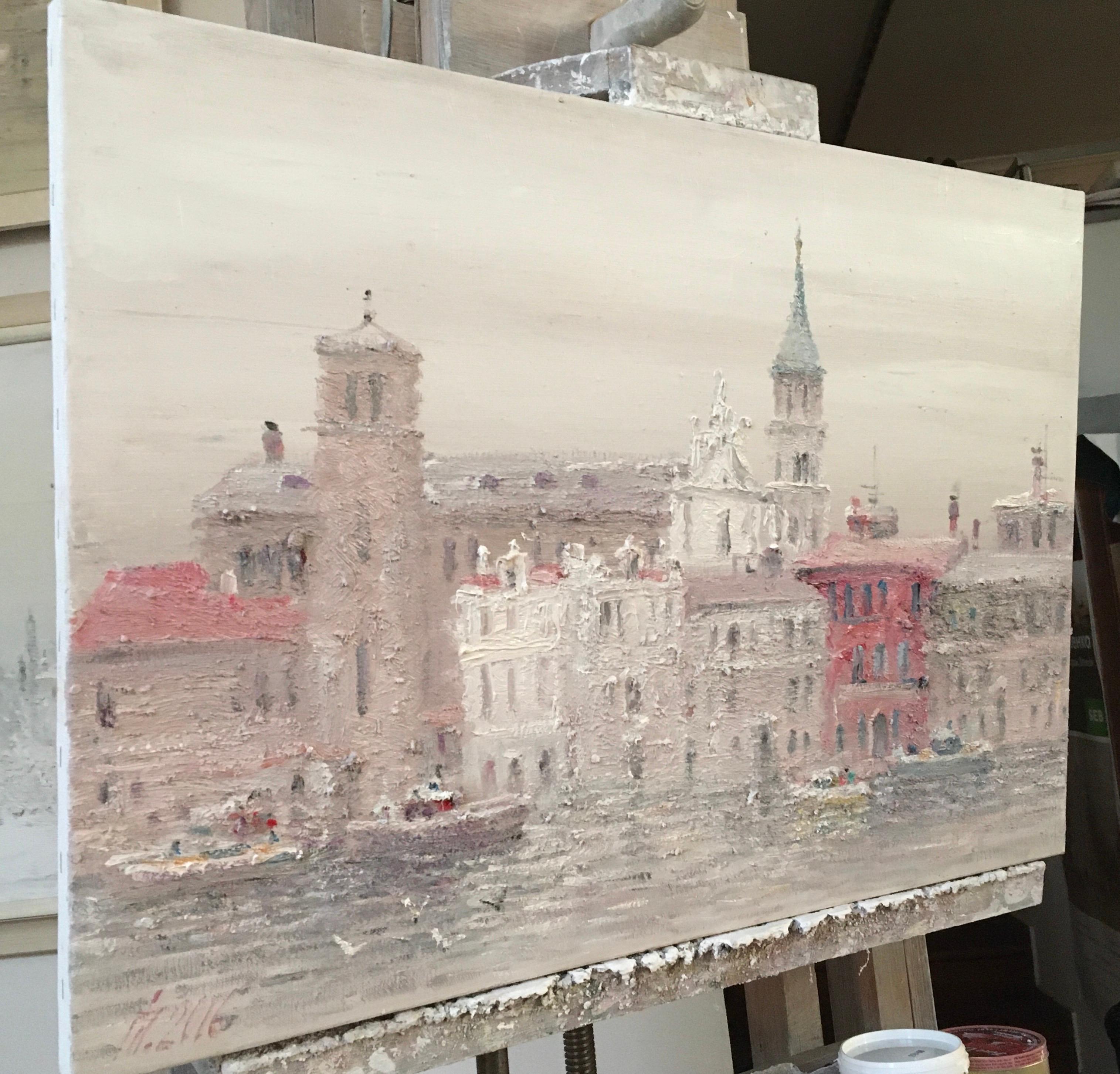 Il s'agit d'une peinture douce et atmosphérique, exécutée dans des tons pastel et feutrés qui donnent l'impression d'une légère brume au-dessus de la ville. La toile représente un ca...
