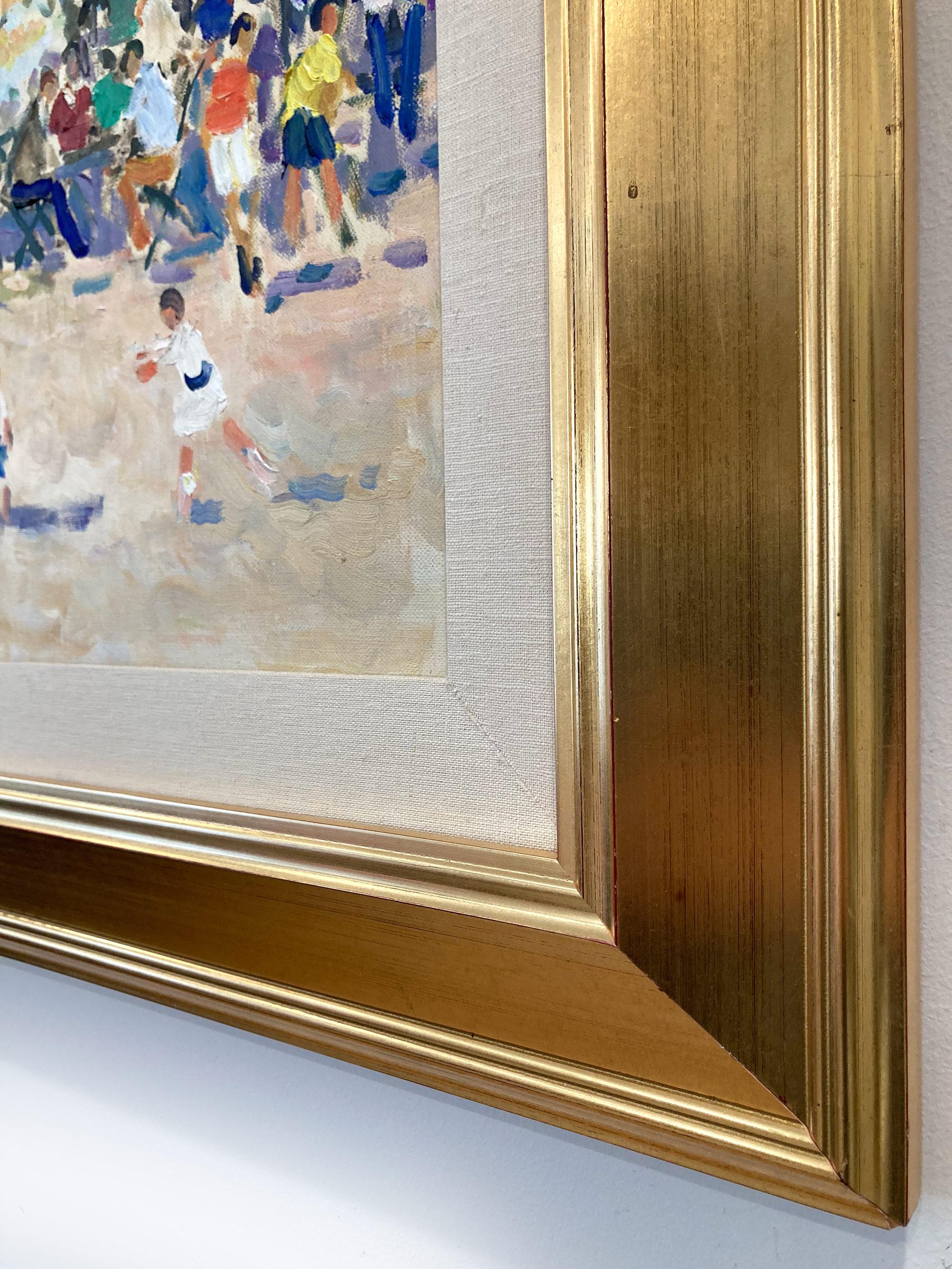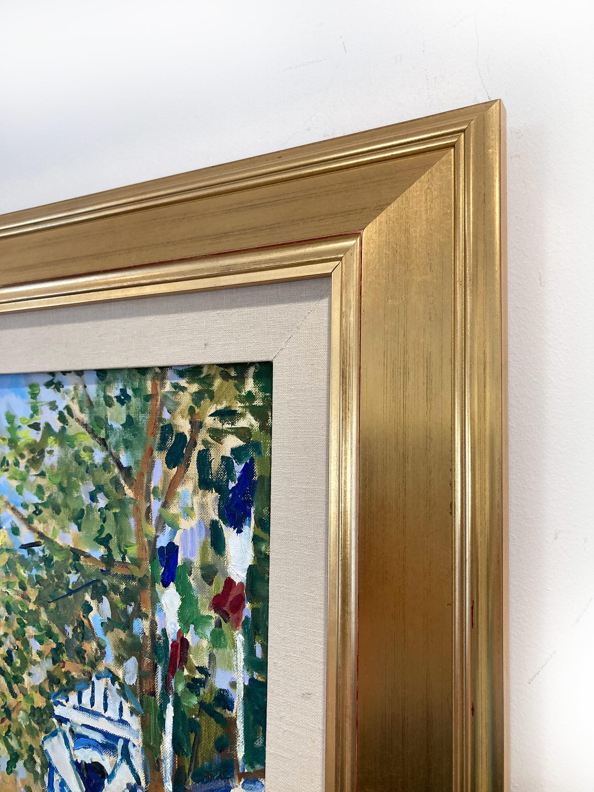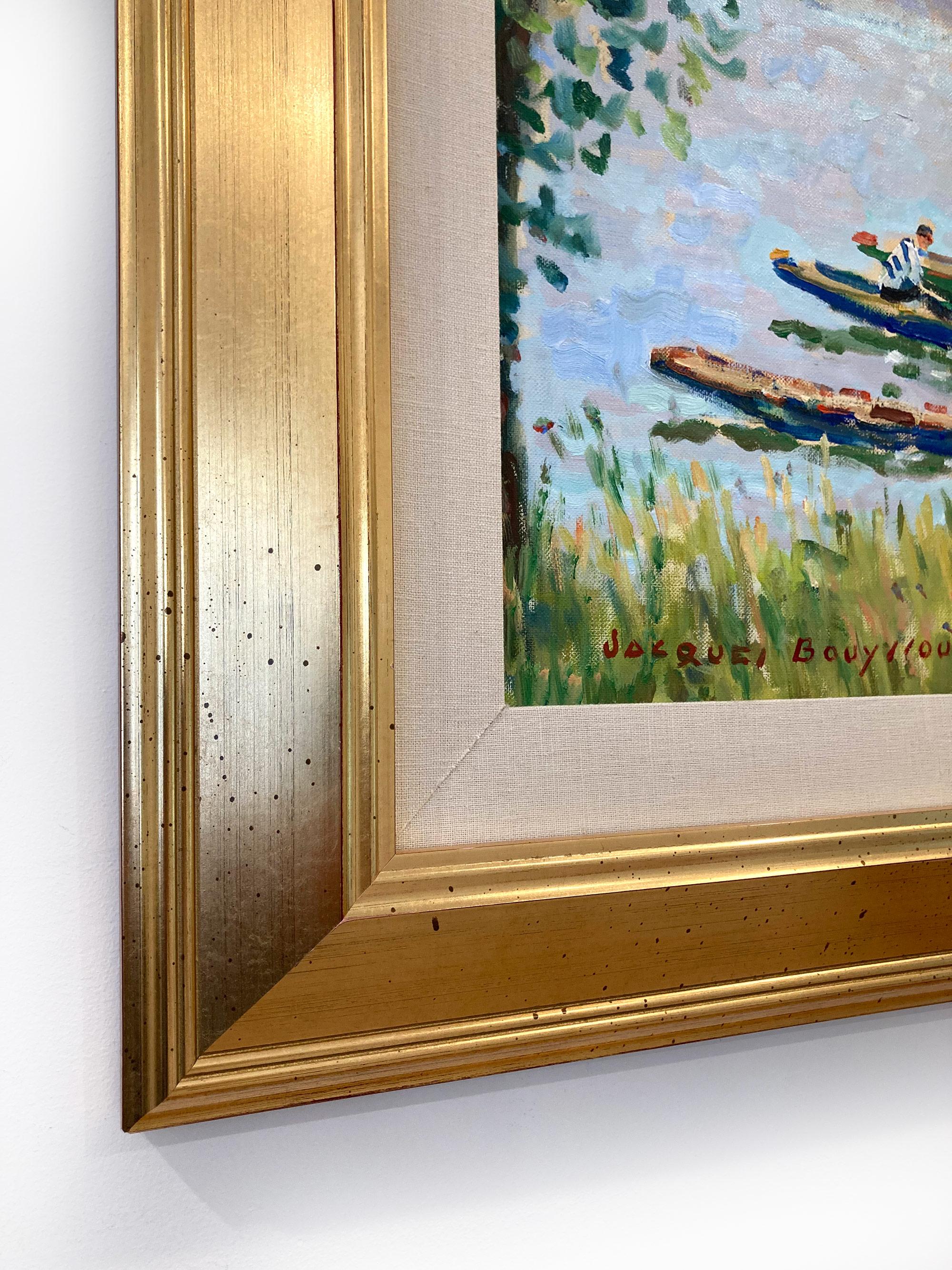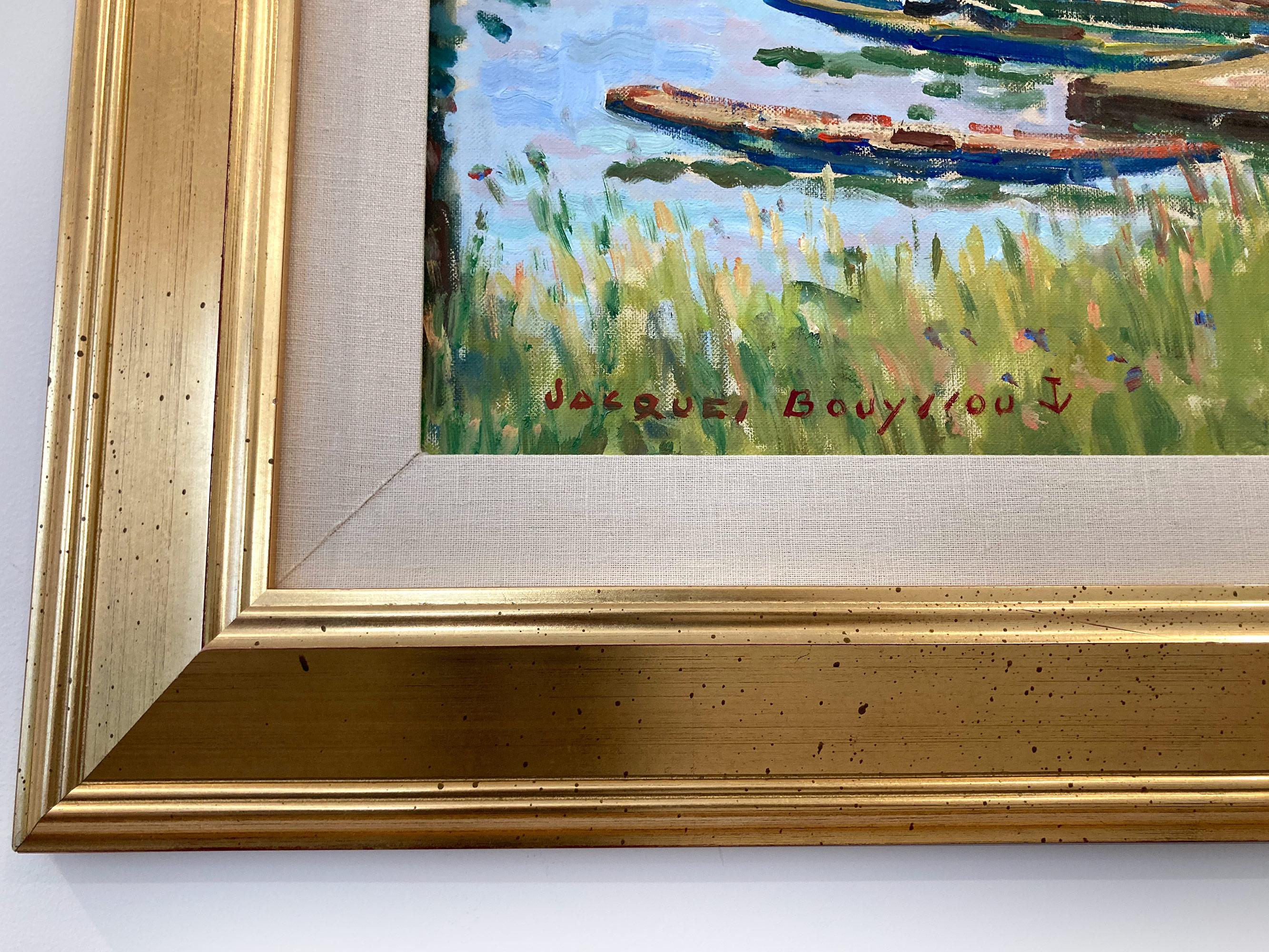 A stunning depiction of a lively scene in Paris "Le Dimanche Au Bord De La Marne". There are boats situated on the water docked with sails in the distance on a Sunday on the banks of the Marne. The trees envelope the scene with a busy path with children playing. A charming colorful European view of the Marne. Bouyssou was mostly known for his playful and highly trained hand in paintings executed with thick use of paint and sporadic, yet controlled brushwork. His wonderful use of light and shadow is exhibited beautifully as we can feel the time of day and the atmosphere effortlessly. This painting is signed lower left and comes displayed in a stunning gold tone frame with hanging wire on verso.