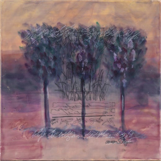 Paysage abstrait complexe et stratifié de Lauren Ohlgren (Américaine, née en 1959). À la base, cette pièce est un paysage abstrait, avec des arbres violets et verts saturés. Des croquis d'arbres, de feuilles et d'autres motifs sont superposés, avec une dernière couche de surlignage au crayon de couleur blanc.