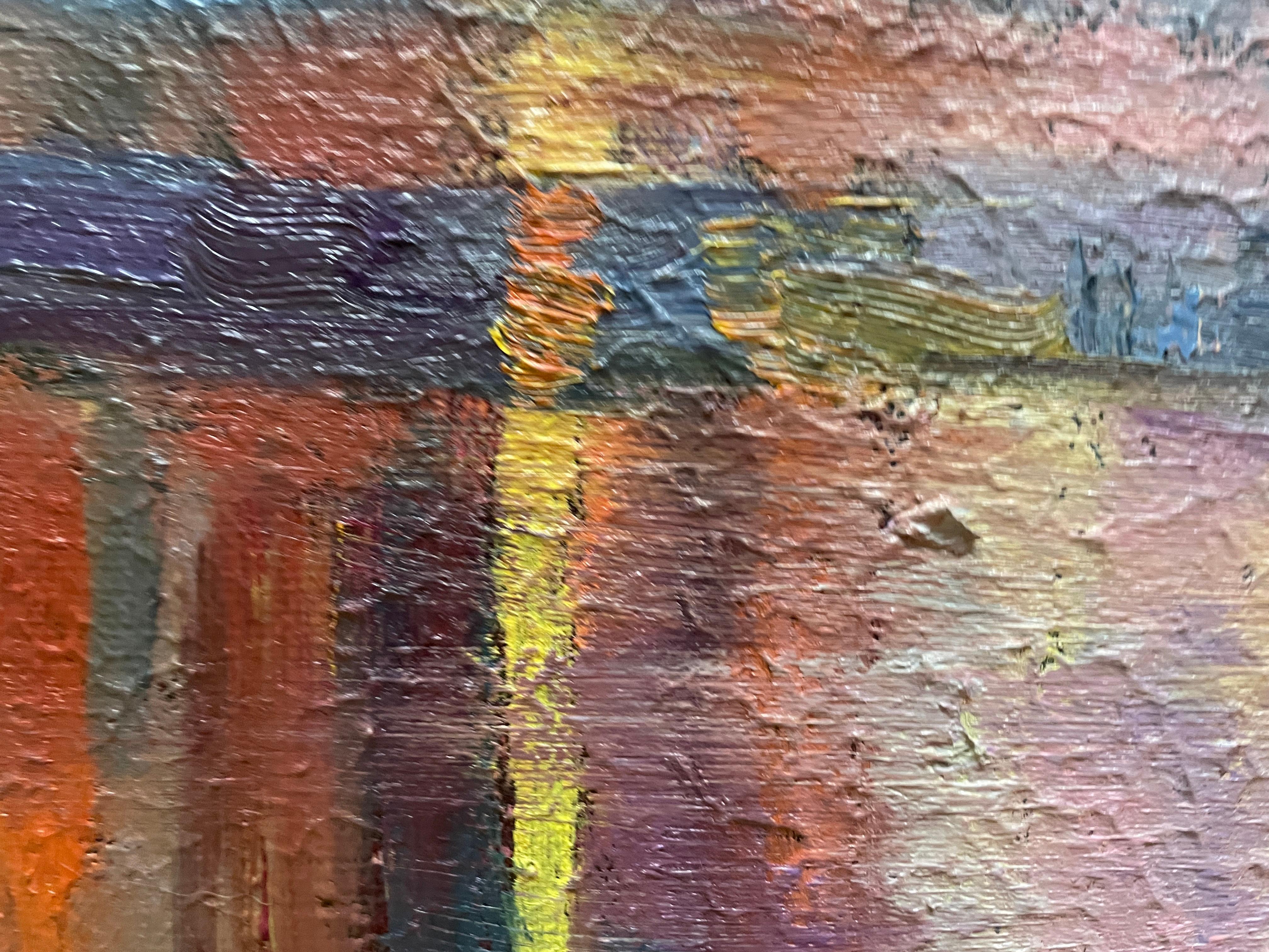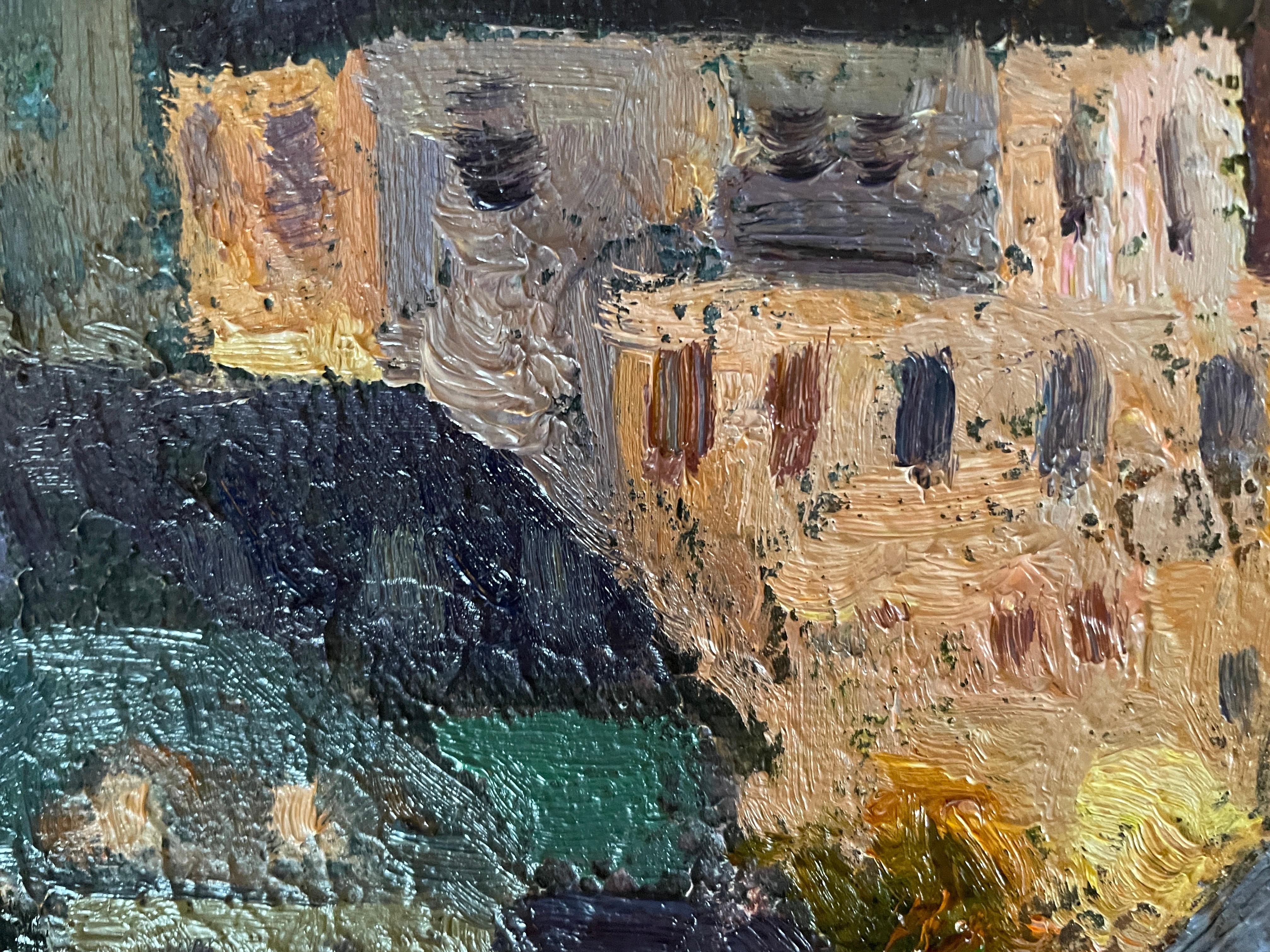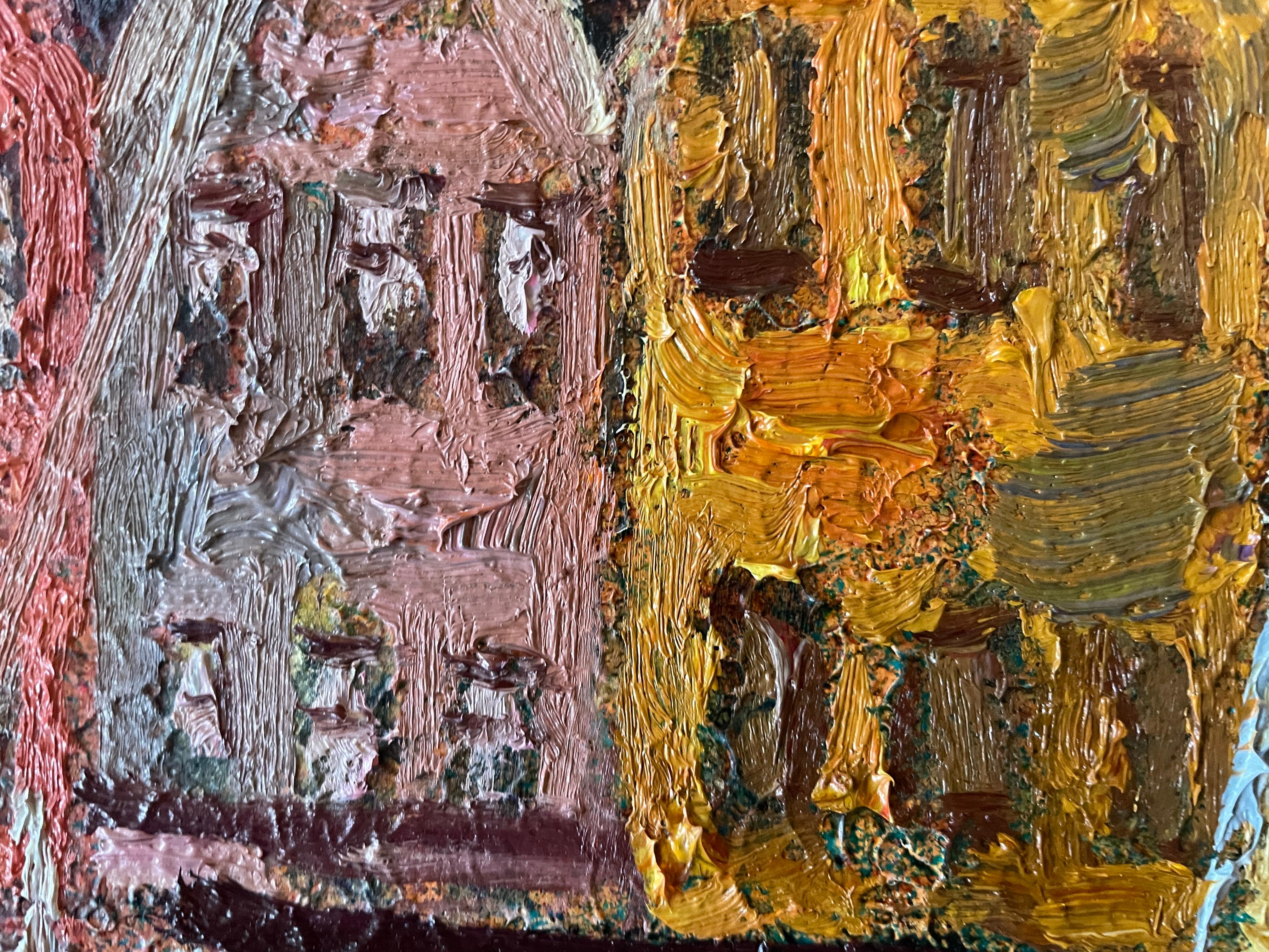 été à Bergen" Paysage urbain impressionniste original. Carré .Impasto