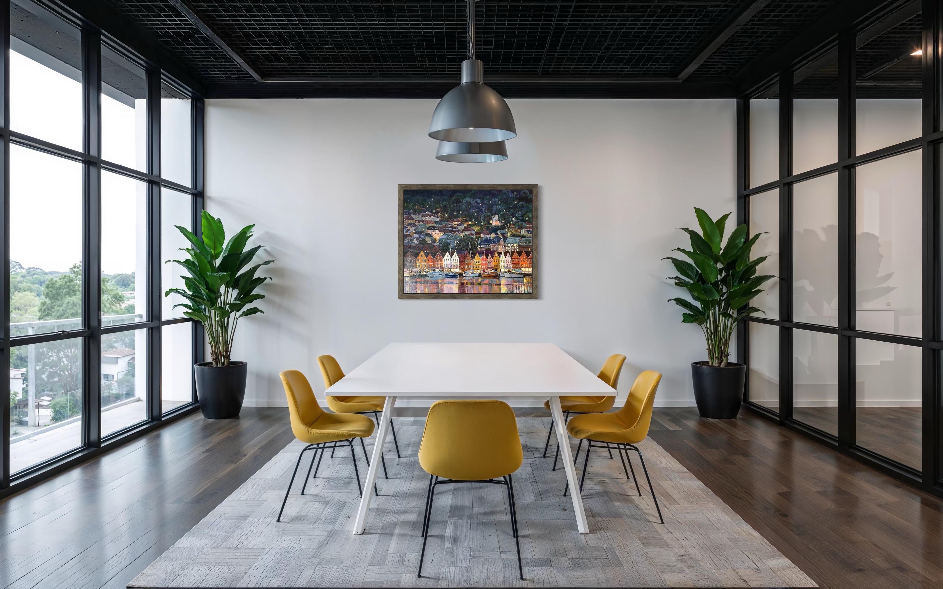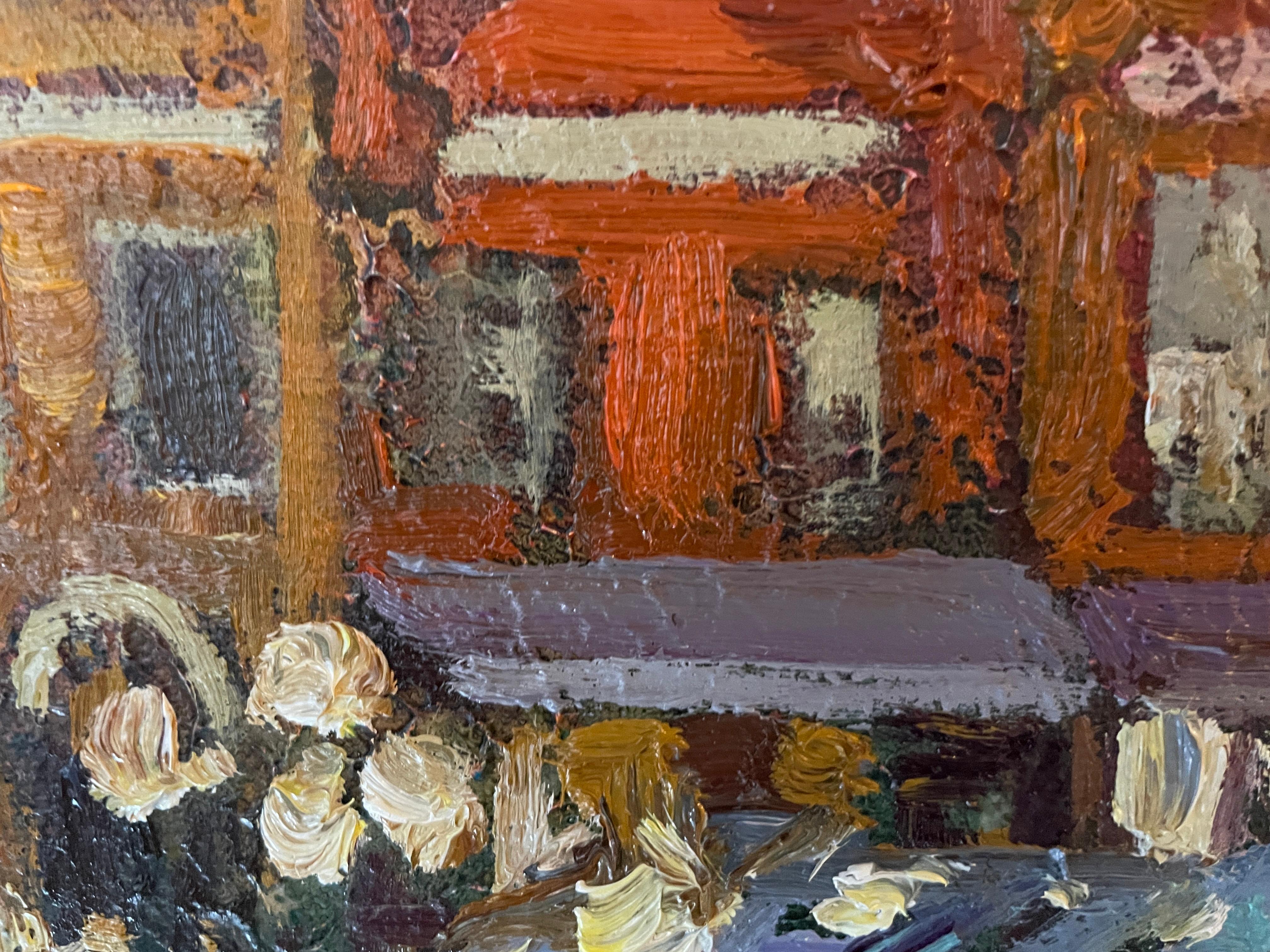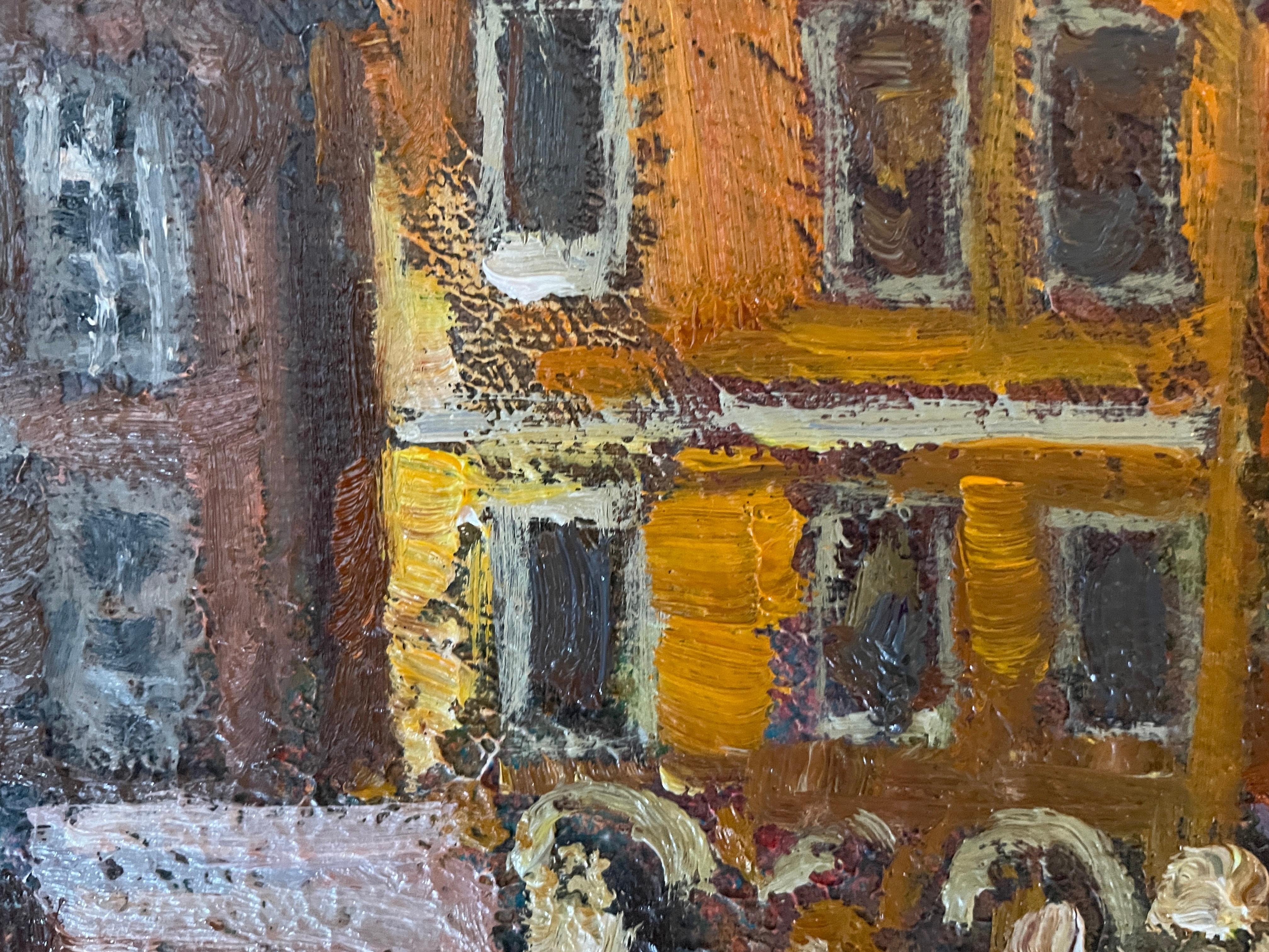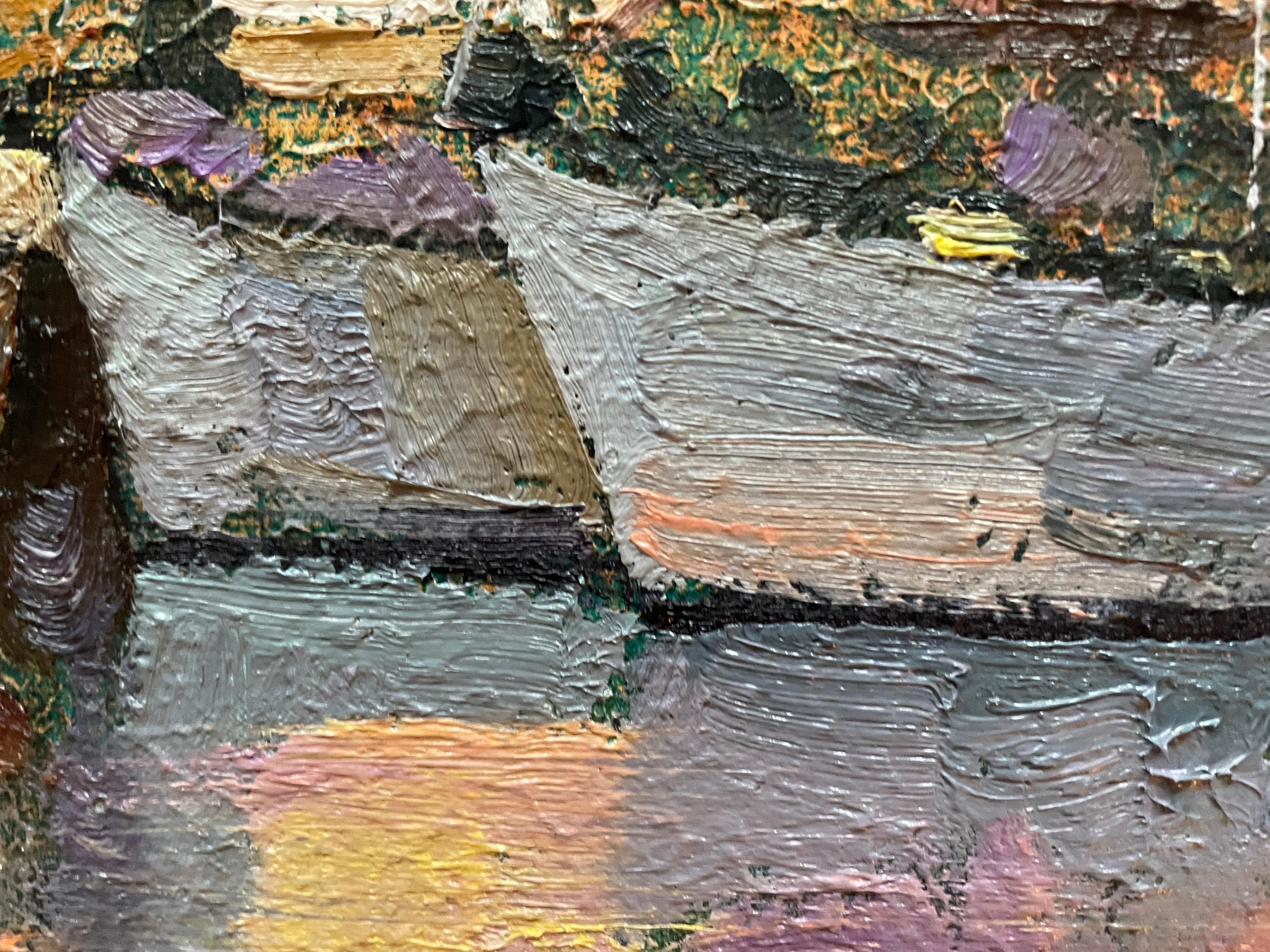été à Bergen" Paysage urbain impressionniste original. Carré .Impasto