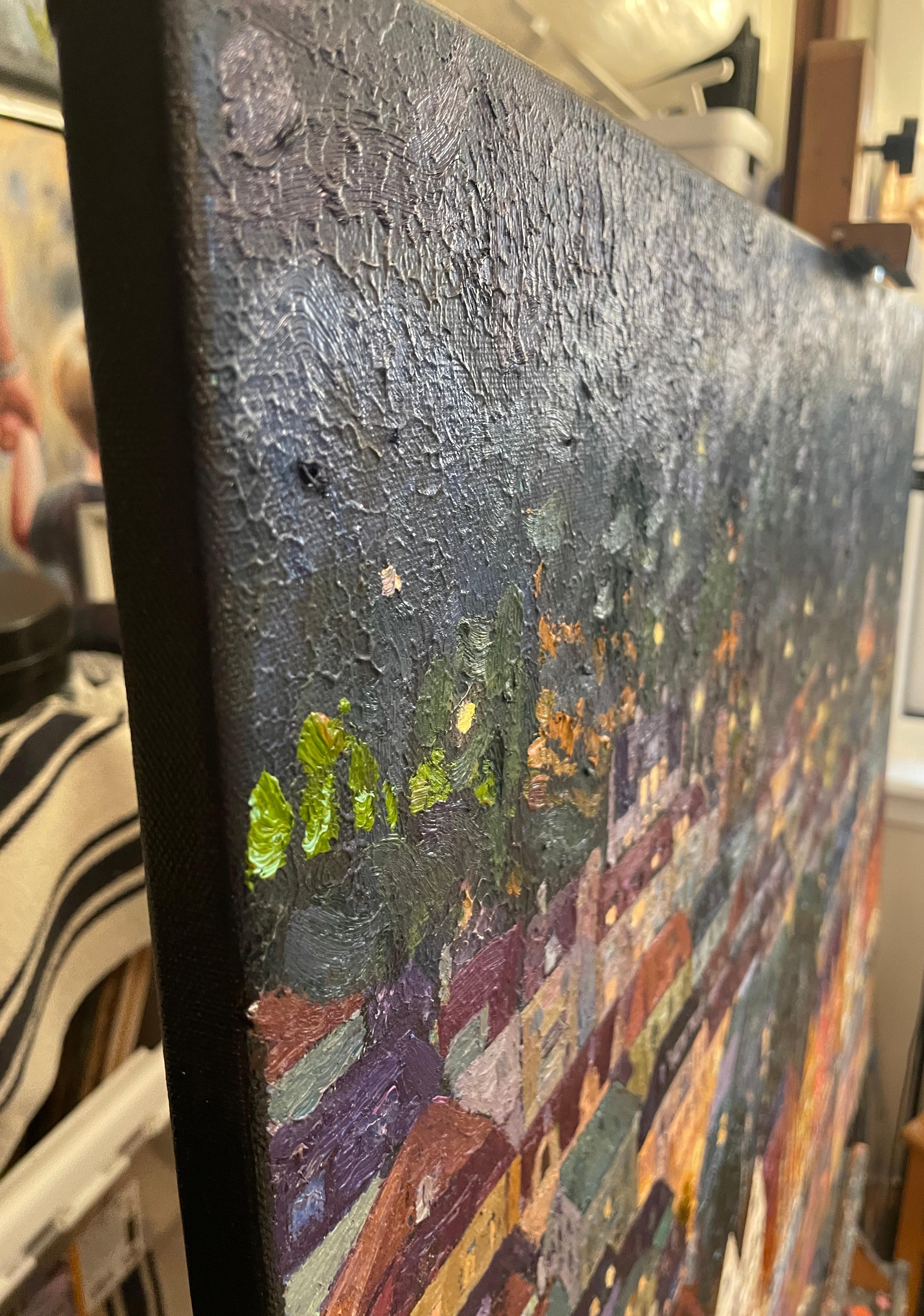"Flying over old Halden" Grand impressionniste original paysage. Impasto