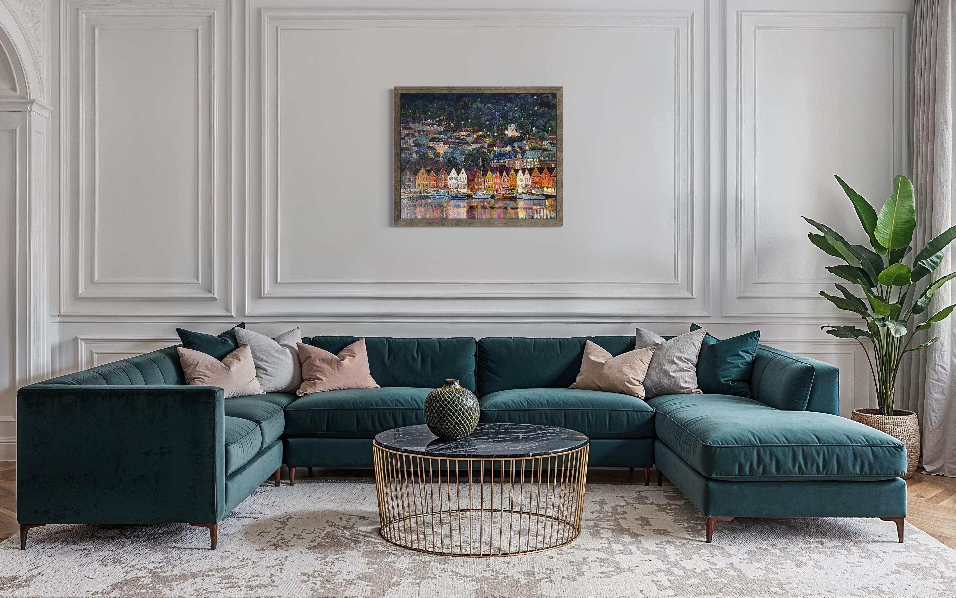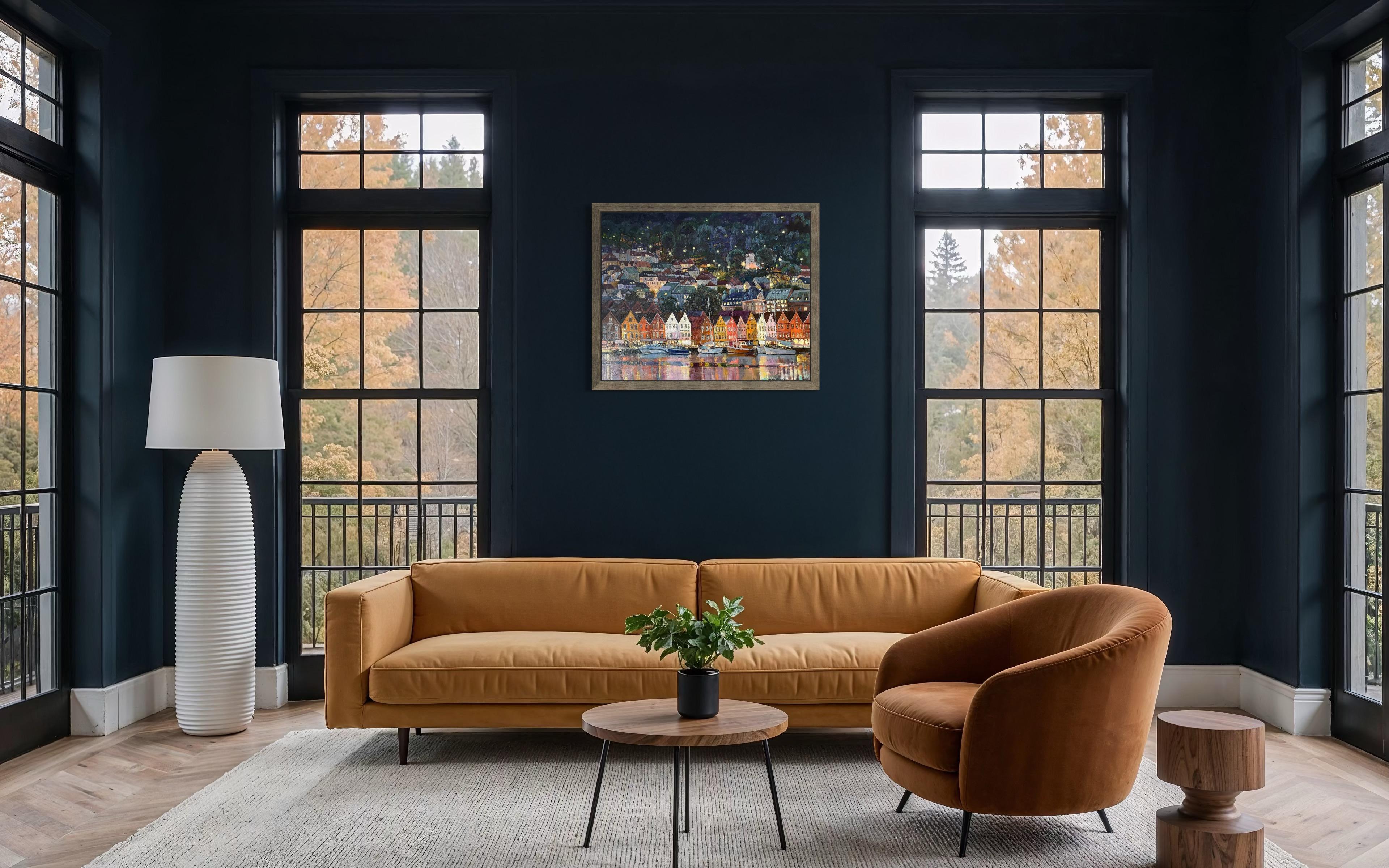Cette œuvre d'art capture de manière saisissante une ville portuaire animée au crépuscule, présentant un ensemble pittoresque de bâtiments colorés le long d'un front de mer paisible. Les toits triangulaires pointus et les façades éclatantes des bâtiments - allant des rouges et oranges chauds aux bleus et blancs froids - se reflètent magnifiquement dans l'eau calme en contrebas. Des bateaux amarrés bordent la voie d'eau, ajoutant au charme et à la sérénité de la scène. Au-dessus, le flanc de la colline est animé par la lueur de lumières subtiles, mettant en valeur le tracé complexe de la ville sous une voûte d'arbres luxuriants. Les détails minutieux des fenêtres et des toits donnent une impression de vivacité et d'anticipation à la soirée. Le mélange harmonieux de la beauté naturelle et de la précision architecturale donne une profondeur atmosphérique envoûtante, invitant les spectateurs à découvrir l'allure sereine de cette ville portuaire enchanteresse. Les œuvres d'art se distinguent par leur palette de couleurs vives et leur souci du détail, ce qui en fait une représentation captivante de la vie côtière.
